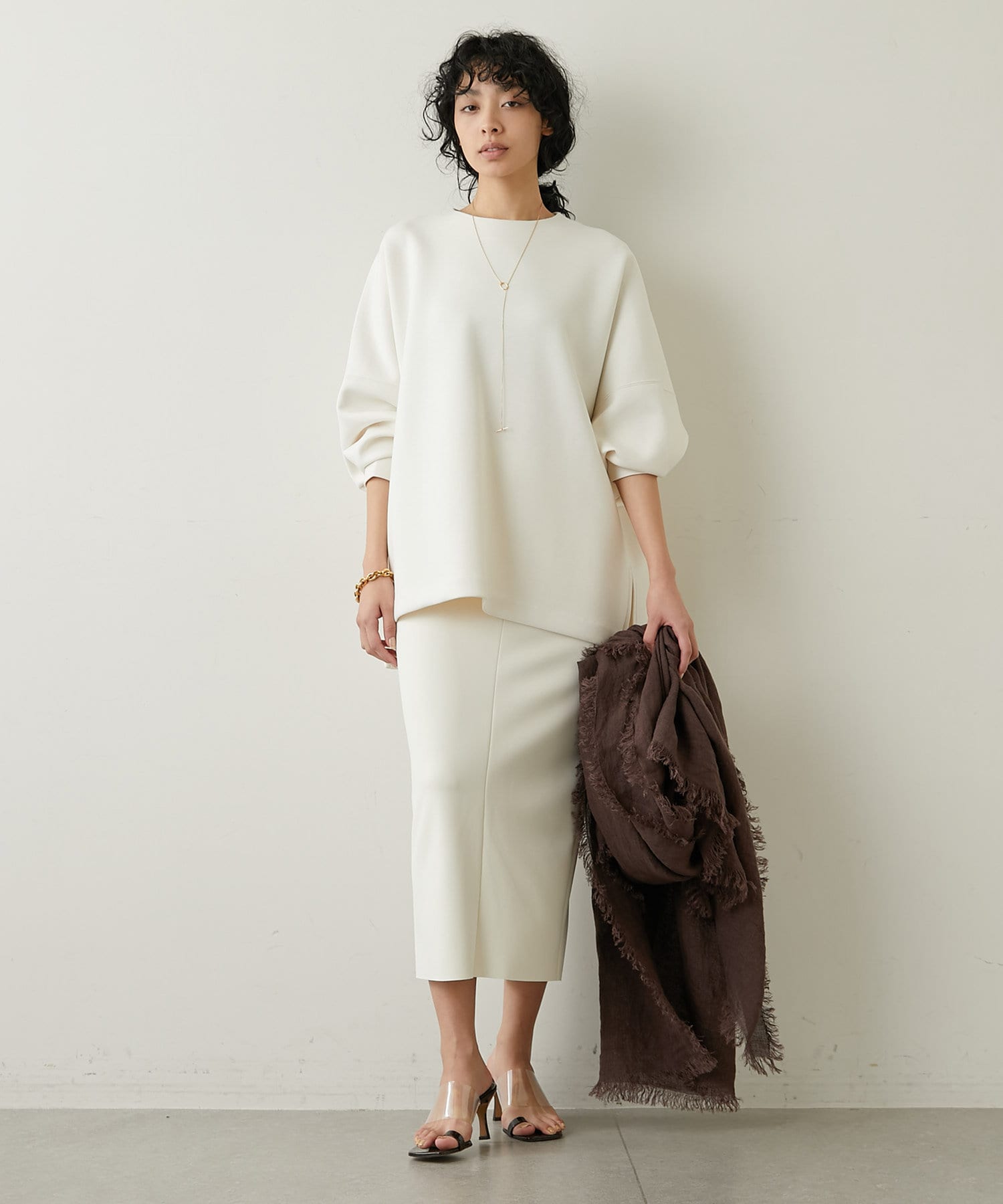 穿きやすさと、ラインの綺麗さを兼ね備えたスカート。1枚仕立てなのに身体の肉感を拾いすぎず、スッキリはけます。丈は長すぎず短すぎないので小柄さんにもおすすめです。