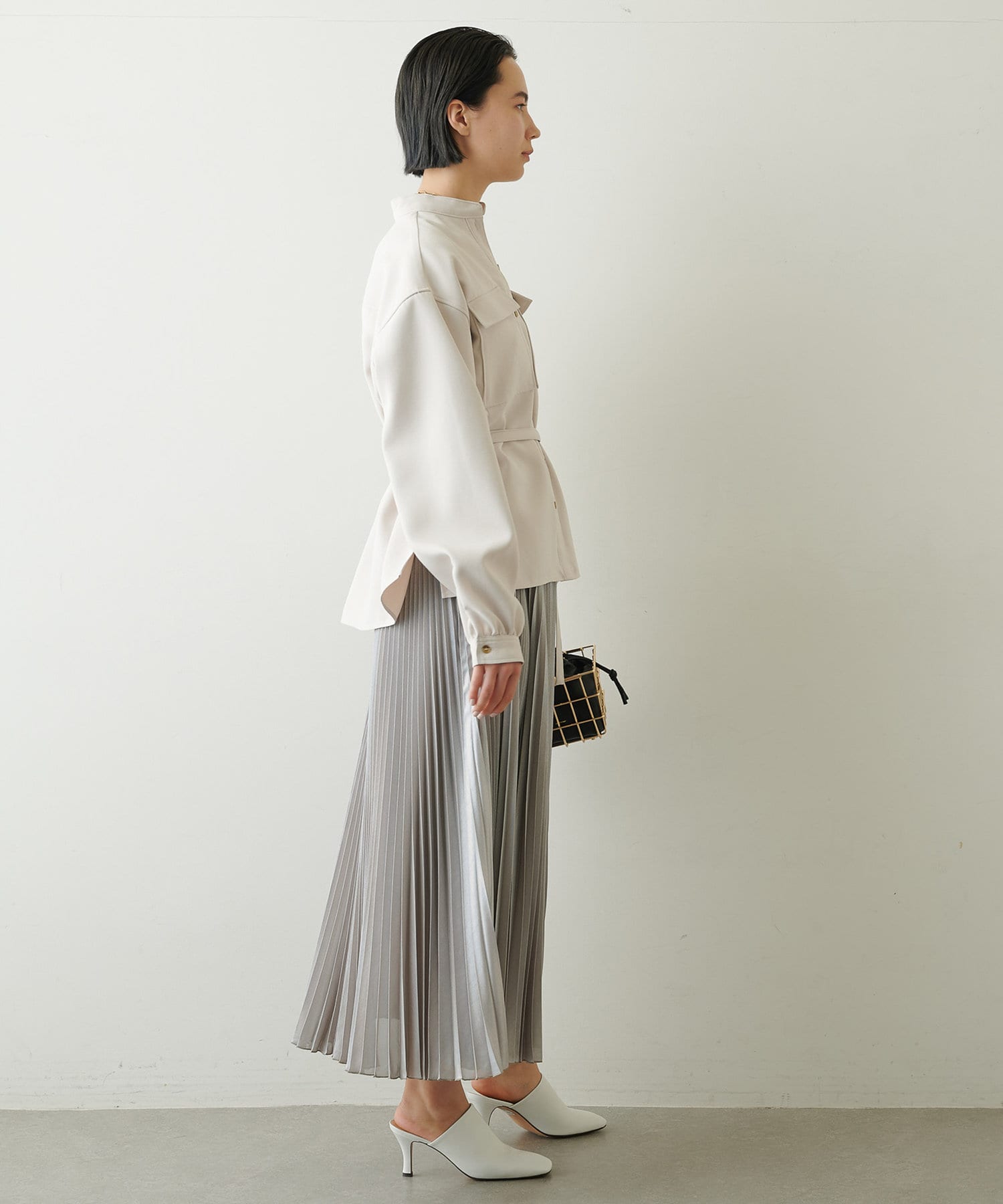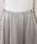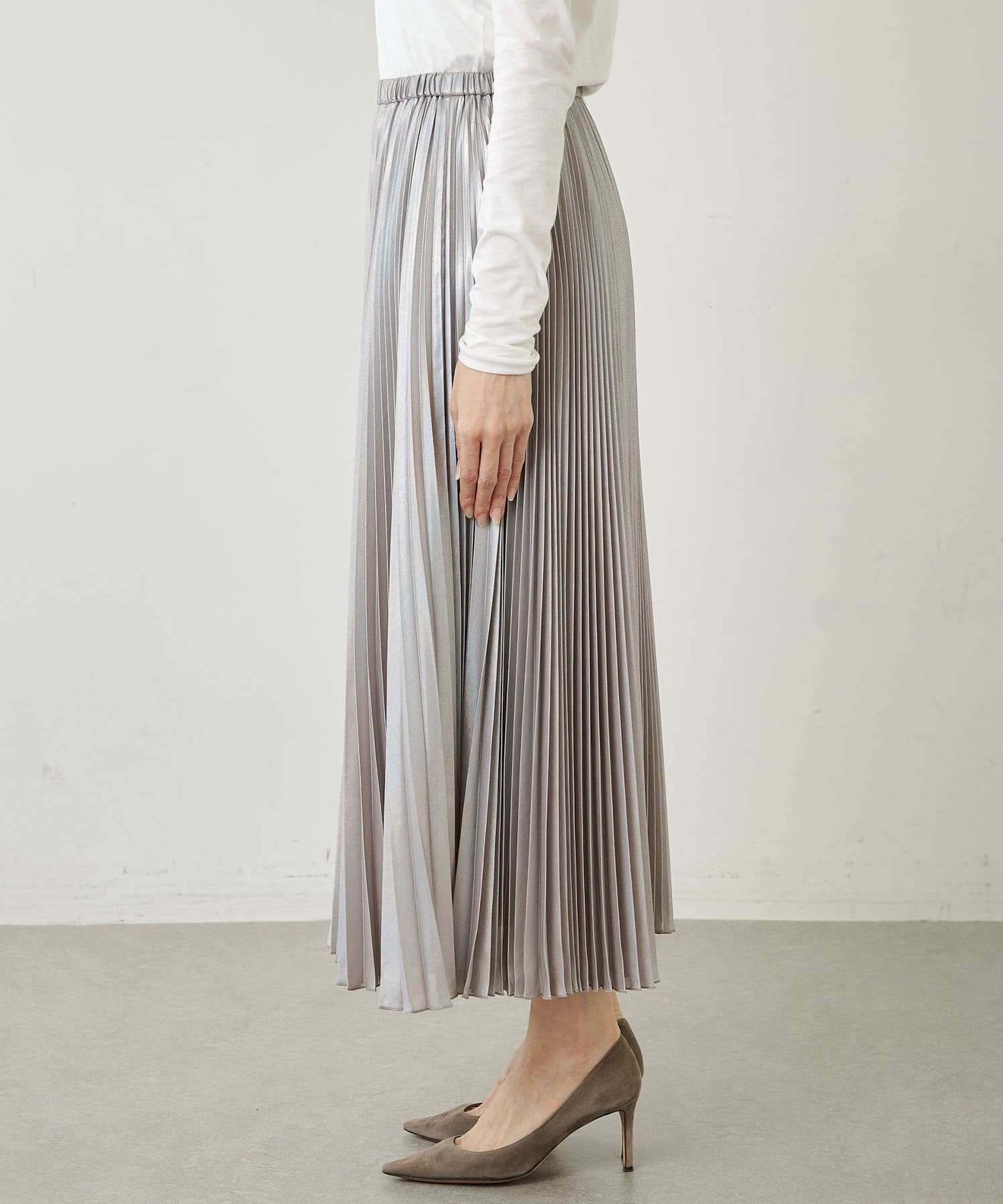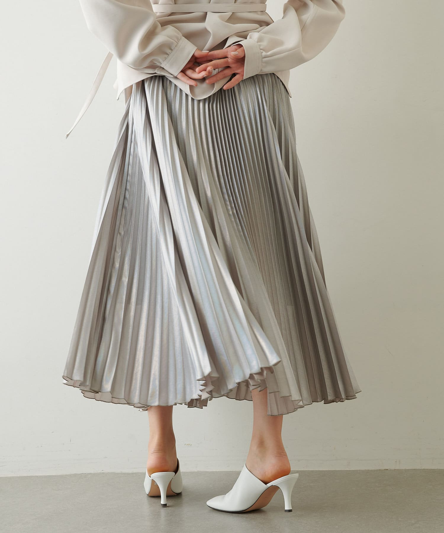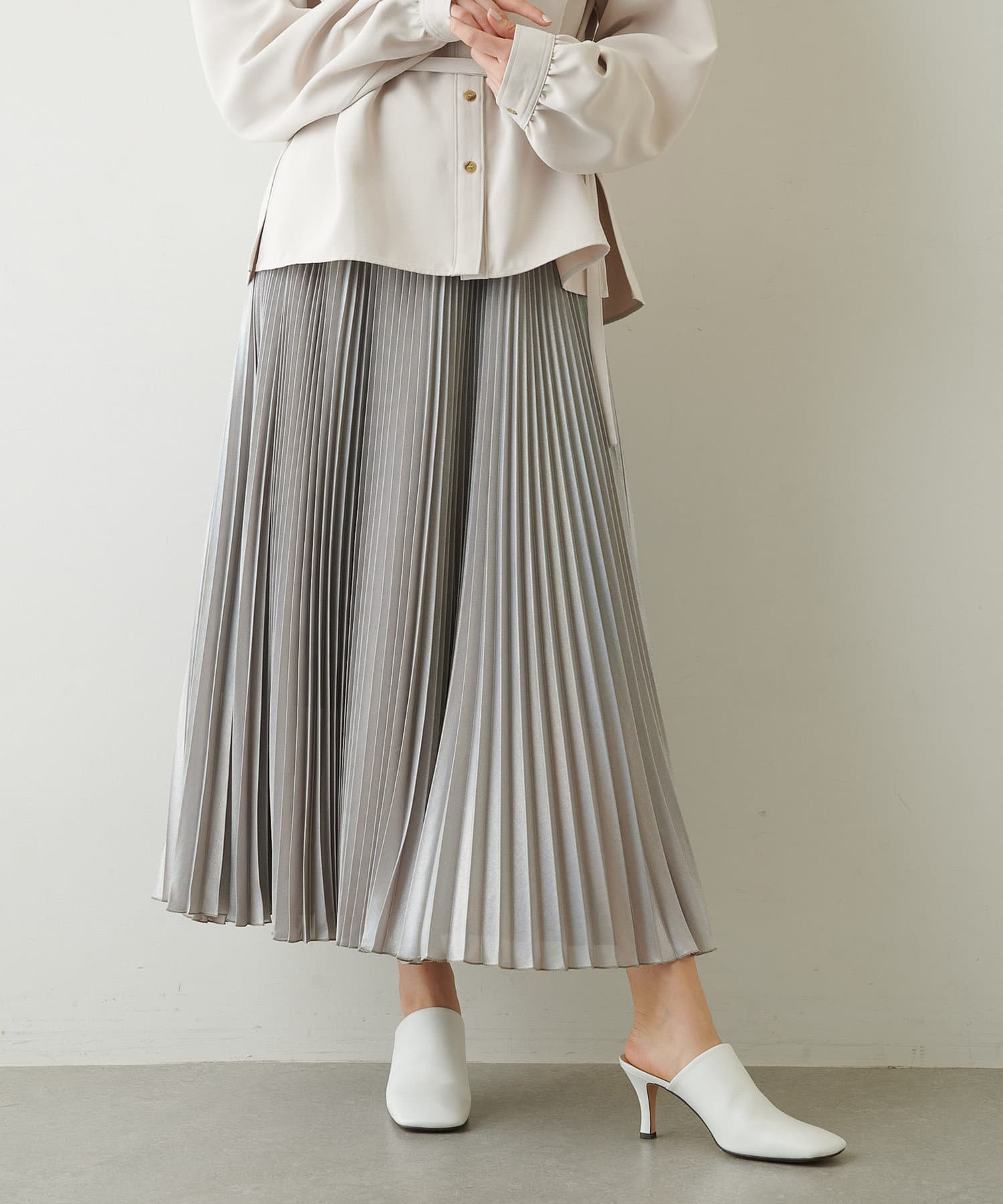 シャイニーな素材感がポイントのプリーツスカート。プリーツがとても細かいので、腰張りが気になる私でもきれいに履けました!