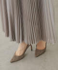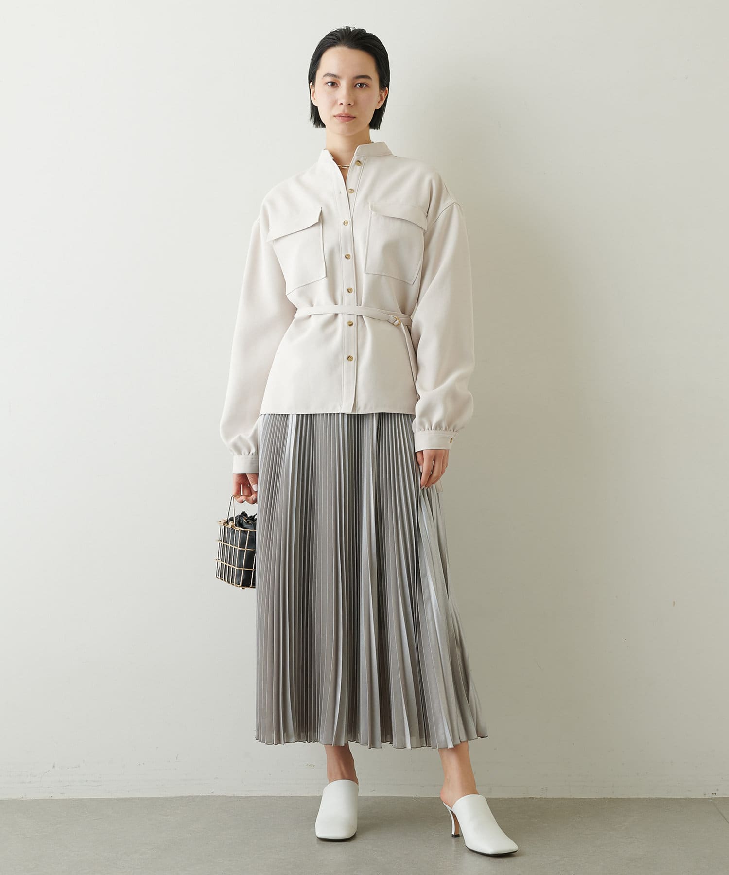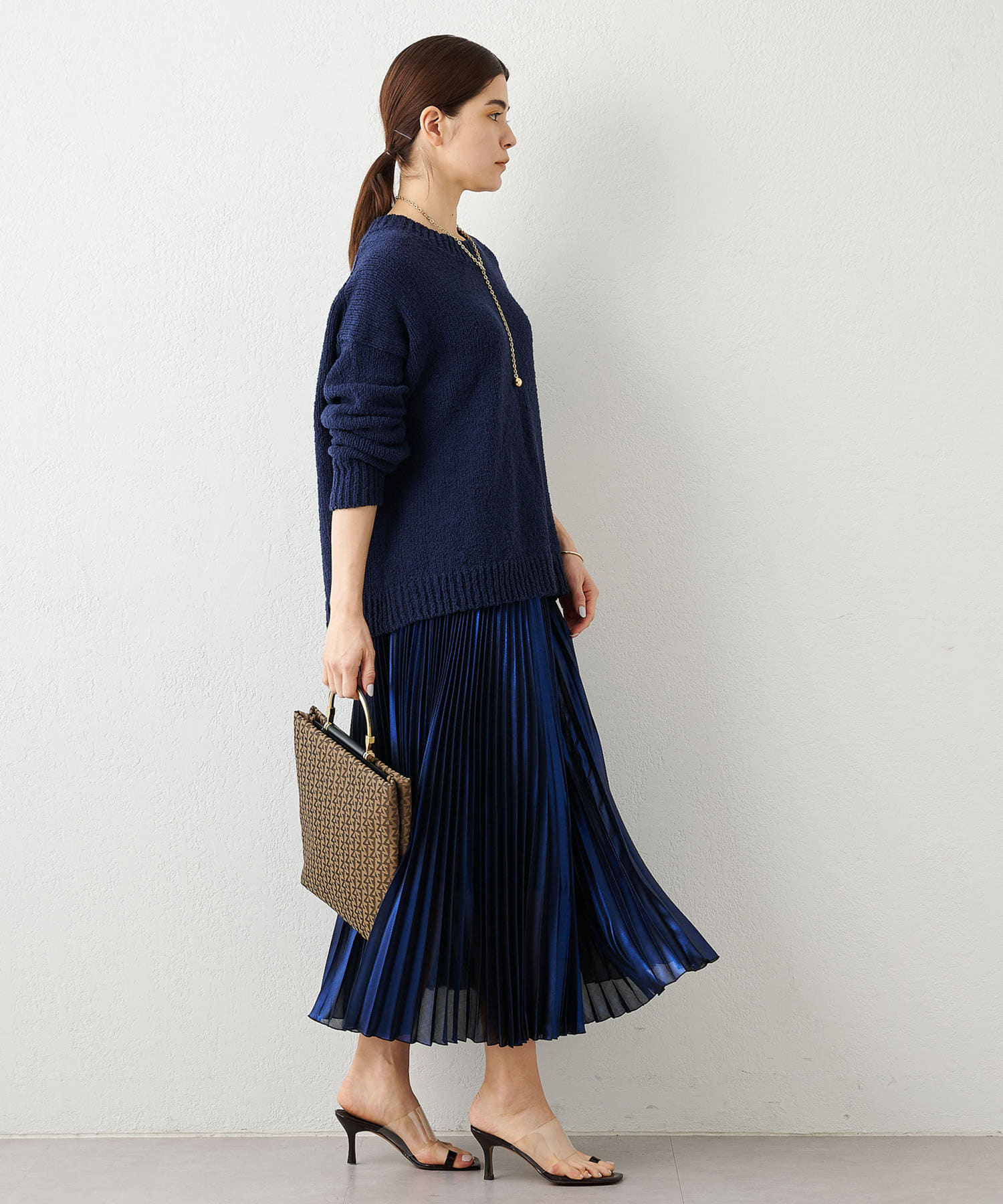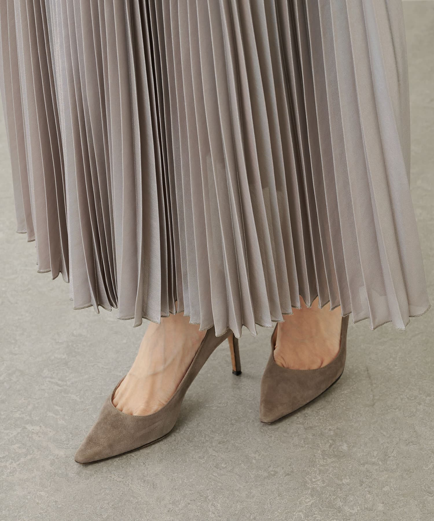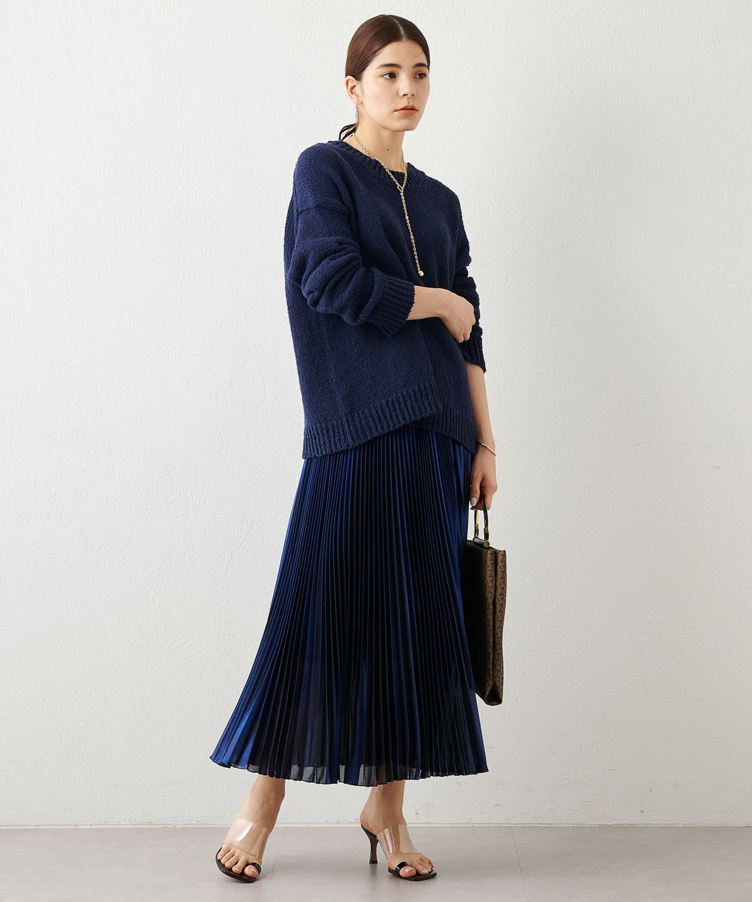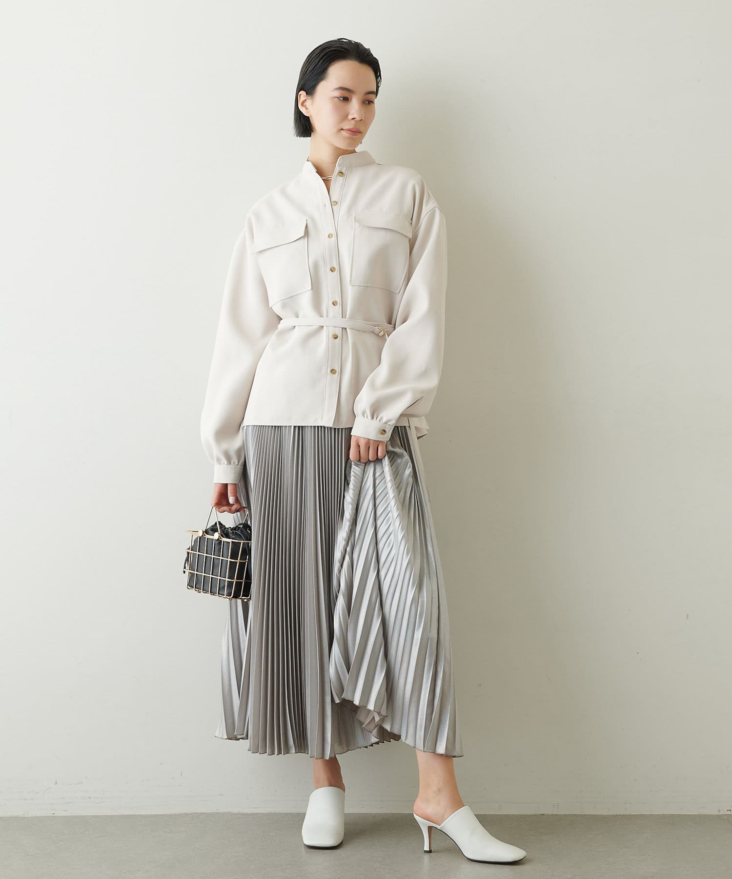 シャイニーな素材感がポイントのプリーツスカート。プリーツがとても細かいので、腰張りが気になる私でもきれいに履けました!