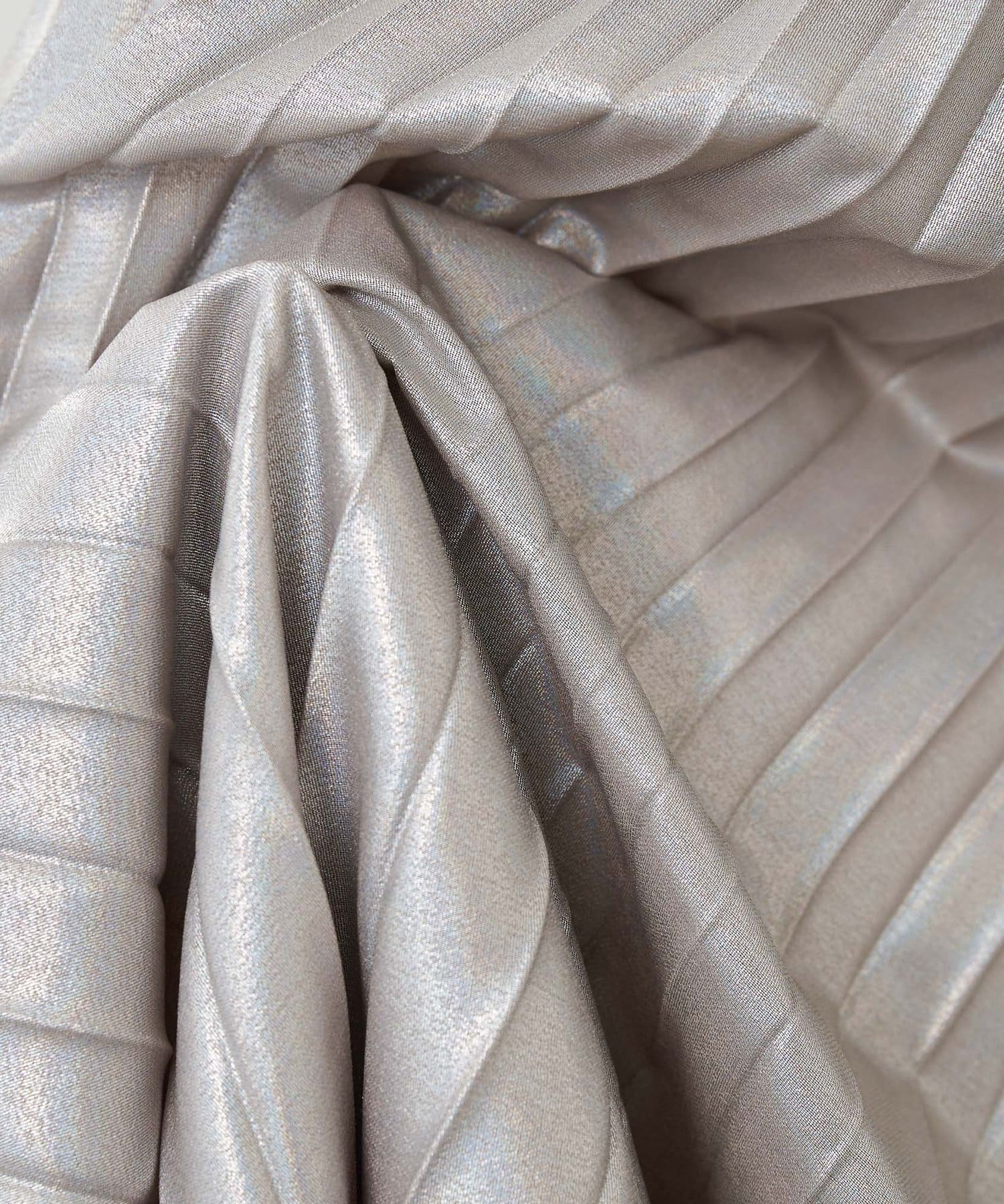 ■箔プリントならではのツヤ感がと、細やかなプリーツが上品な雰囲気の一着。