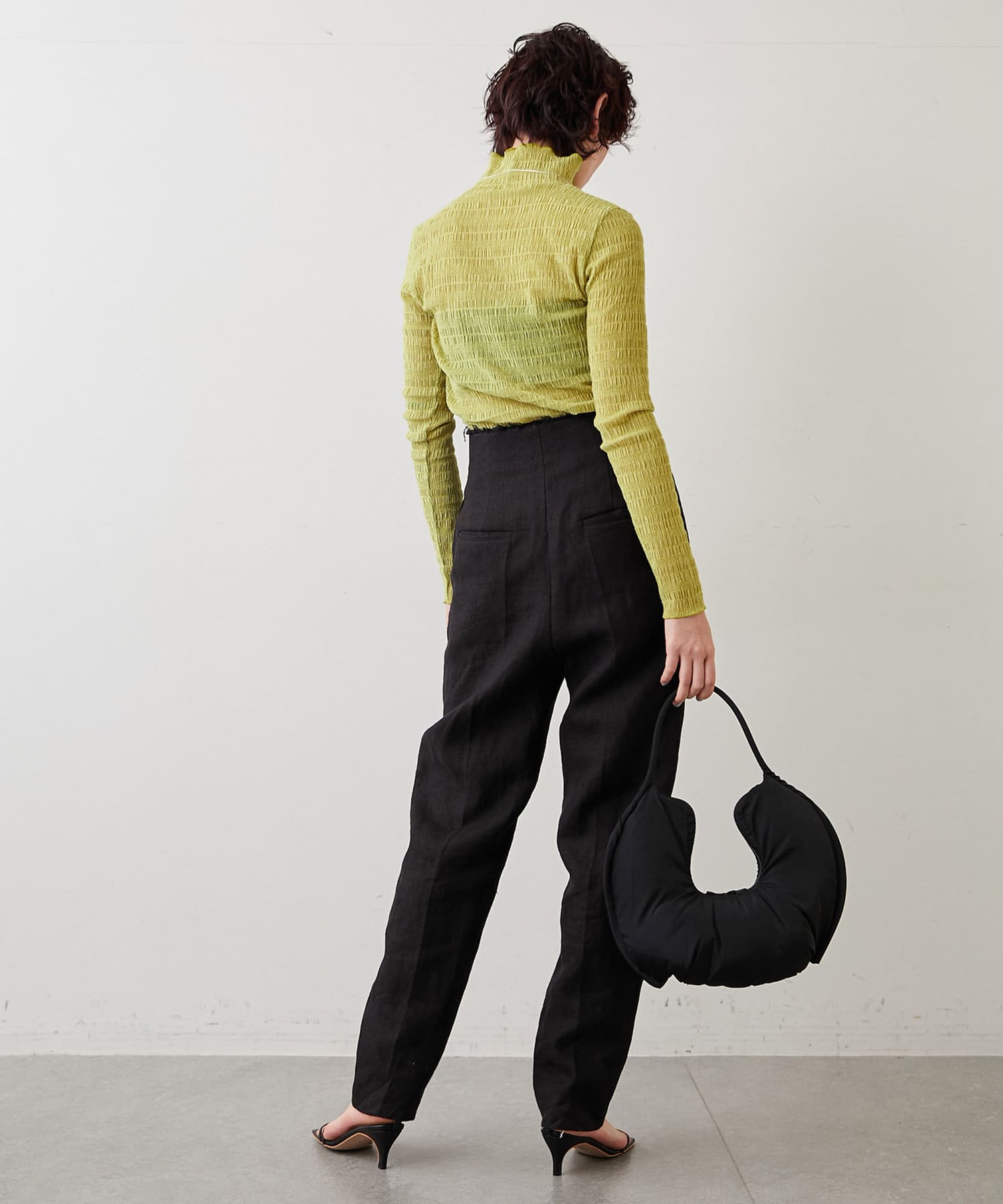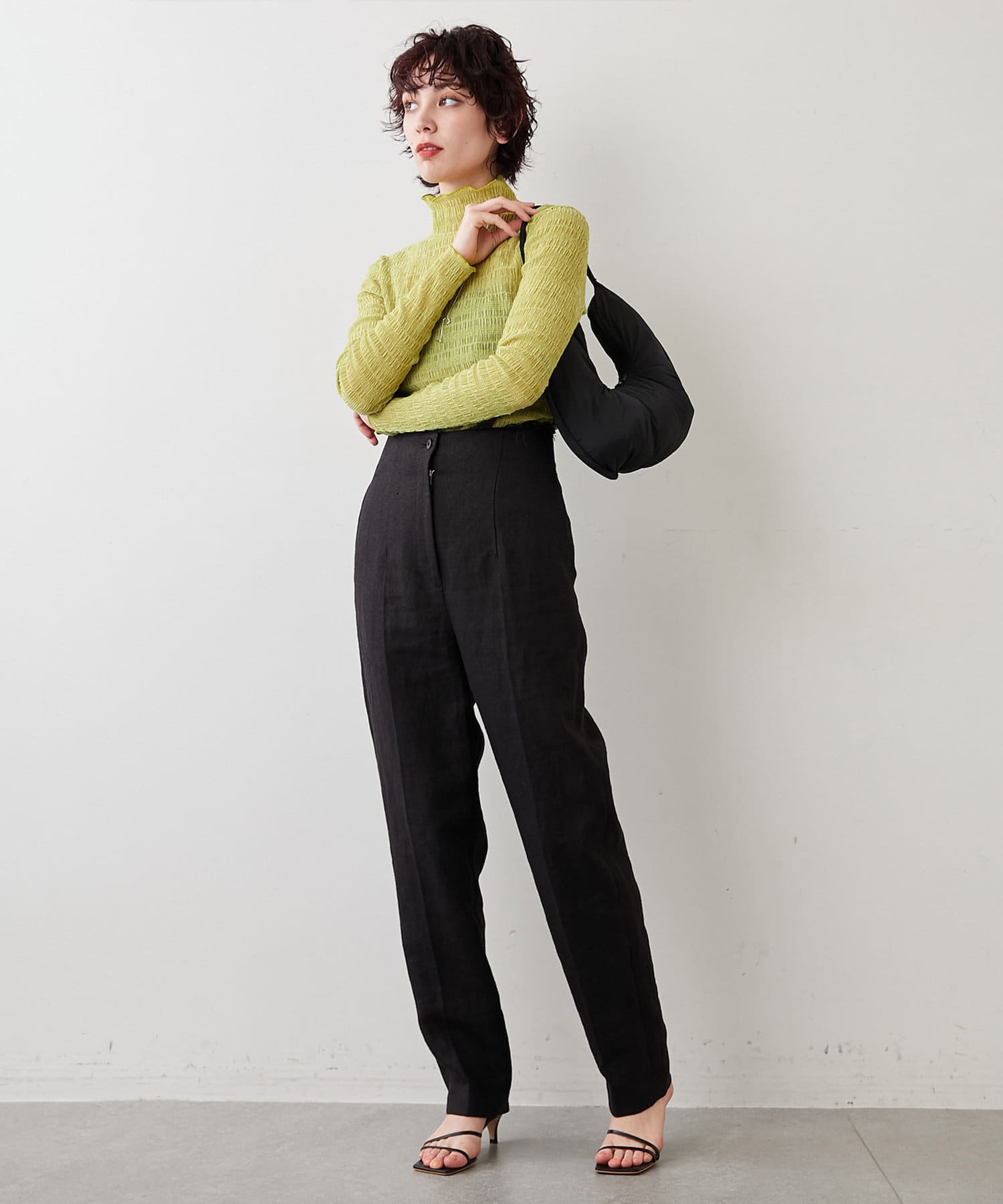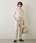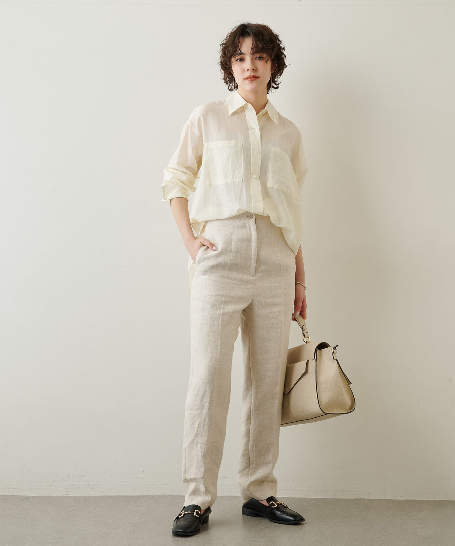 少し厚みのあるリネン素材なので初春からお楽しみ頂けるパンツです。私と同じ153センチくらいの背丈の方だとヒールでは丁度いい長さですが、フラットシューズが多い方には裾直しがオススメです。