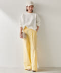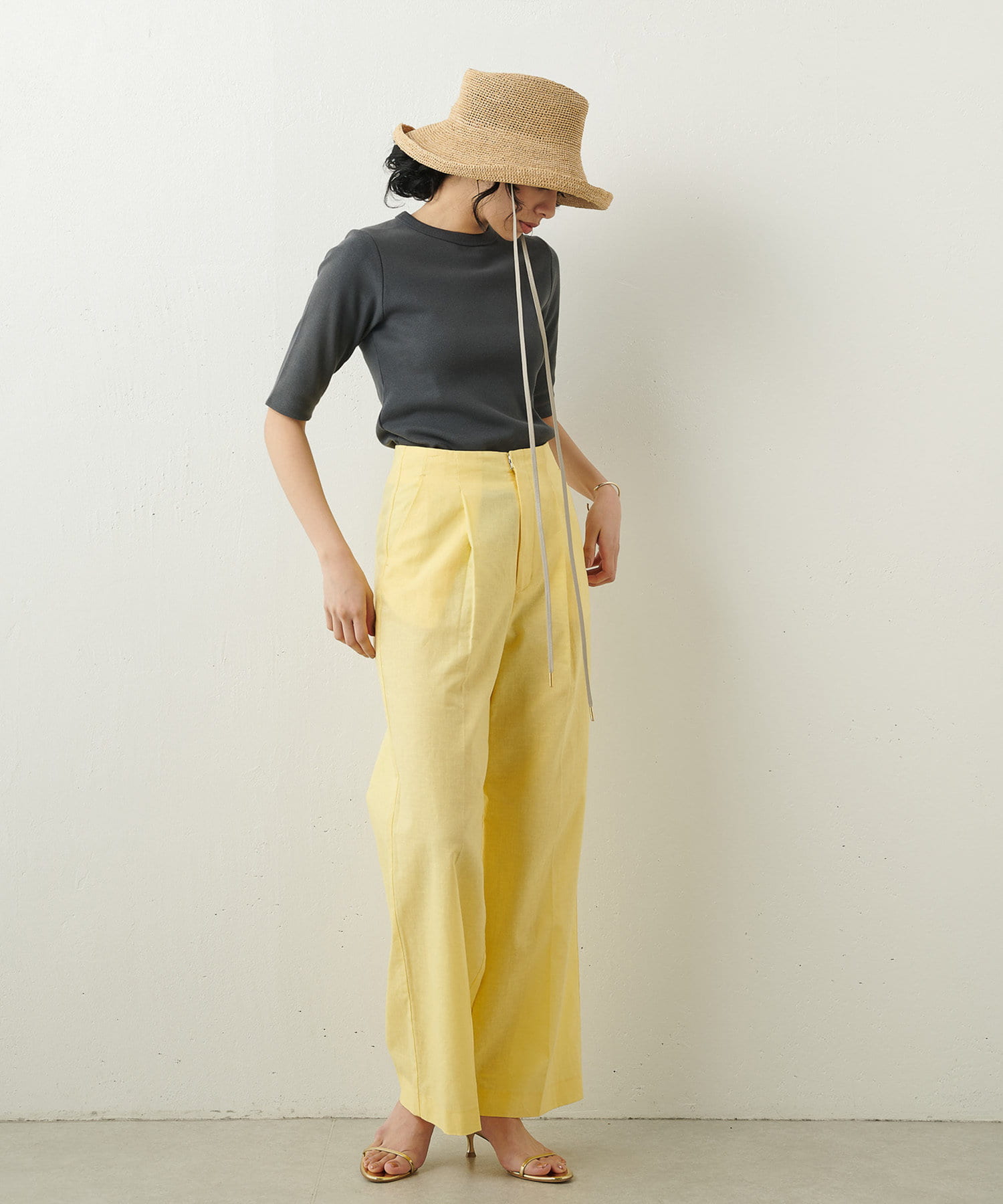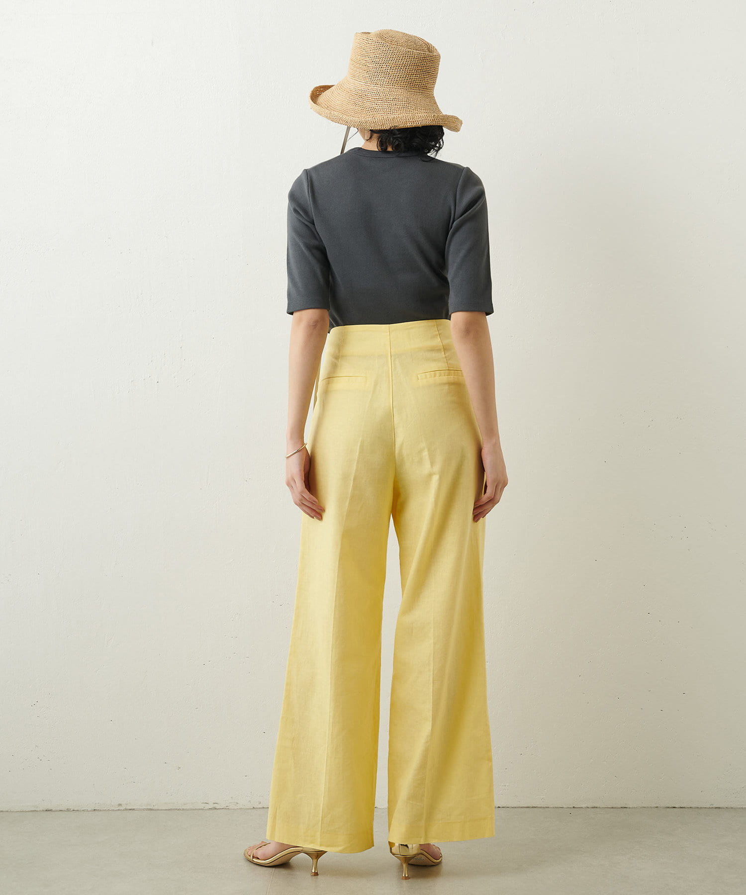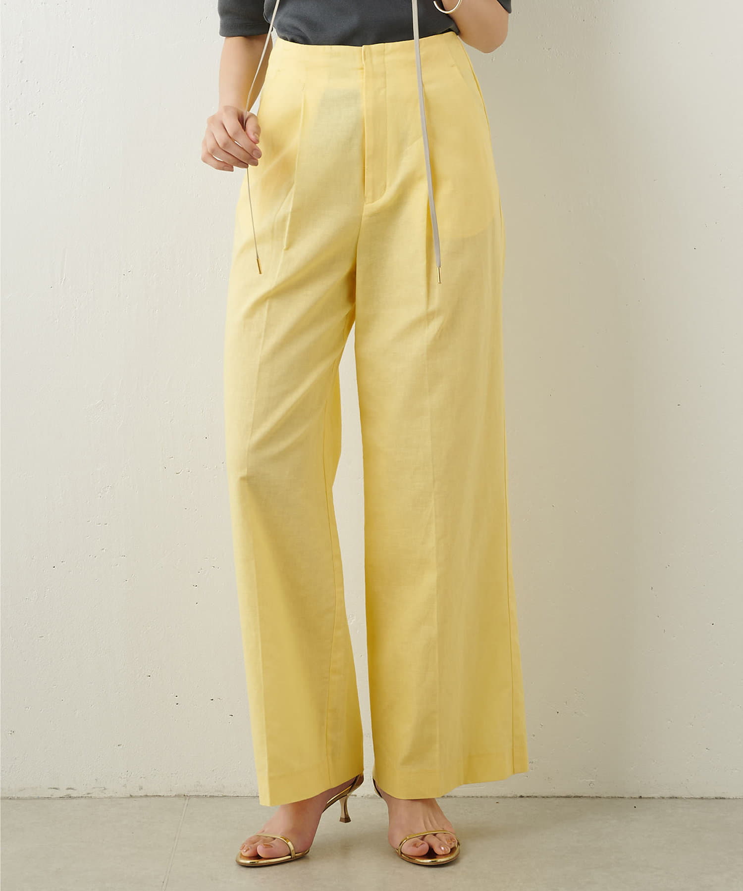 ハリ感のあるコットンリネンカラーパンツ。足を綺麗に見せてくれるワイドシルエットでセンタープレスがきちんと感をプラスしてくれます。普段のスタイリングに取り入れるだけで春らしいスタイリングが楽しめます。