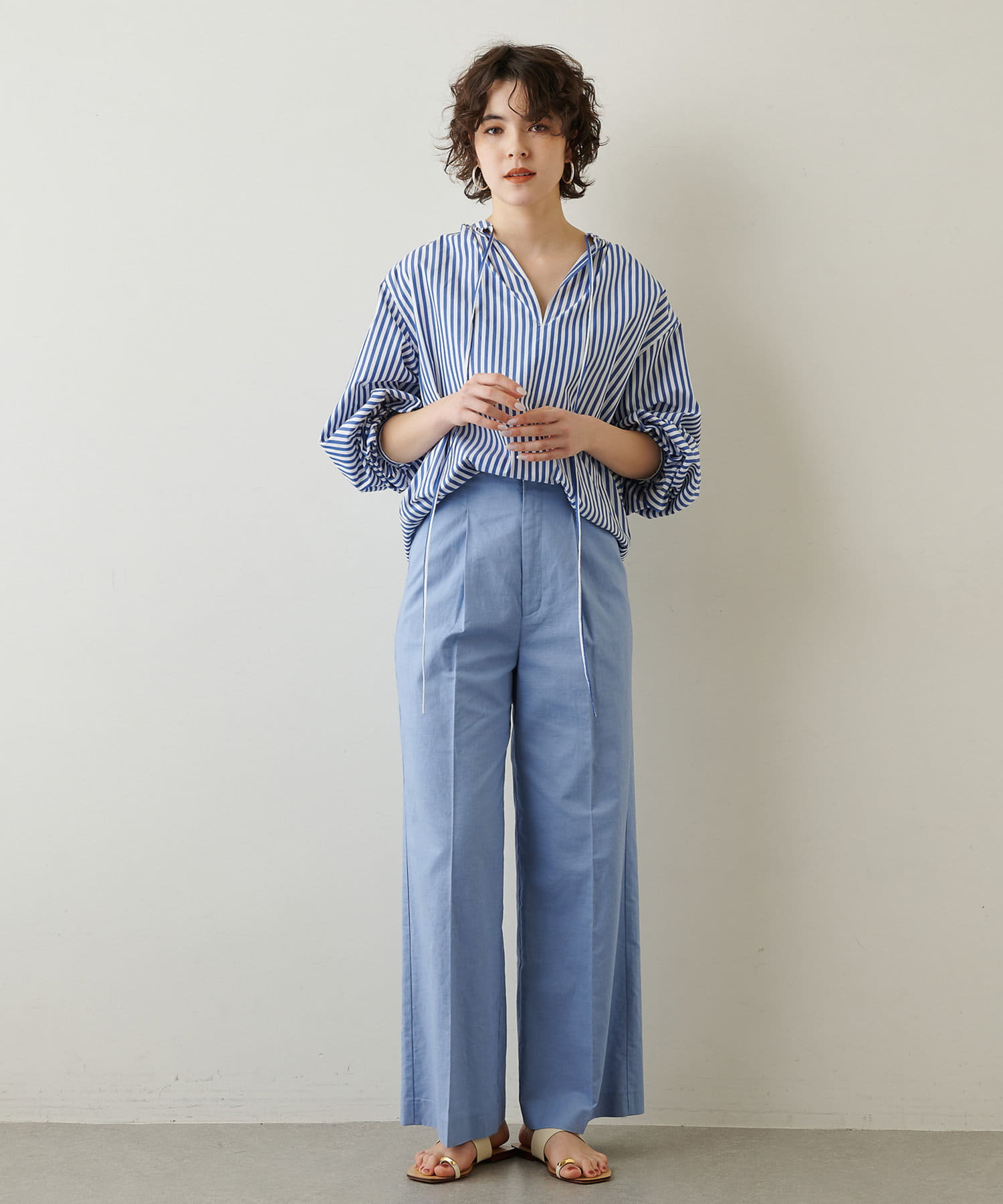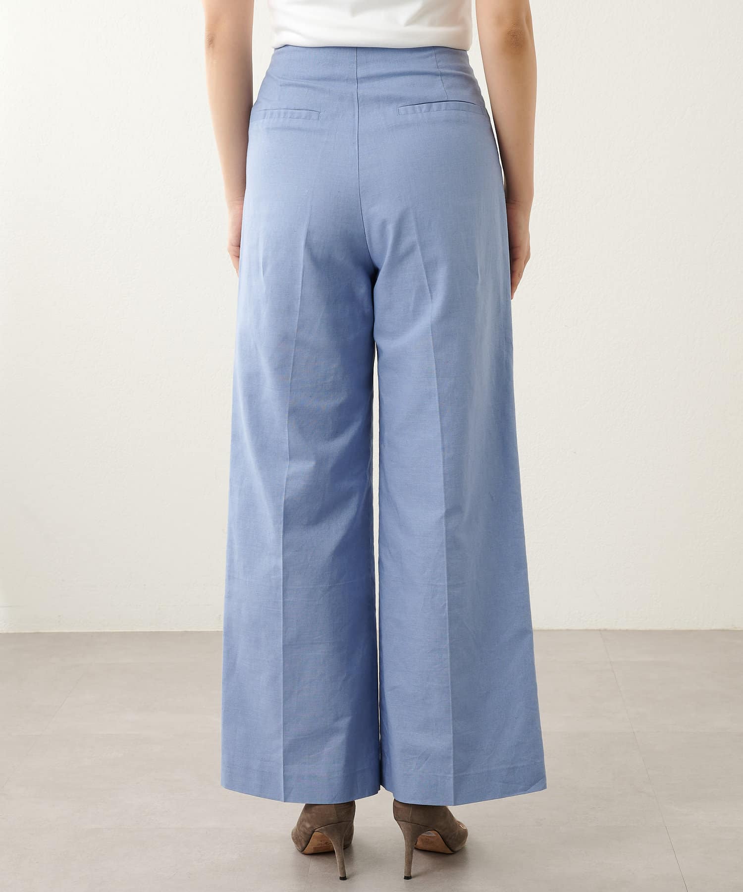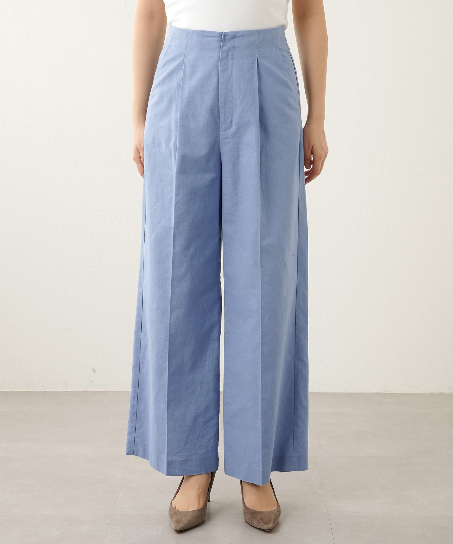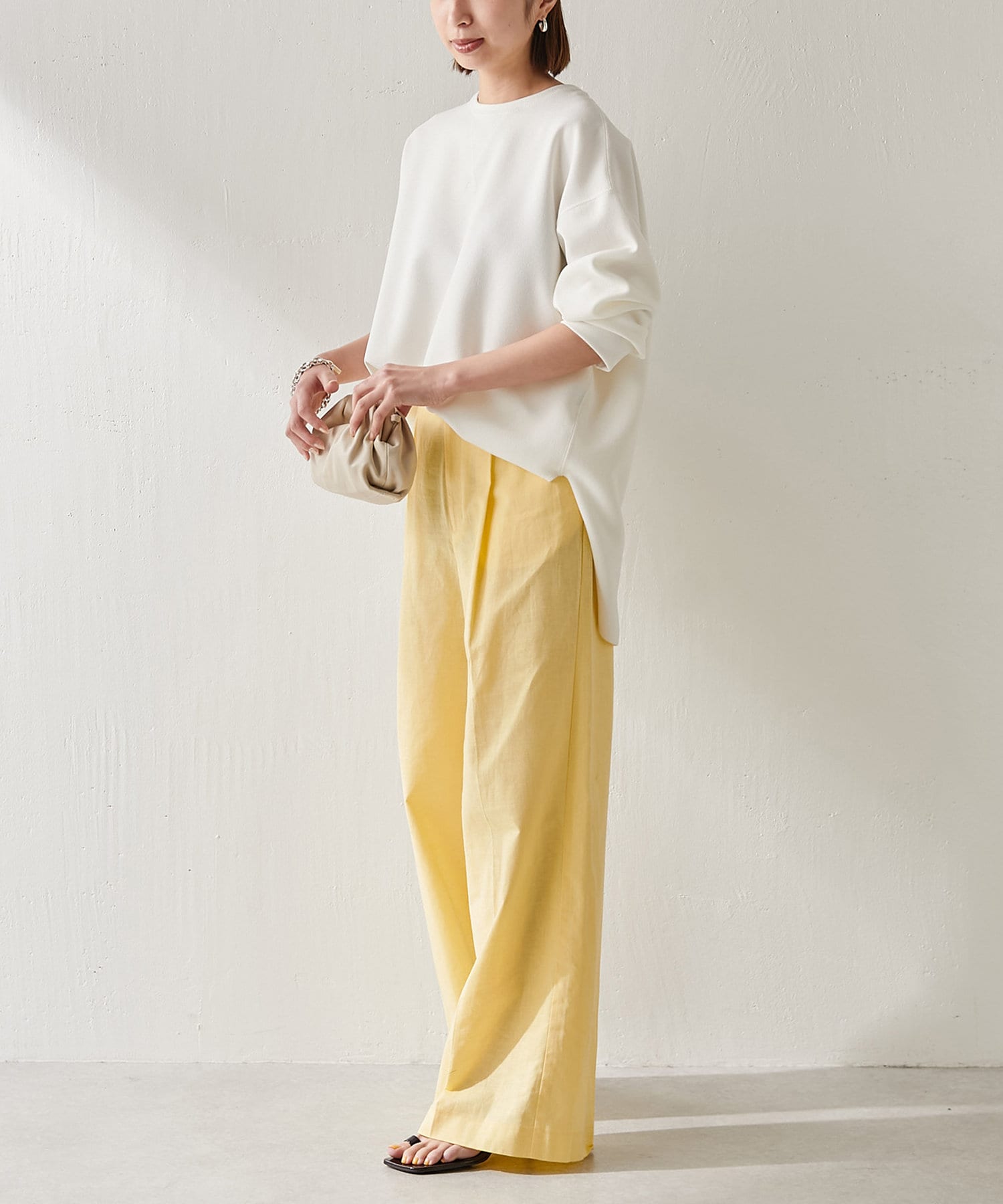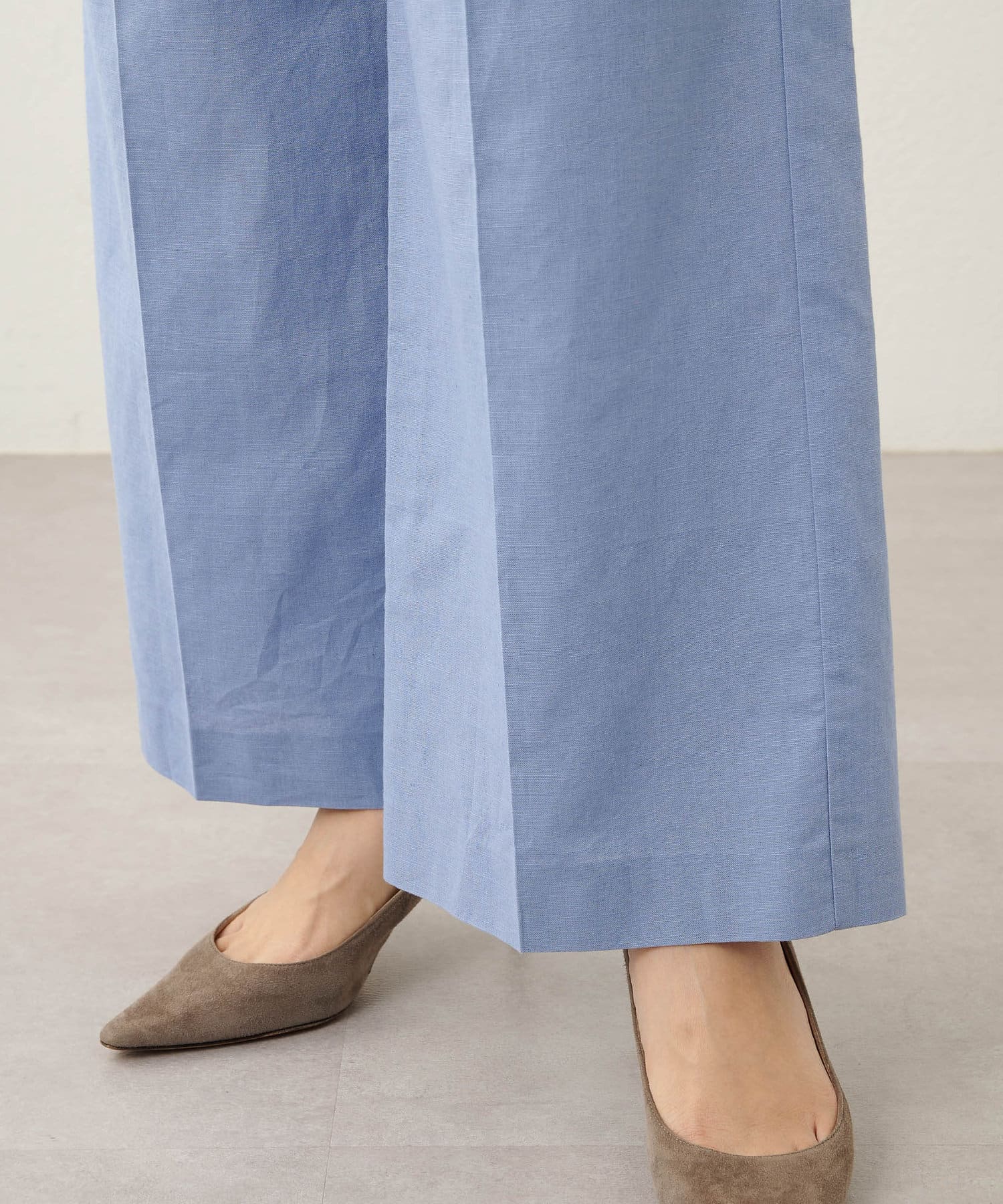 ■麻混のナチュラルな素材ながら、太すぎないワイドシルエットにセンタープレスを入れきちんと感もプラス。