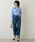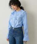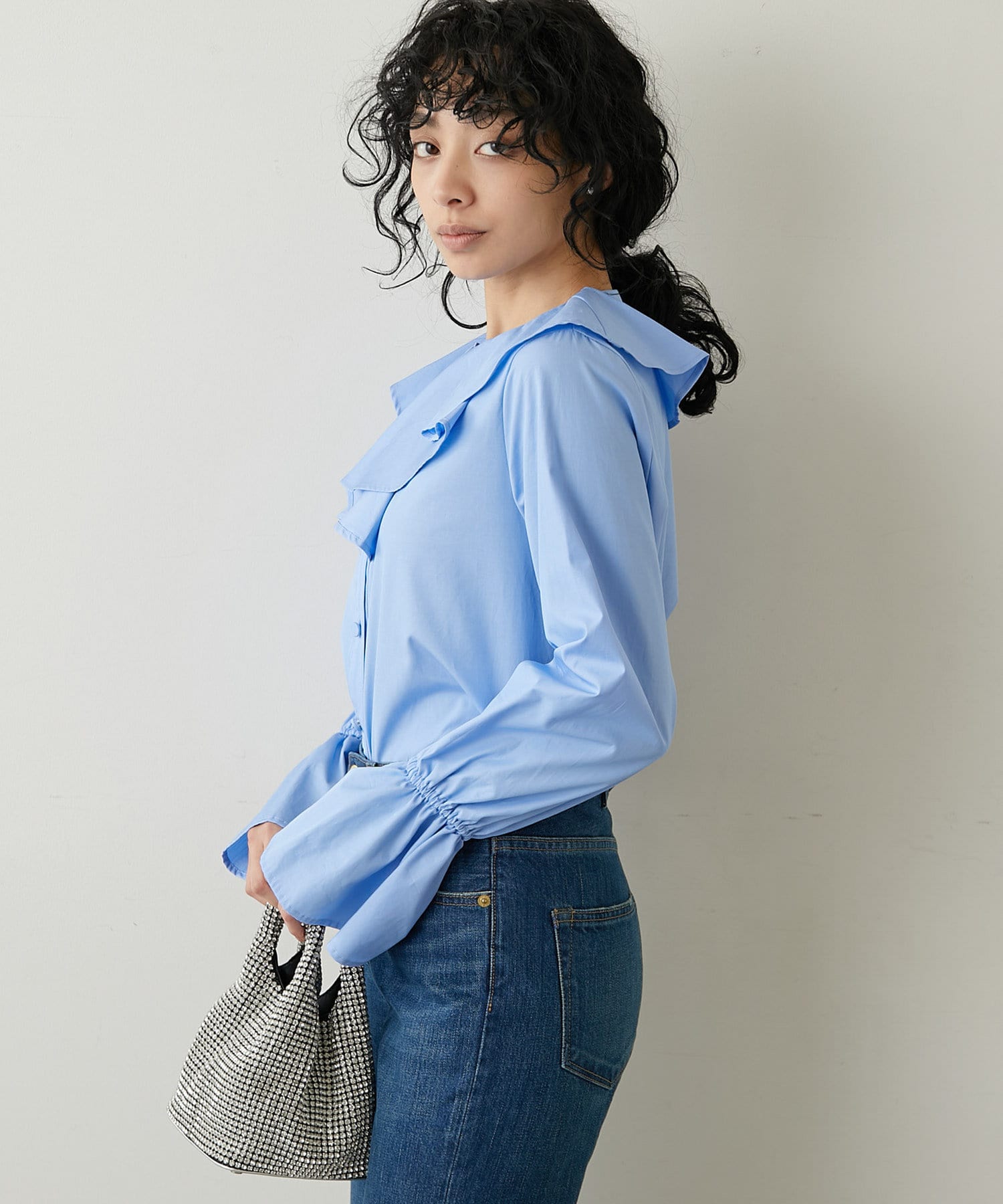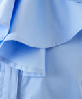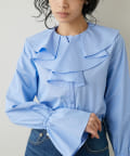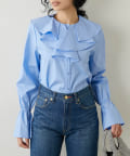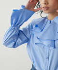 フロントと袖のフリルデザインが目を惹くブラウスです。シンプルなボトムを合わせてもコーディネートが一枚で着映えます。サックスブルーのカラーが甘さを抑え、大人の女性も合わせやすいです。フロントのフリルはそこまで立体感では無いため華やかすぎないです。