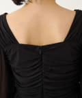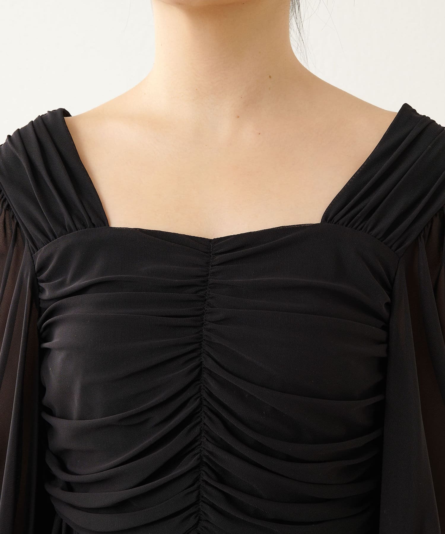 ■ドレープ感のある柔らかいチュール素材を使用し、ボリュームが出すぎずすっきりとしたシルエットに仕上げた一着。