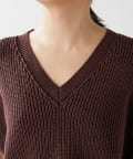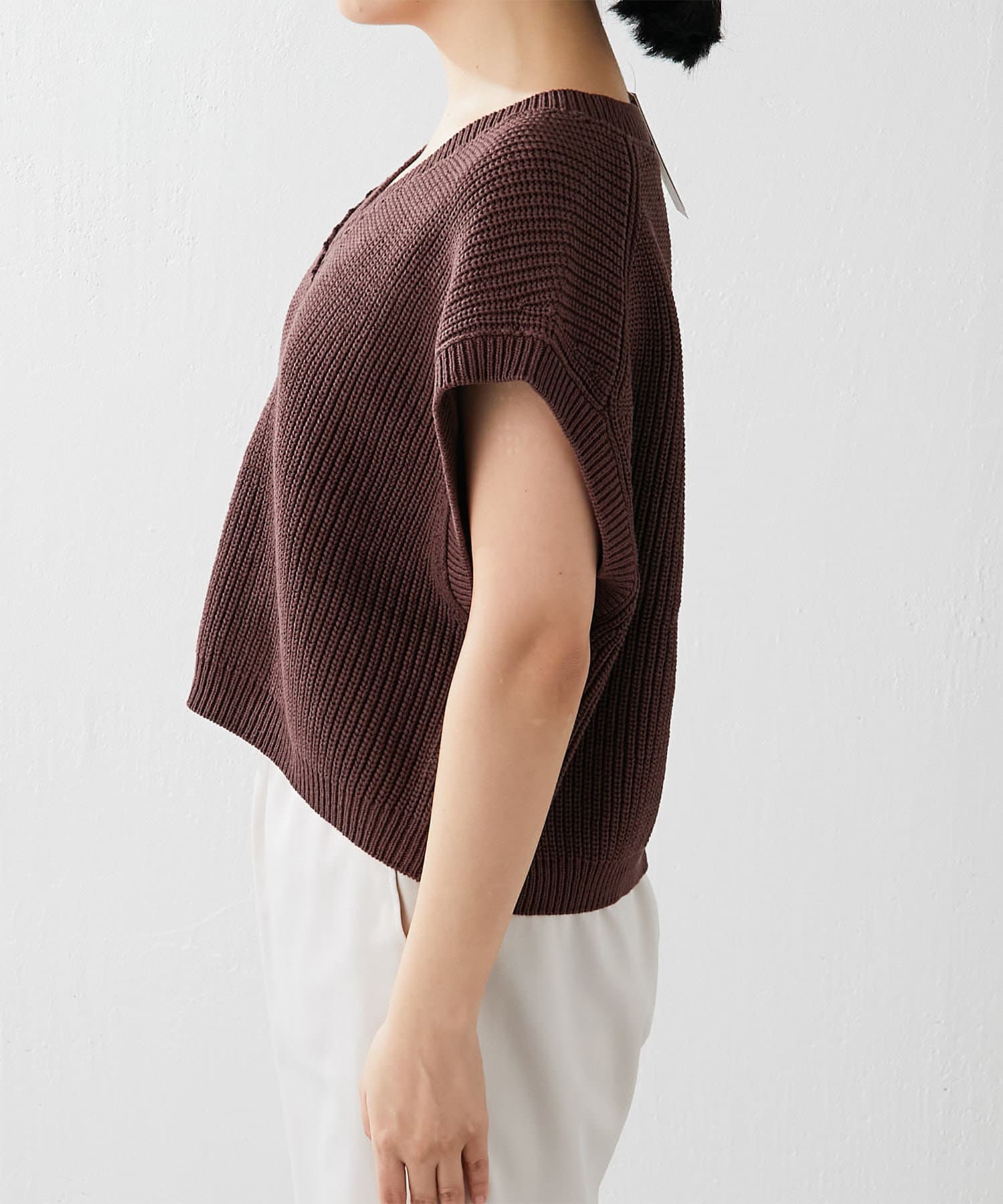 ■程よい開きのVネックと肩を覆うショルダーで、フレンチスリーブニットとして一枚でも楽しめるデザイン。
