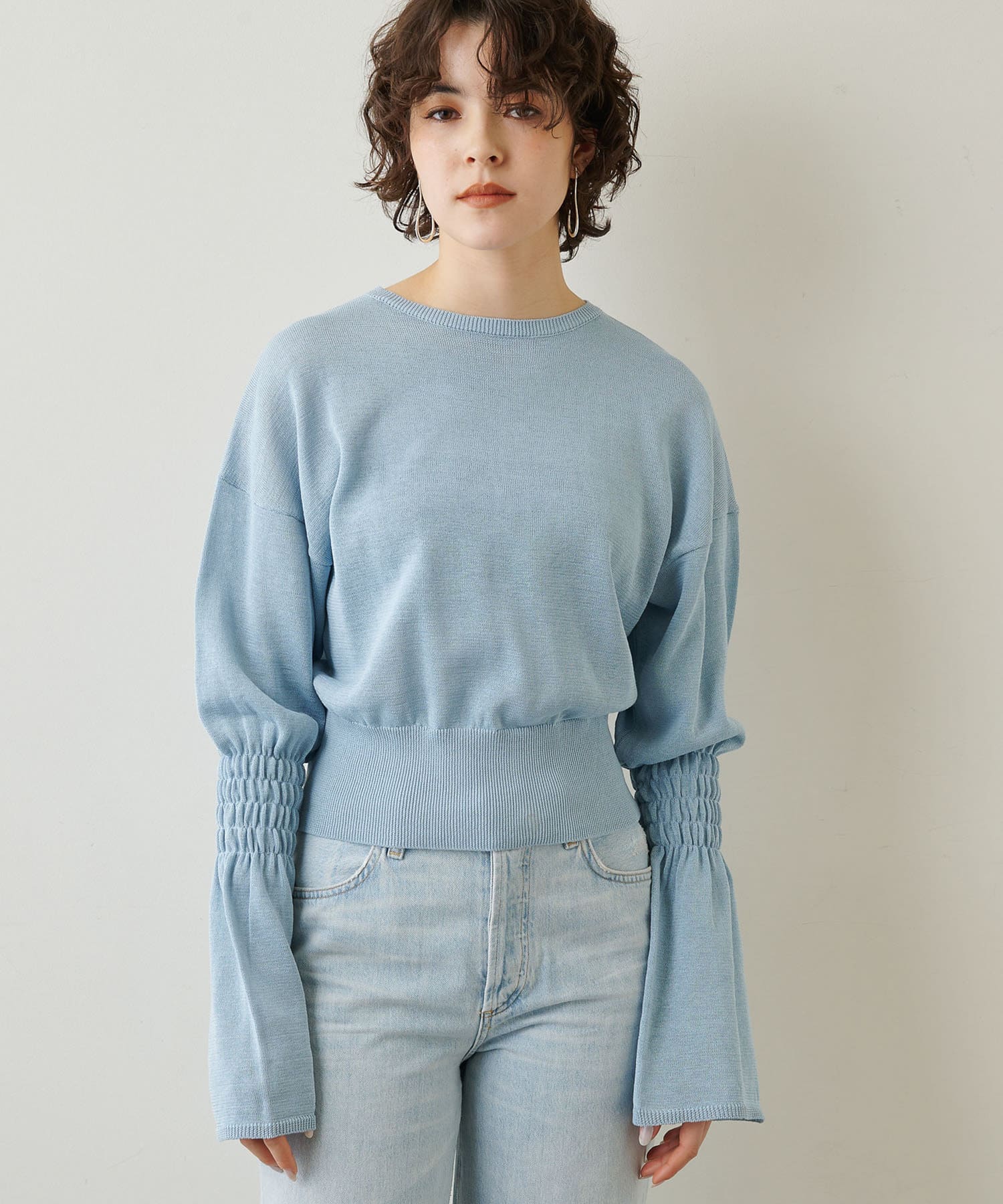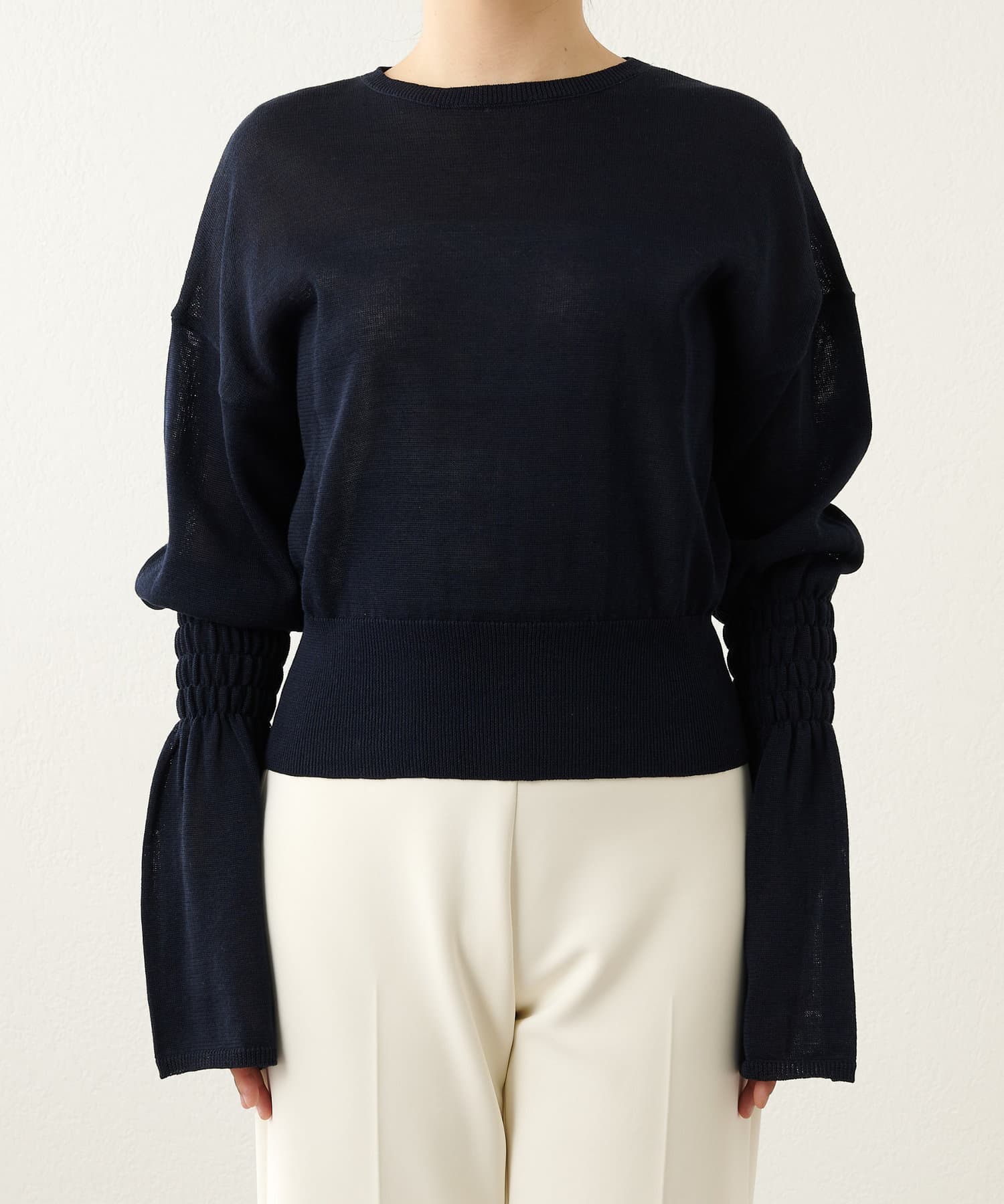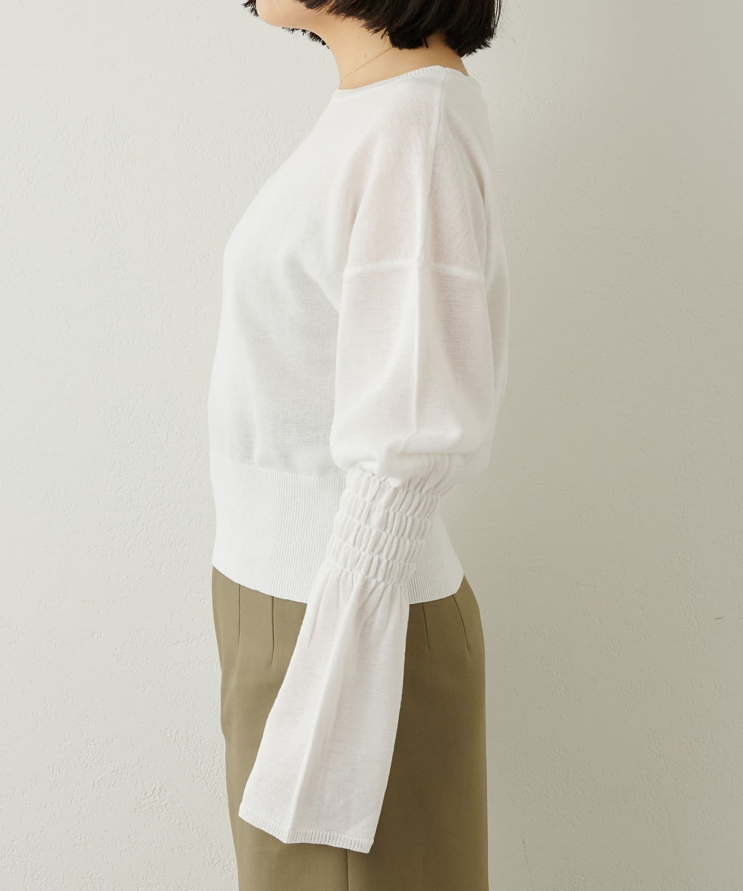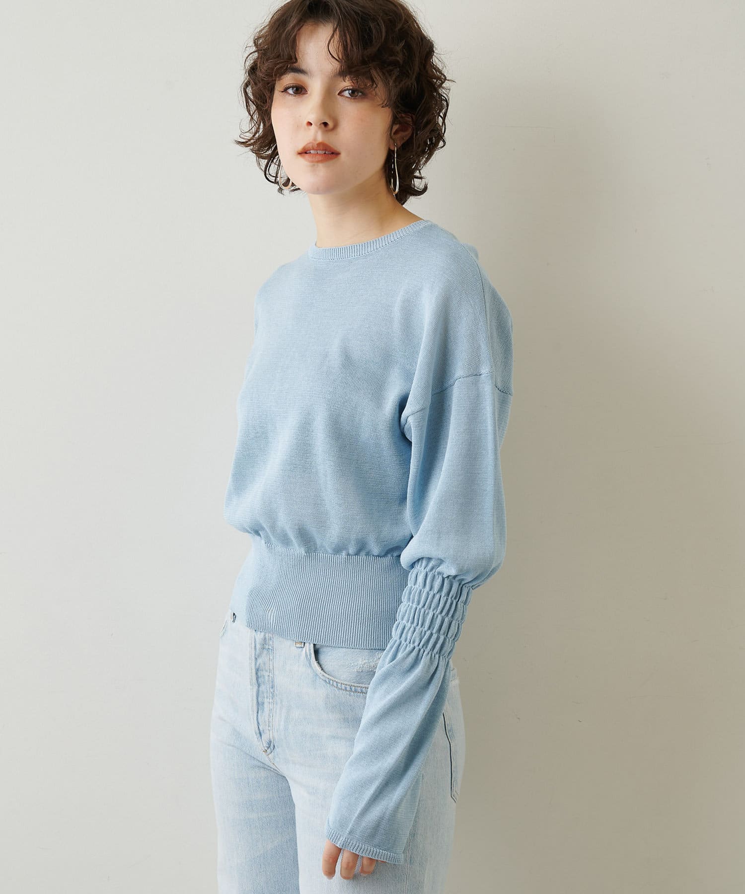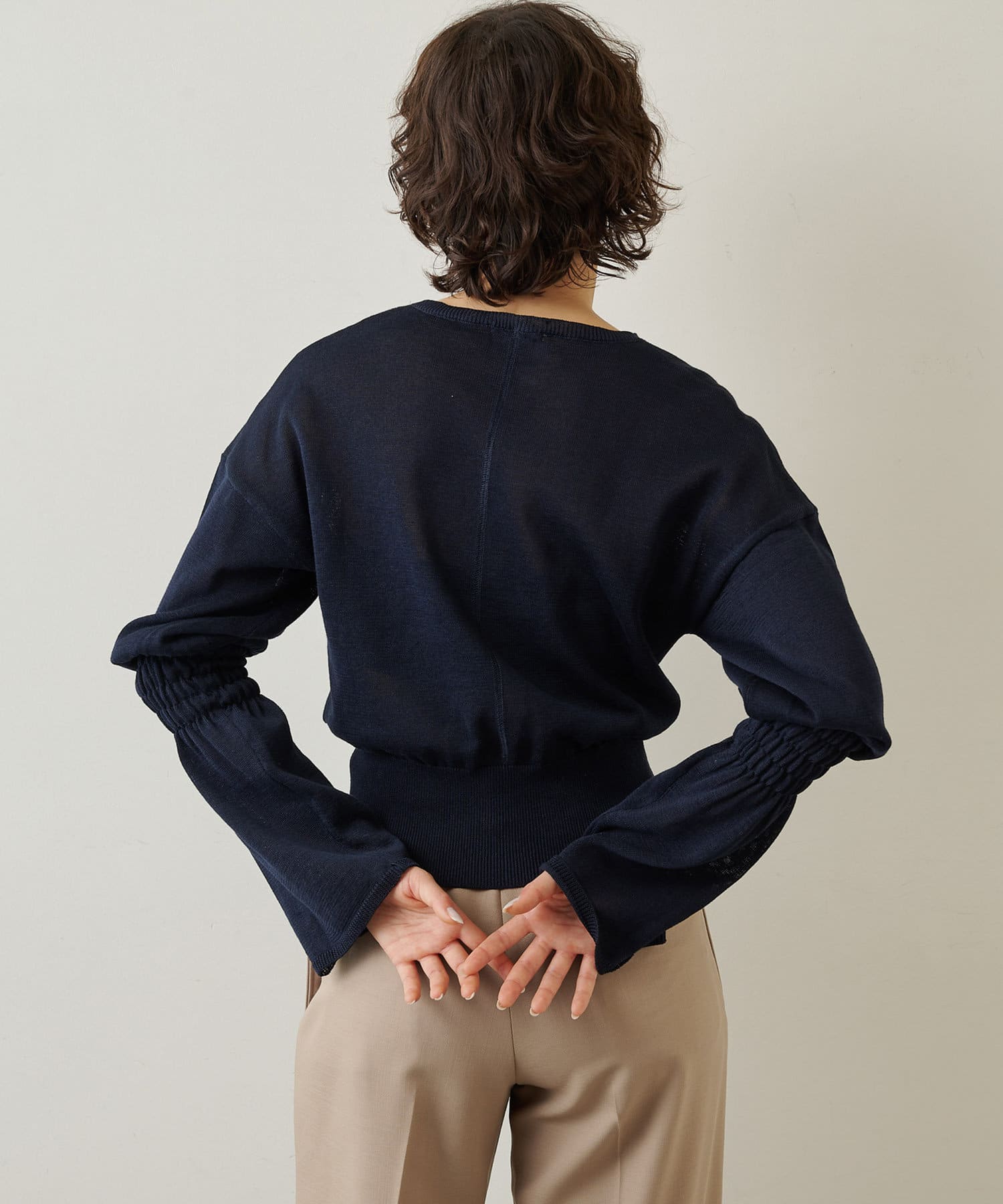 ■袖のシャーリングデザインがポイントのニットプルオーバー。