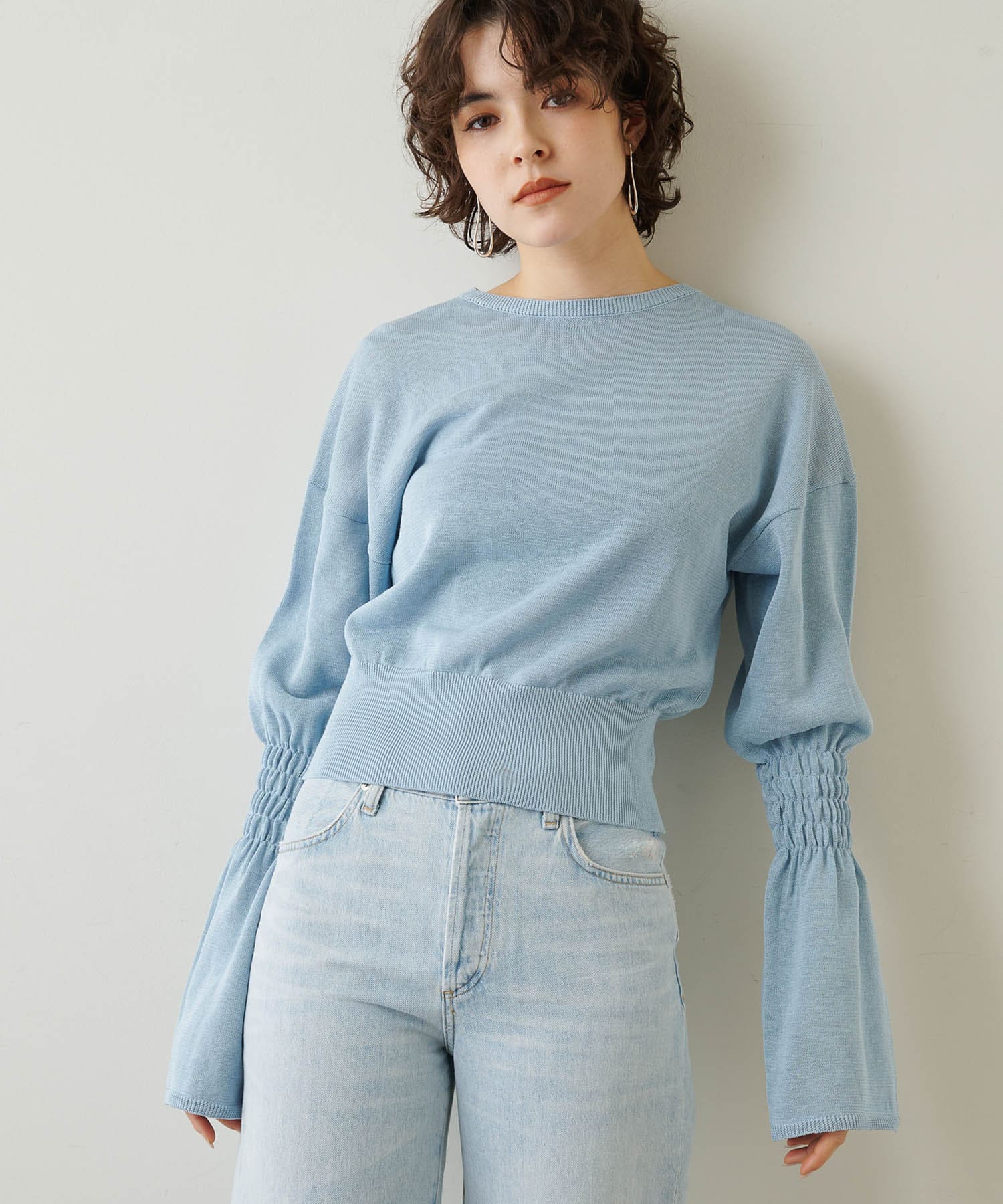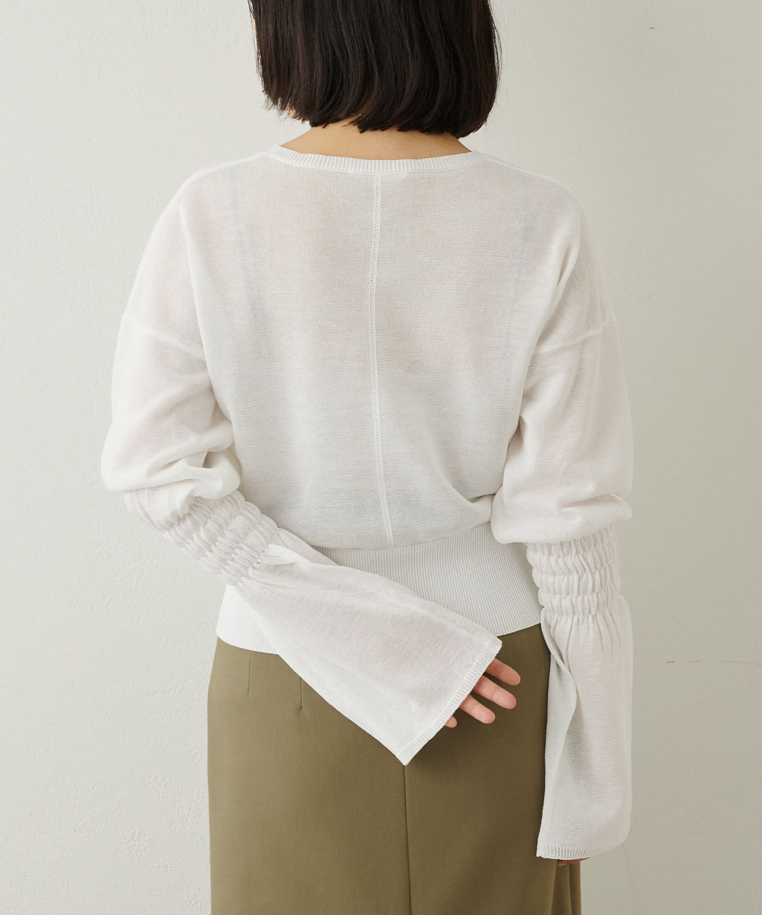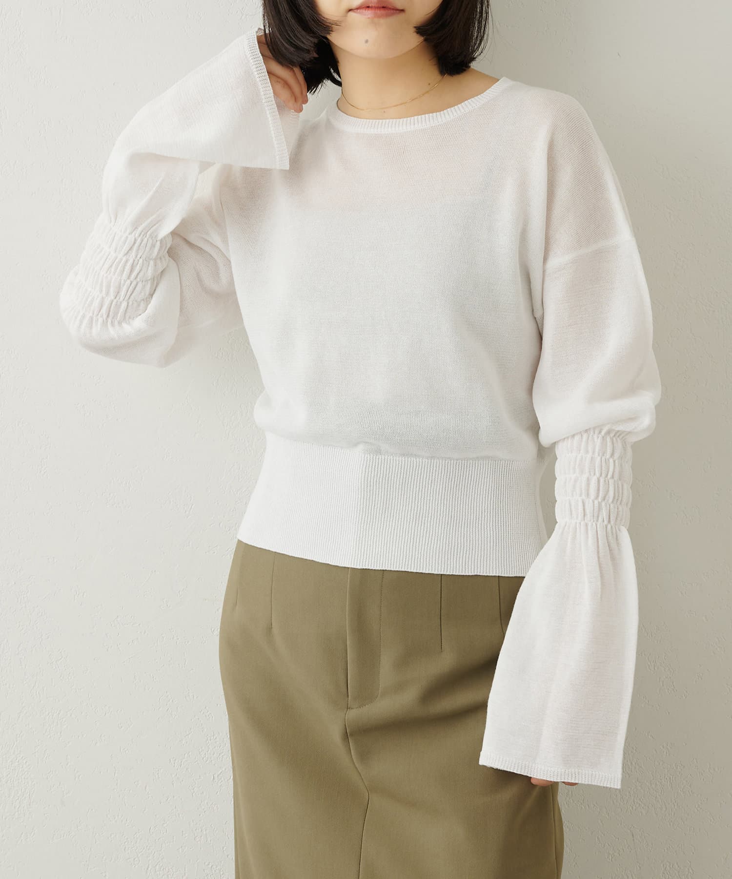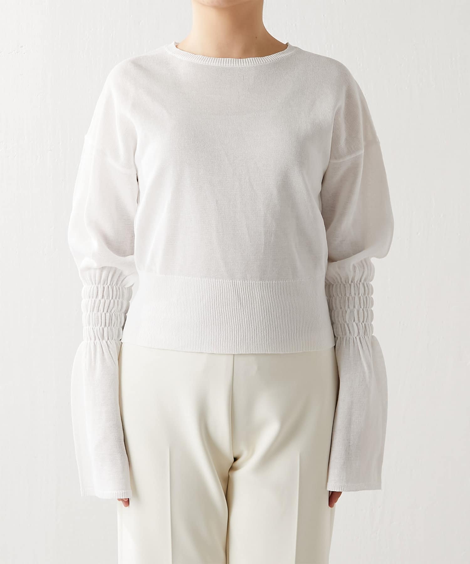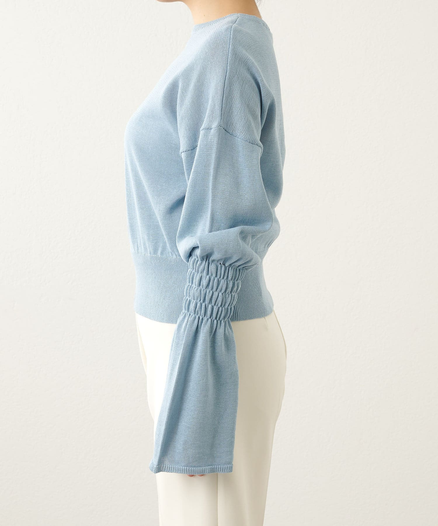 ■袖のシャーリングデザインがポイントのニットプルオーバー。
