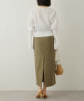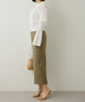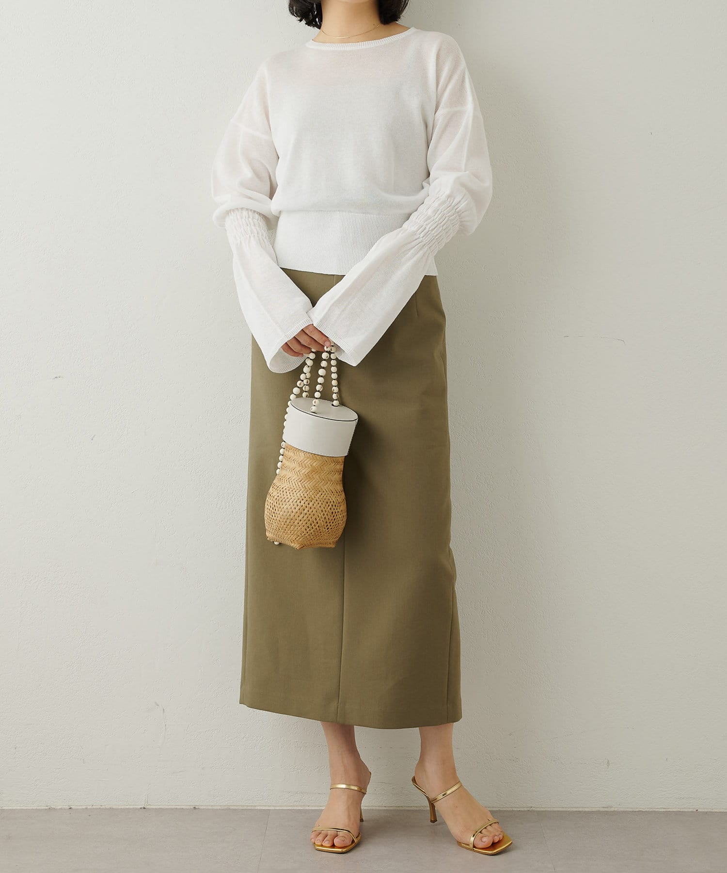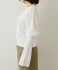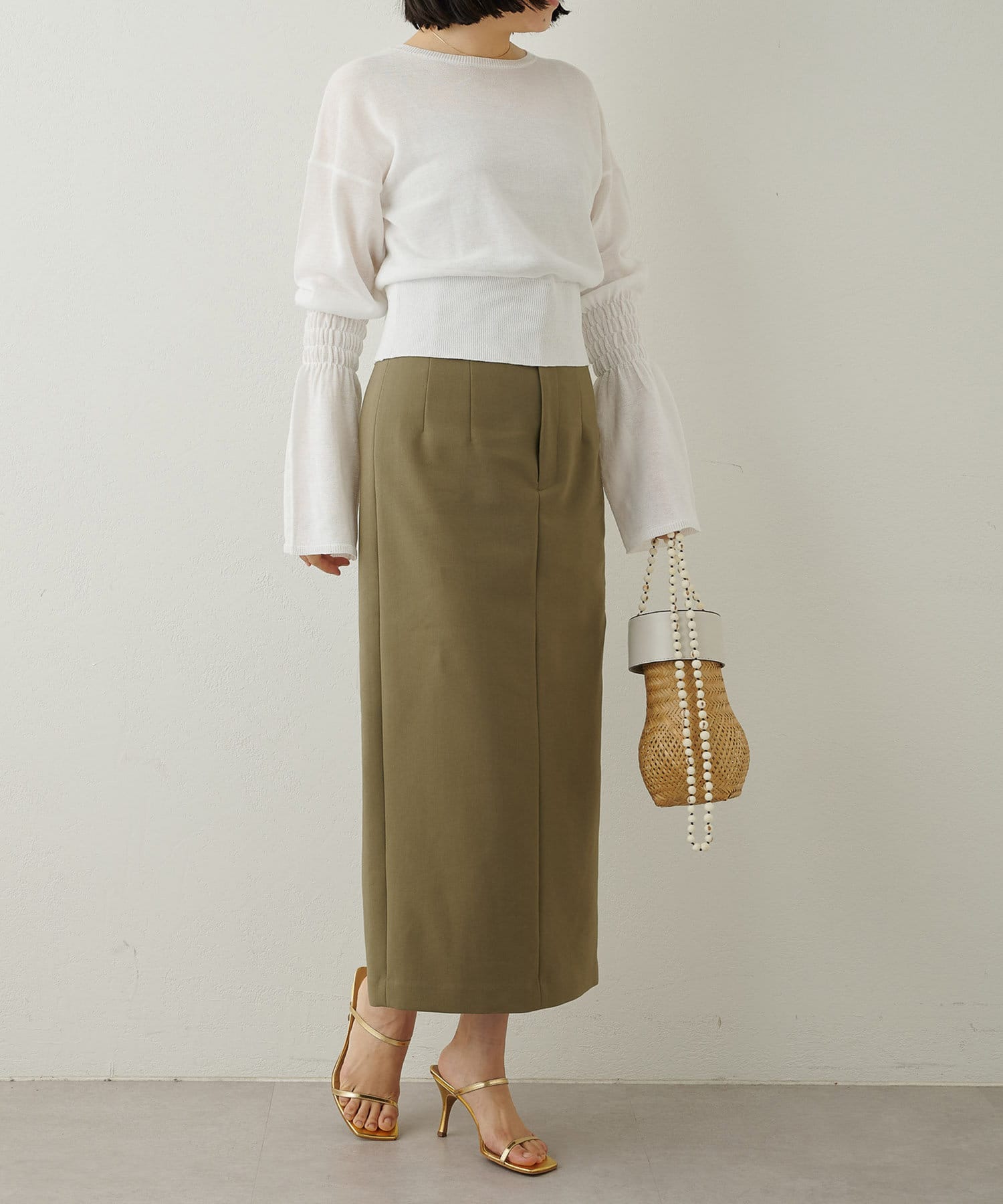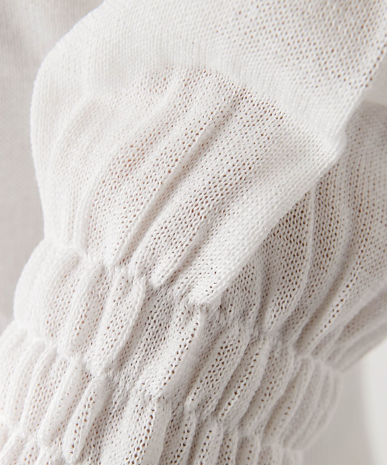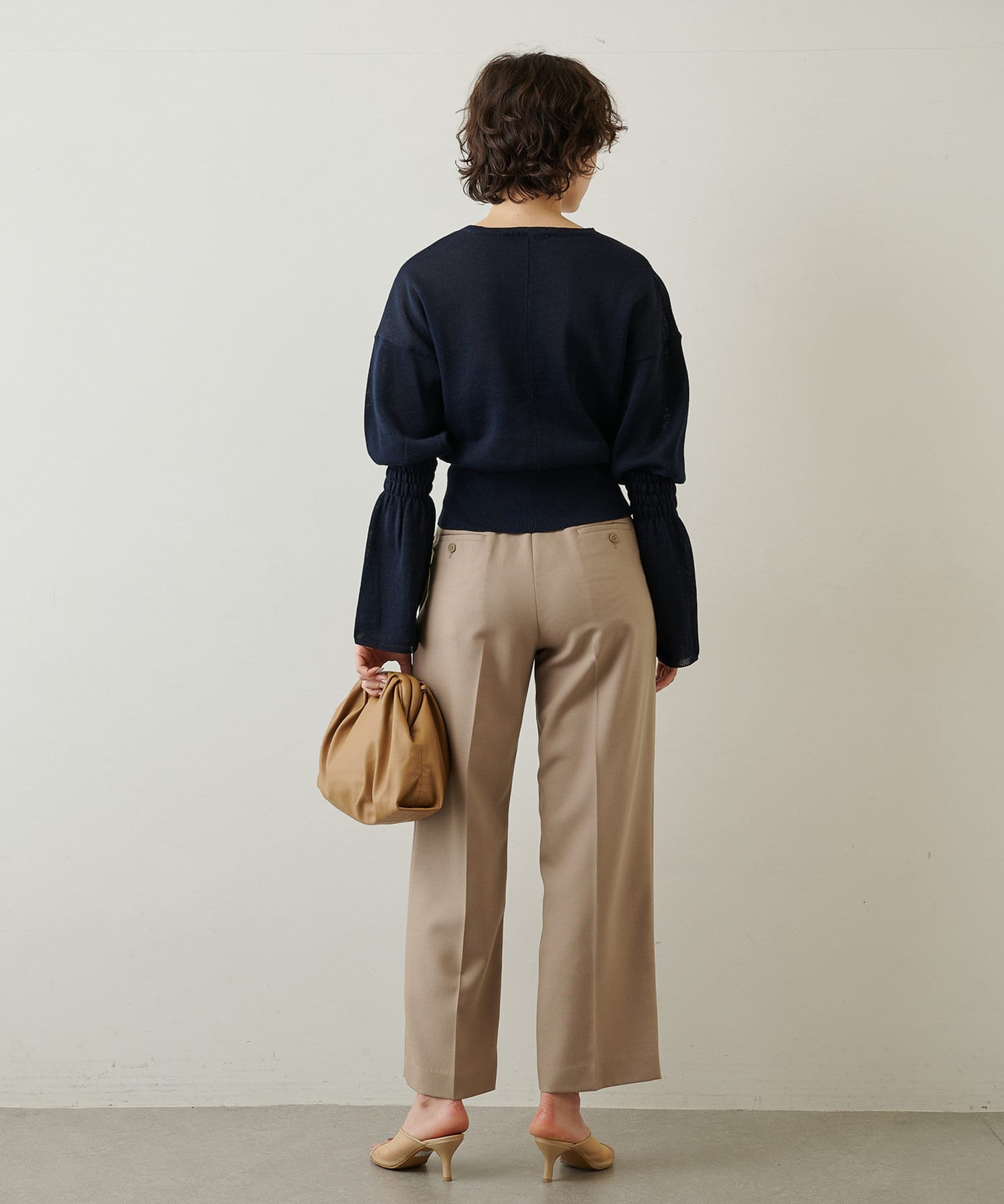 シャーリングが二の腕ではなく、袖下なのでスッキリとした見え感です。身丈は腰あたりまであるのでハイウエストのボトムスと相性が良く、お仕事着としても使っていただけます。