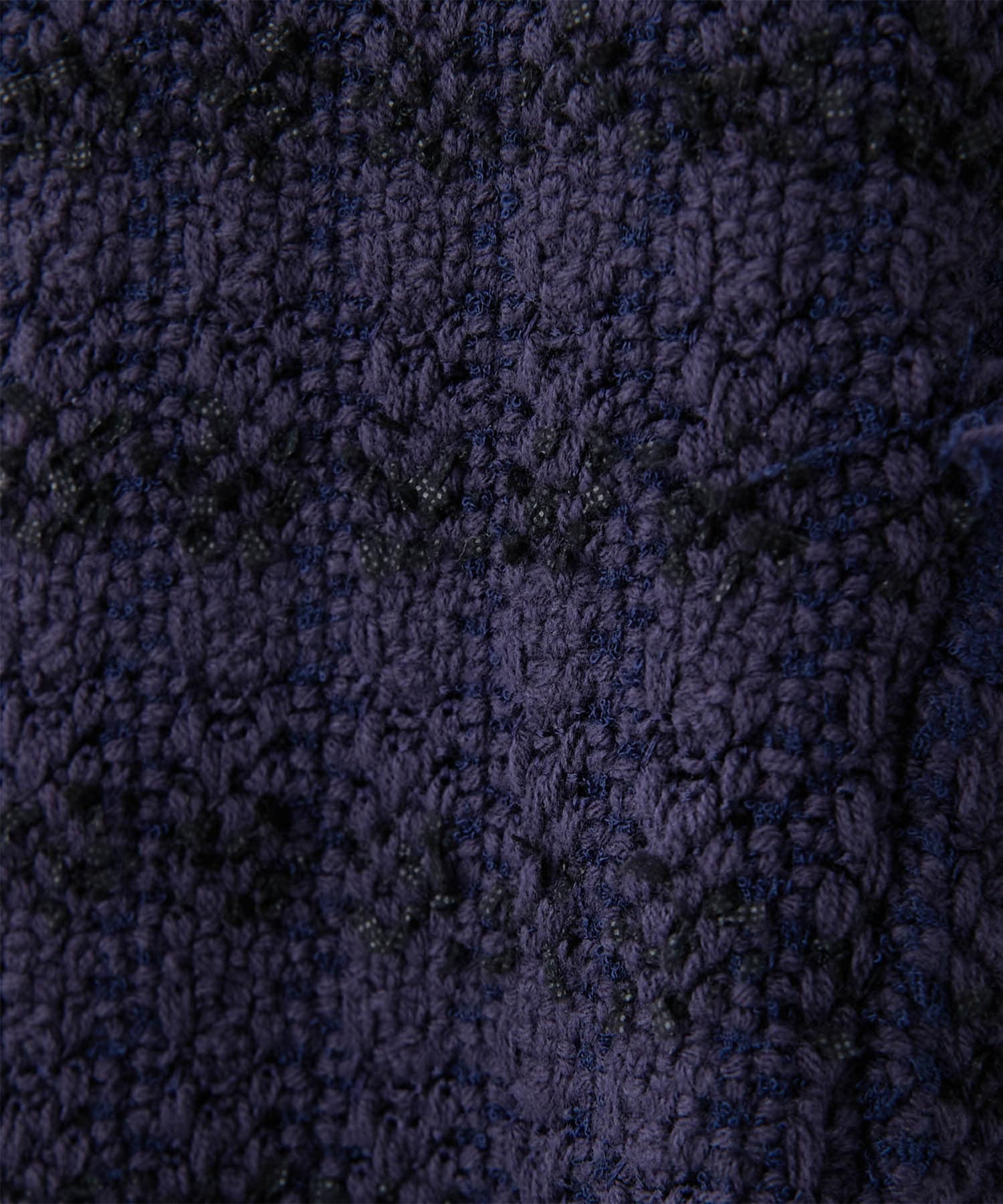 ブークレ糸・棉混・ペーパーモール・ブライトレーヨンの4種類の素材を混ぜ、ツイード調に編み上げたニット素材。