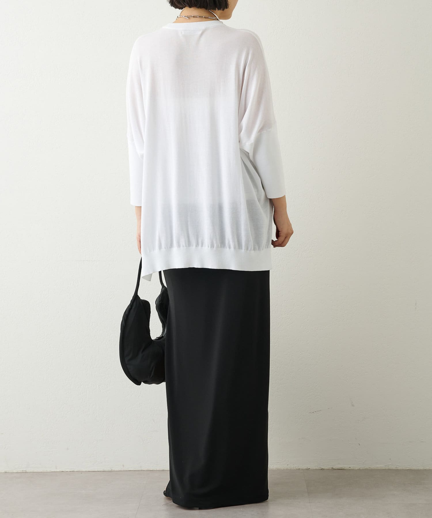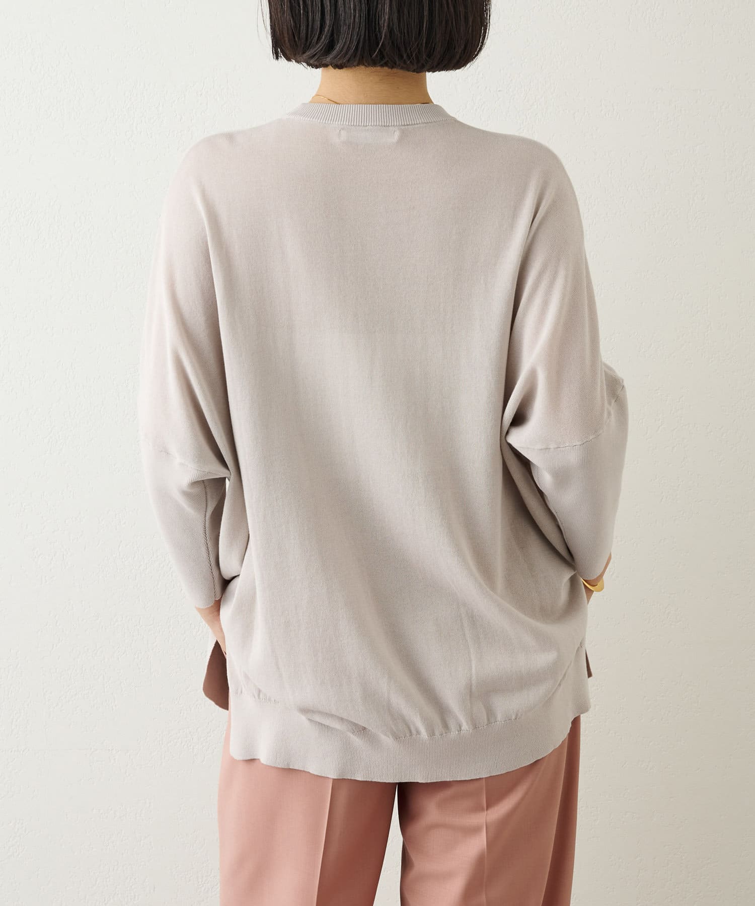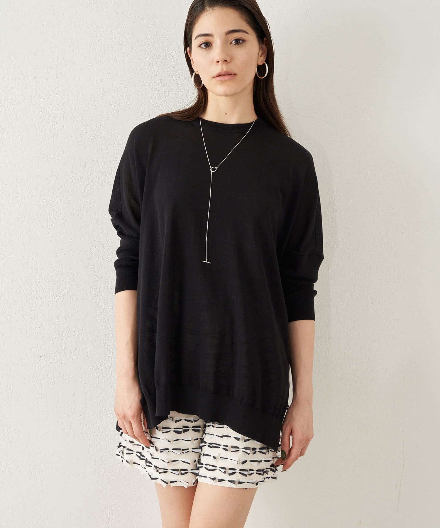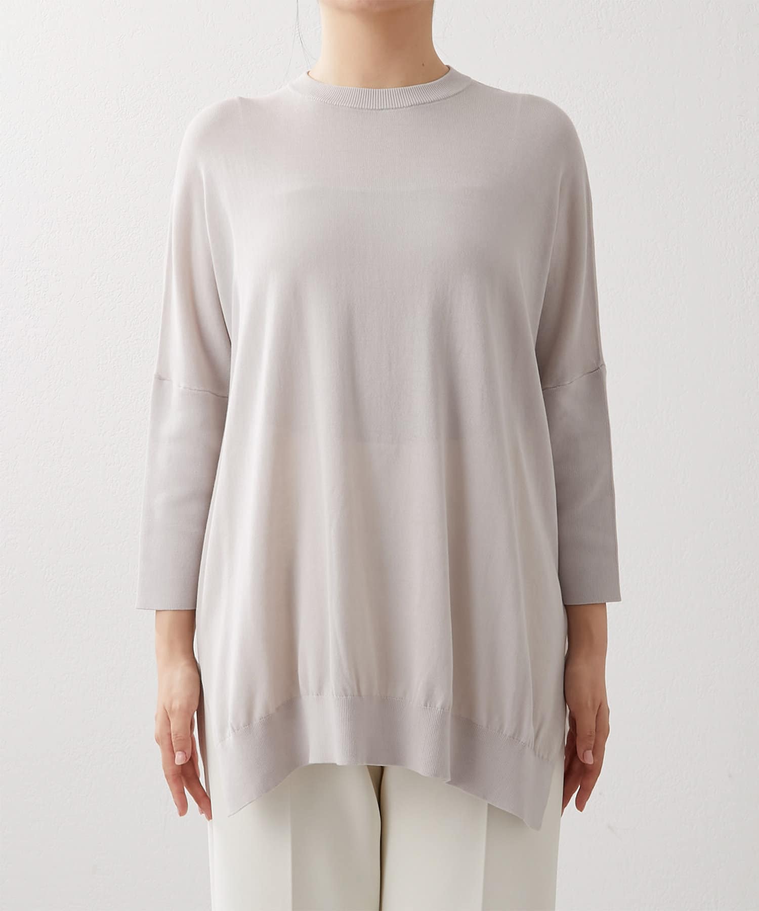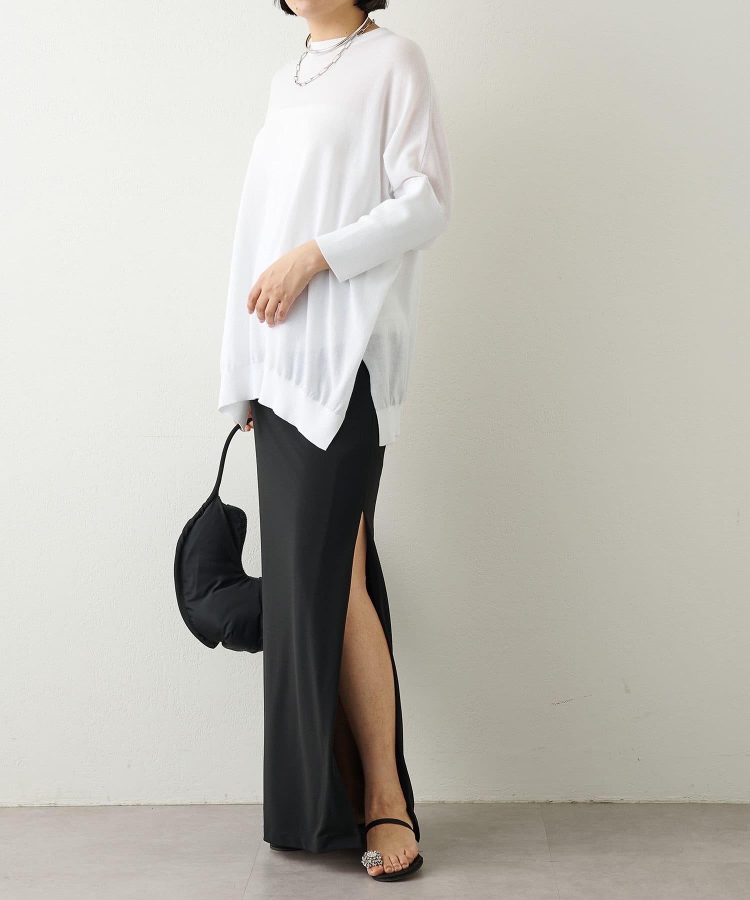■ゆったりとしたスクエアフォルムに、サイドスリットを入れることで抜け感をプラスし、クルーネックで引き締めたデザイン。