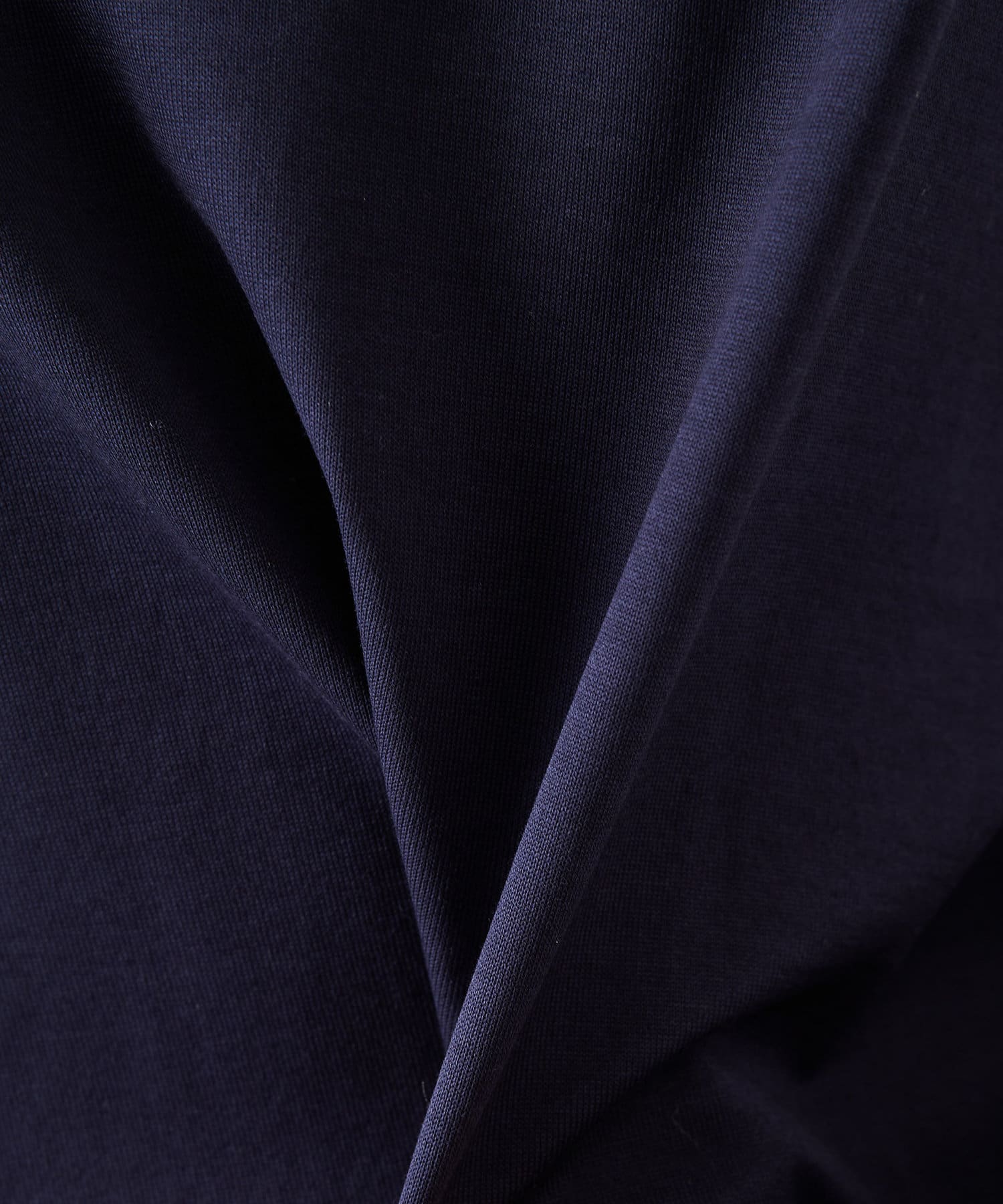 ガス焼きした糸で編み立てをし目面をきれいに仕上げ、染色後に特殊な加工を施し、上品なツヤと光沢・張り感とドレープ感を出した生地。