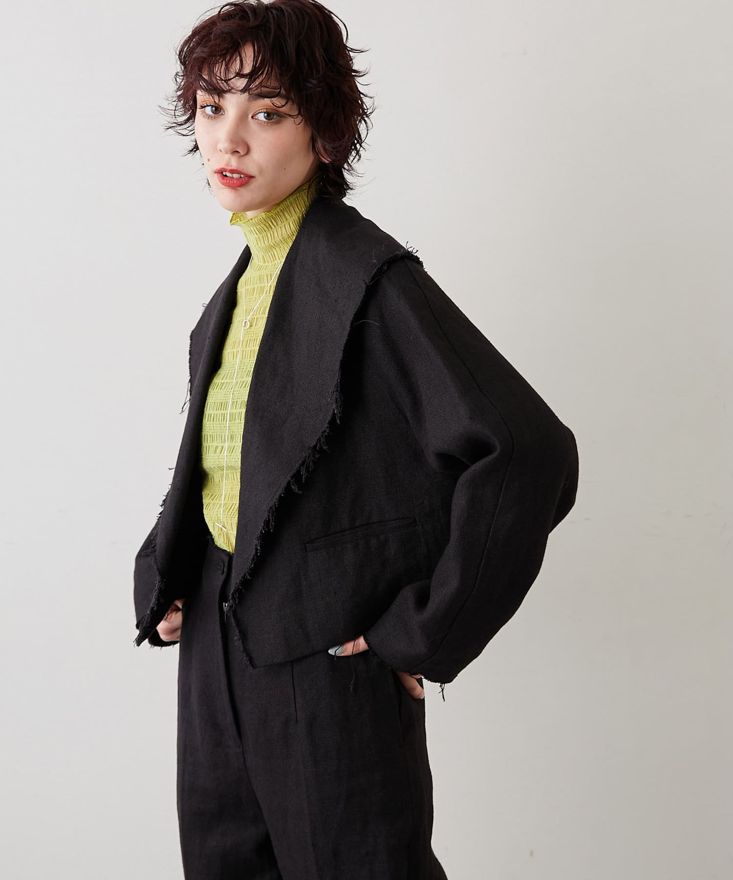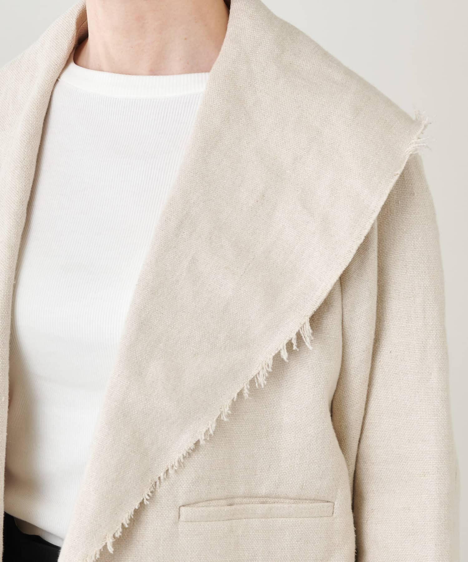 スッキリとした上半身に。投入するだけで一気にこなれた雰囲気になります。大きめの襟で小顔効果も期待できます。今までのリネンジャケットとは一味違う、おしゃれアイテムです。