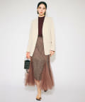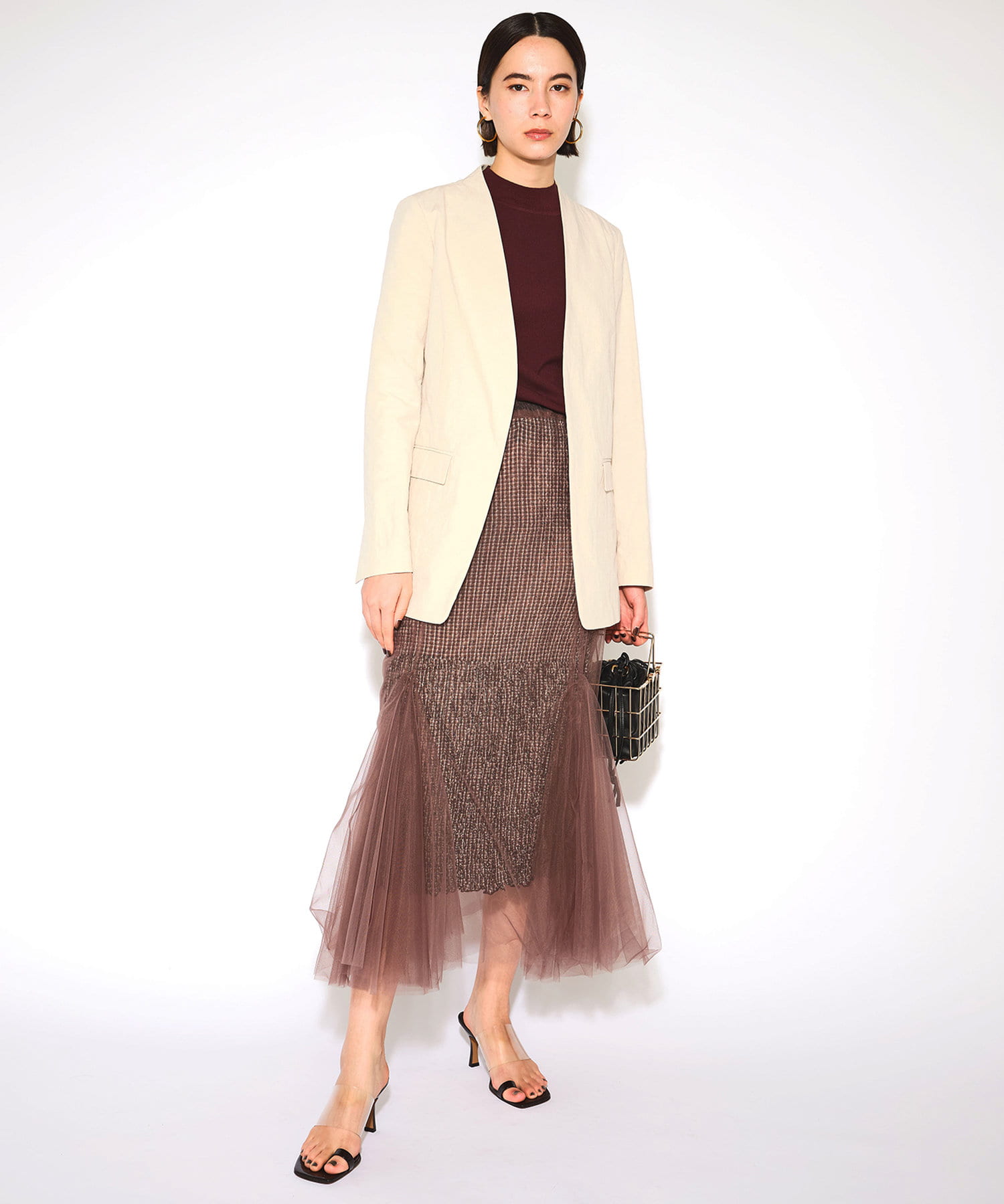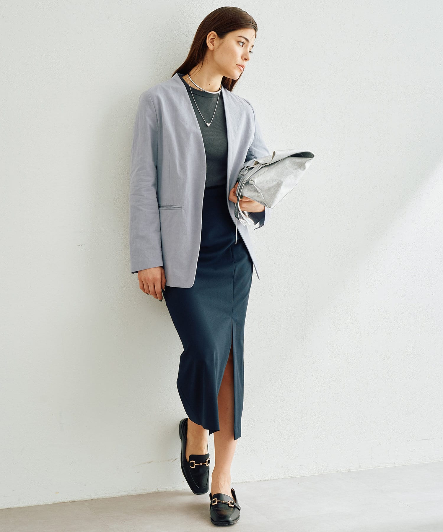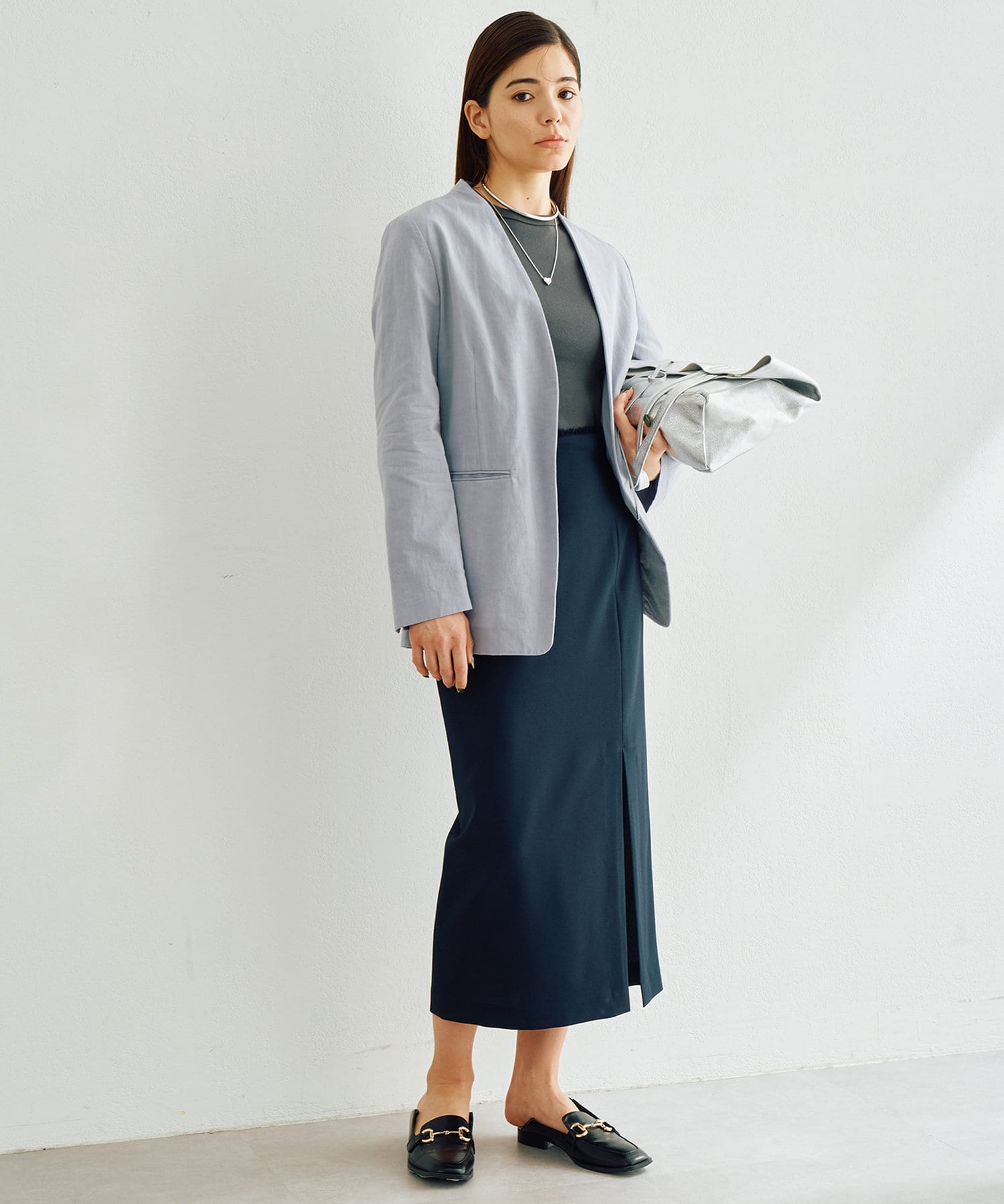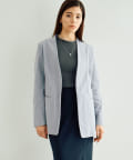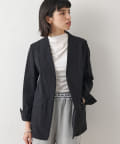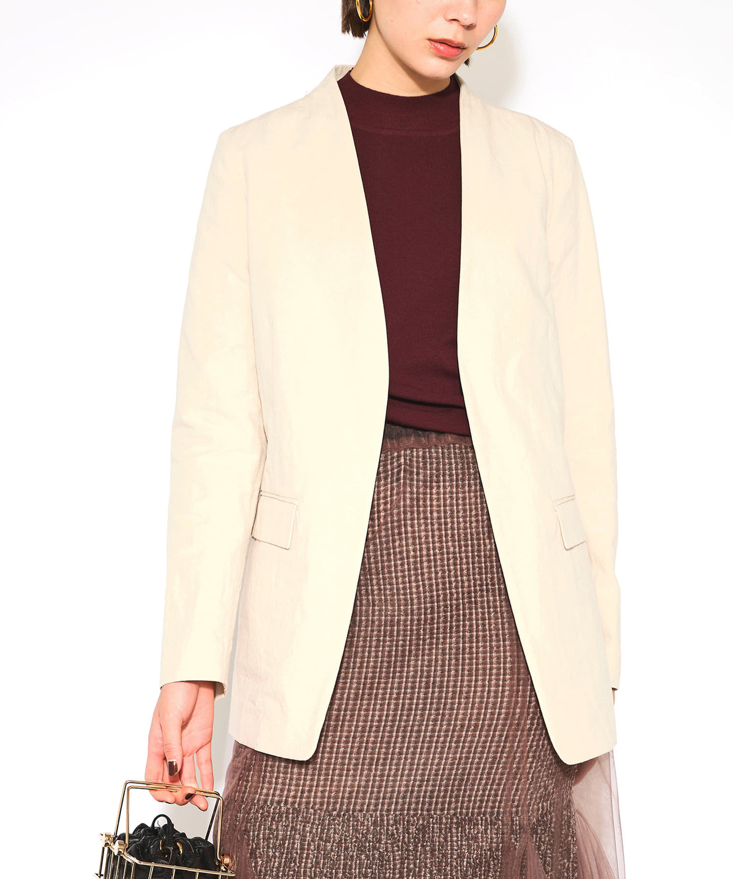 ■ノーカラーがすっきりとした印象のシンプルなジャケット。