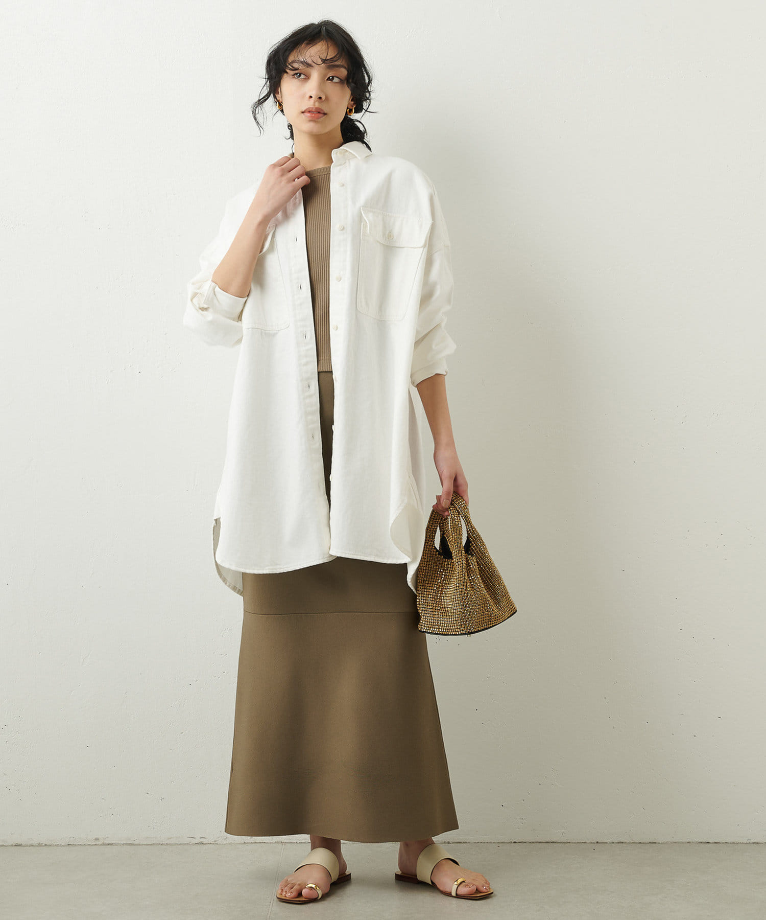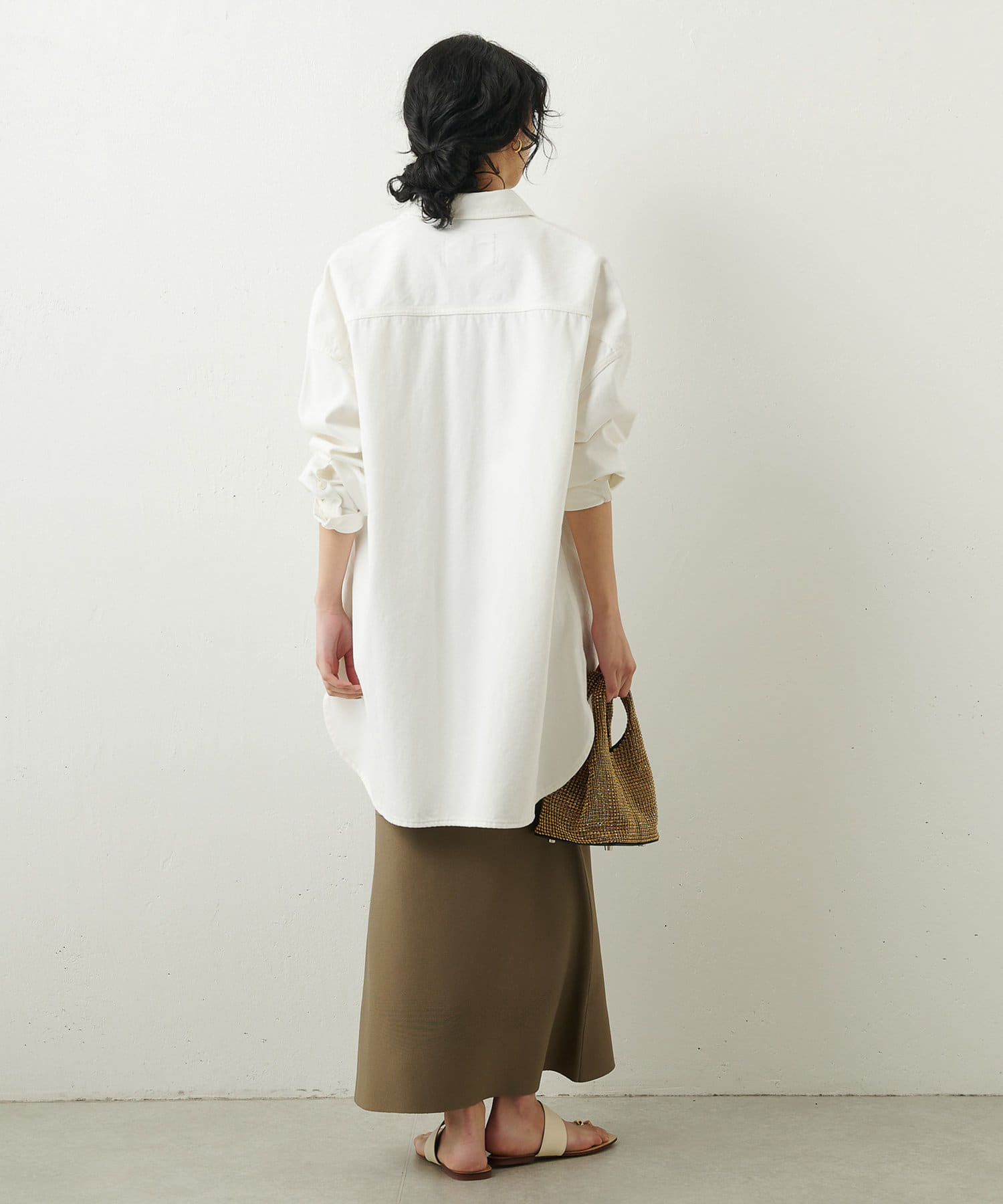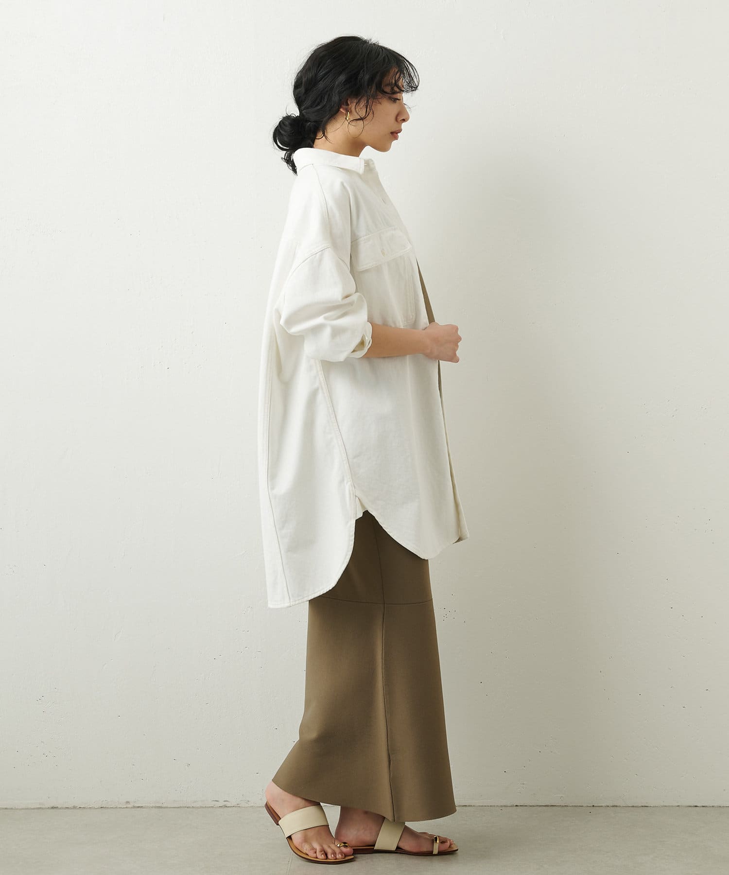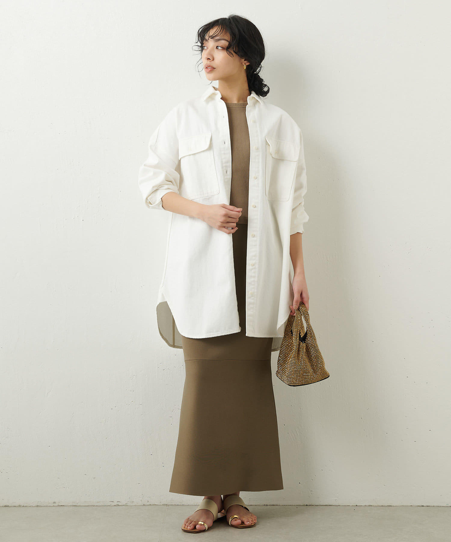 少し長めのデニムシャツのような着丈で着回し力抜群です。ヒップが隠れるので体型カバーにもなり、タイトなボトムとも相性抜群です。程よく厚みのある生地なので、季節の変わり目などの軽羽織りとしても重宝しますよ!