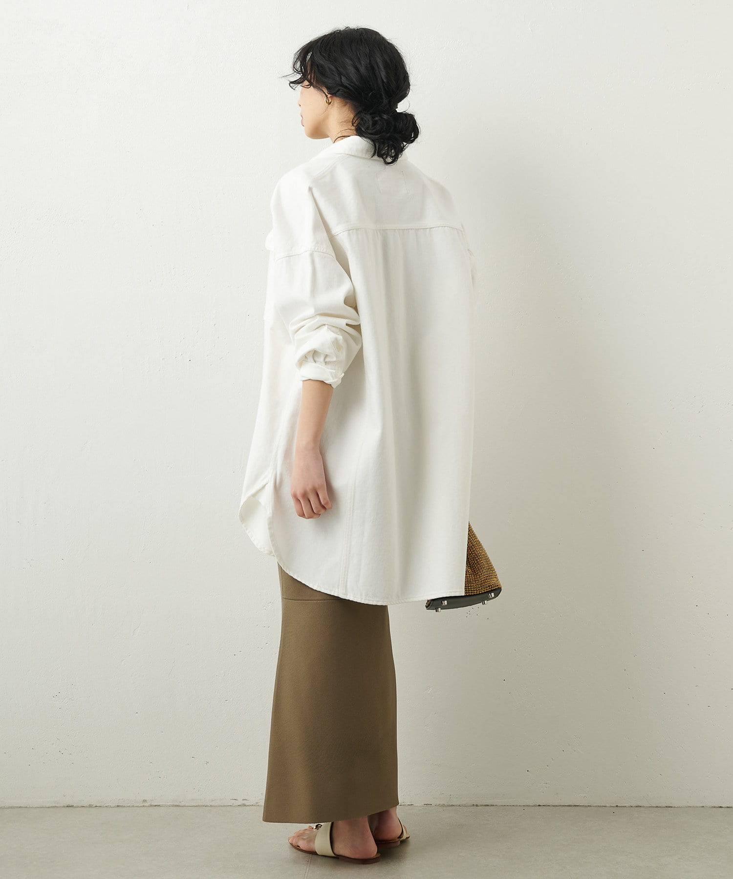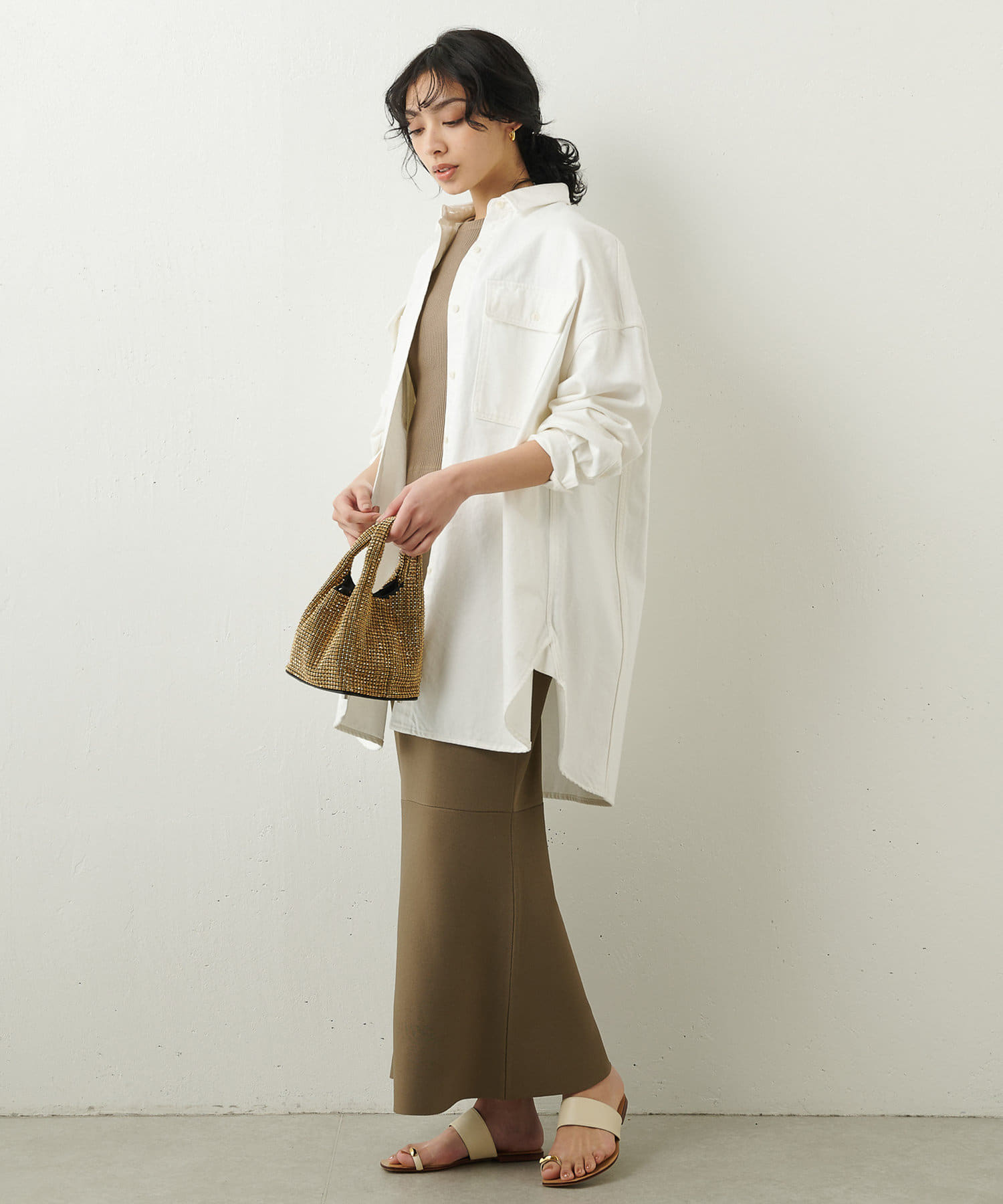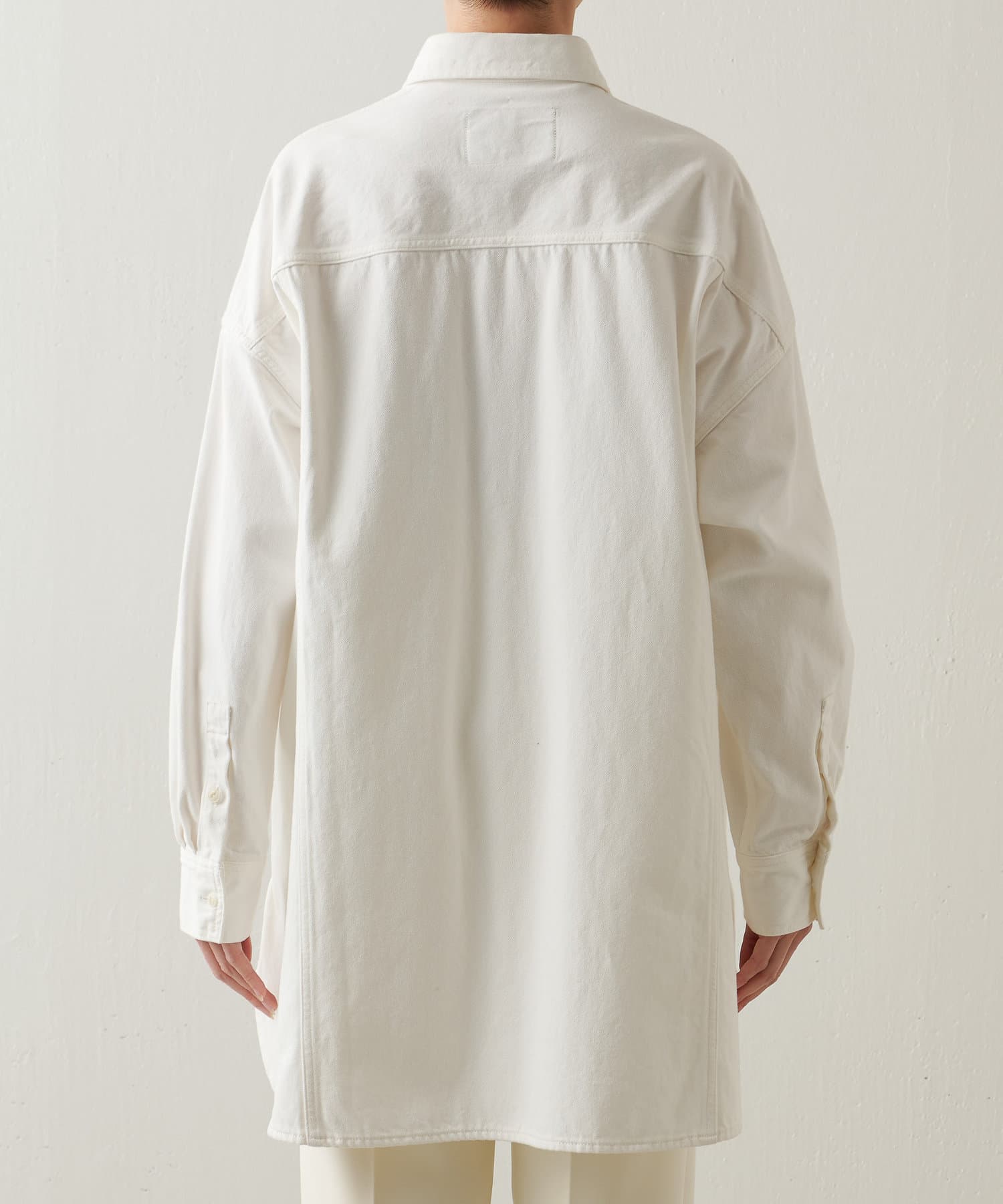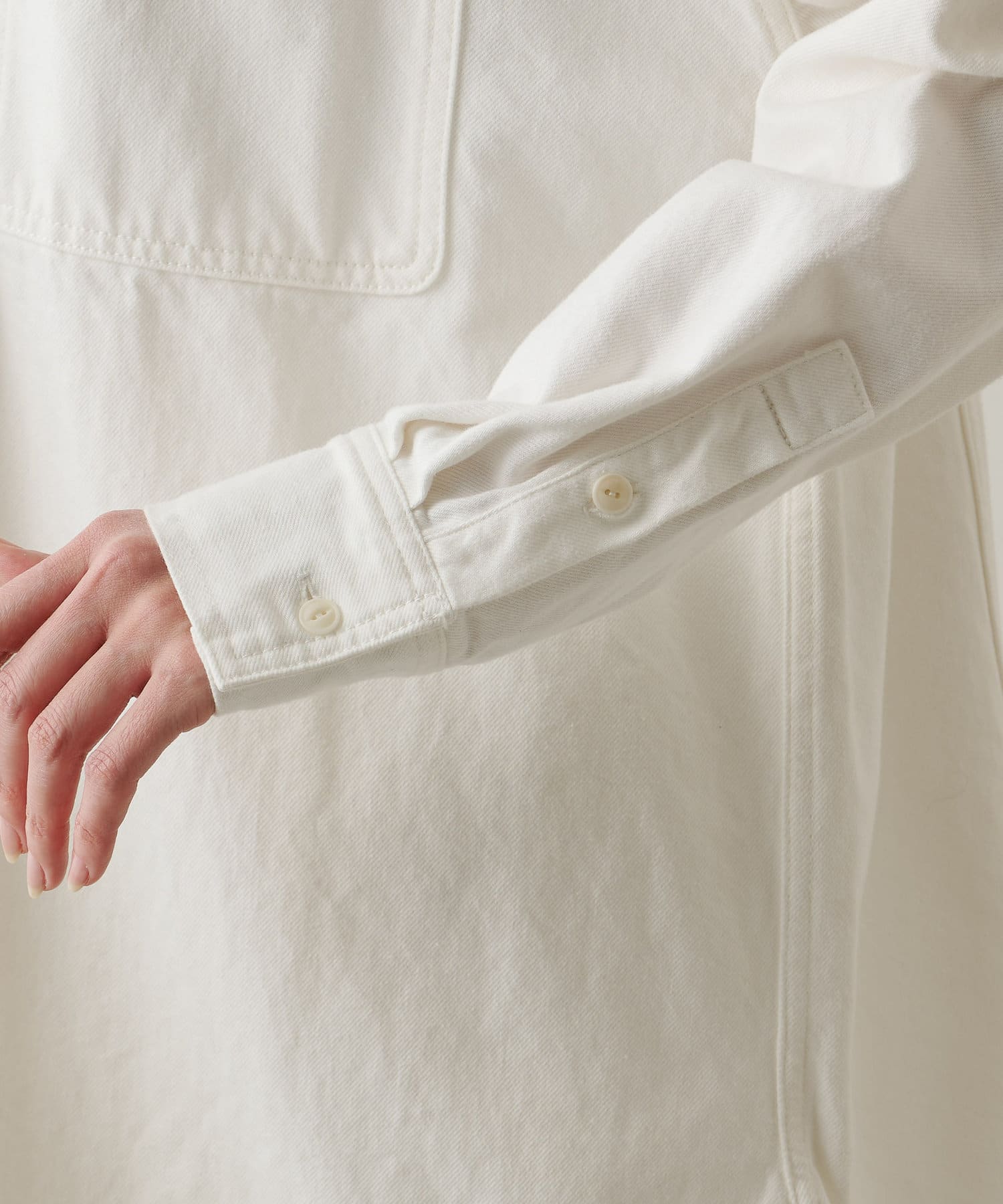 少し長めのデニムシャツのような着丈で着回し力抜群です。ヒップが隠れるので体型カバーにもなり、タイトなボトムとも相性抜群です。程よく厚みのある生地なので、季節の変わり目などの軽羽織りとしても重宝しますよ!