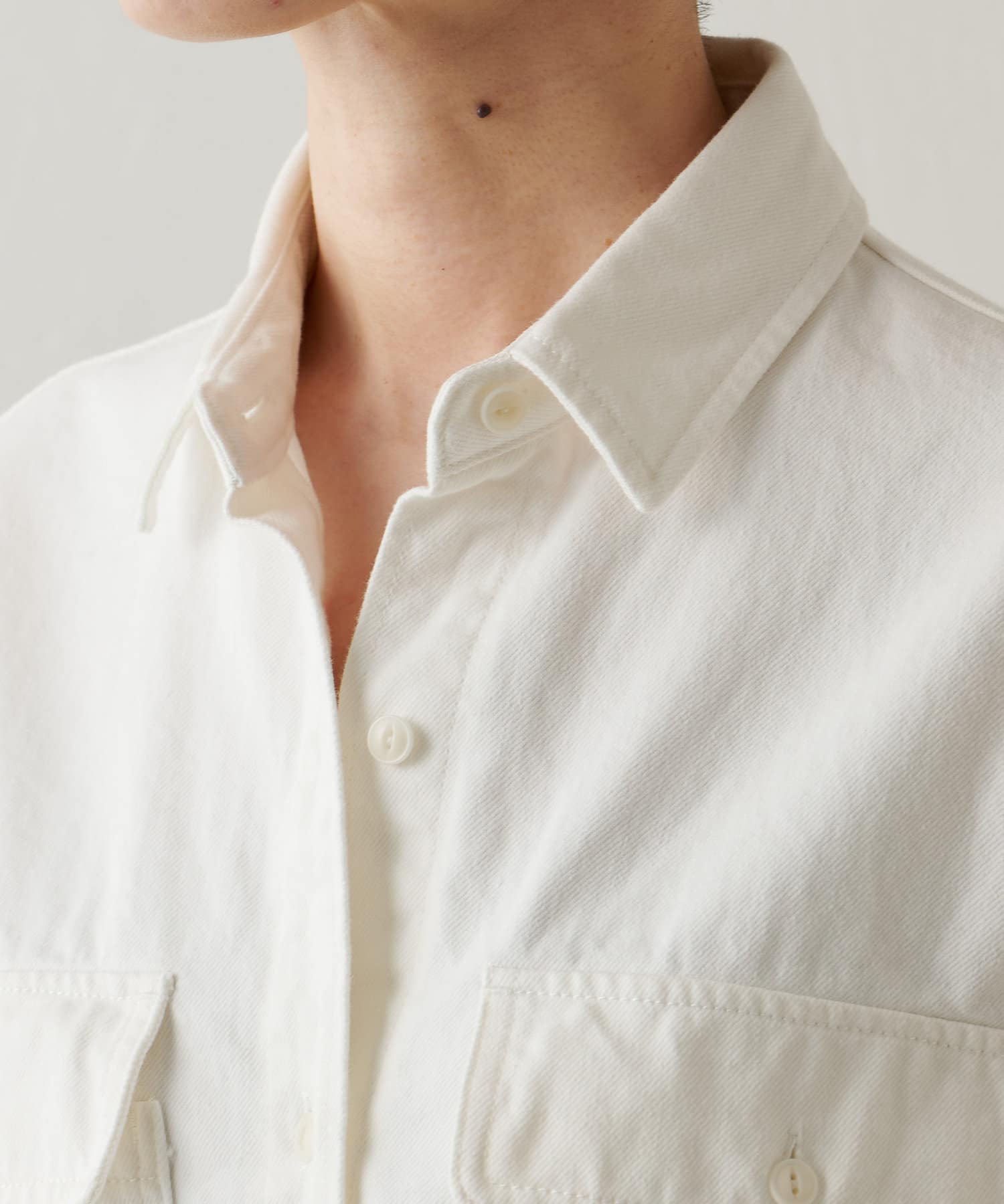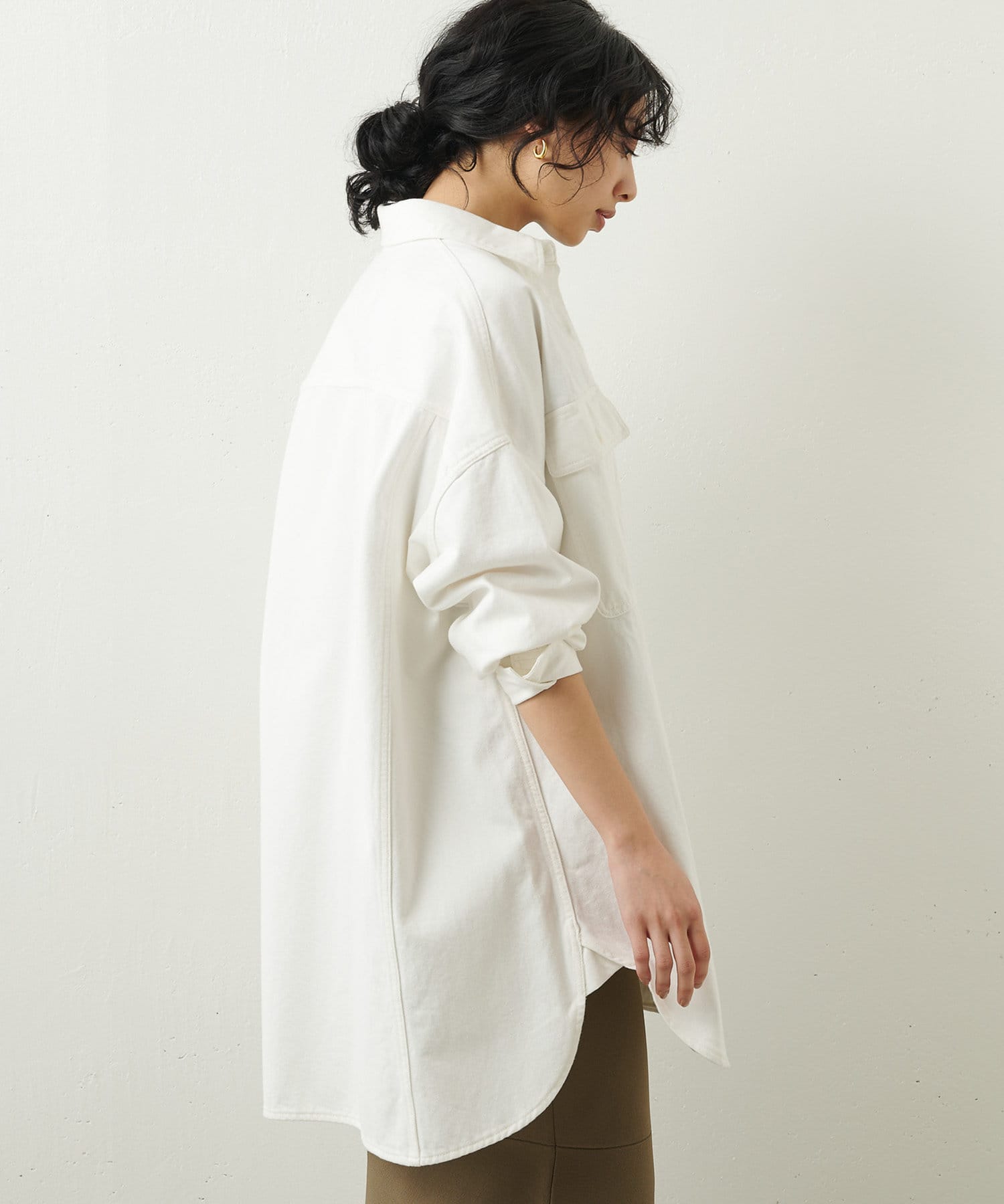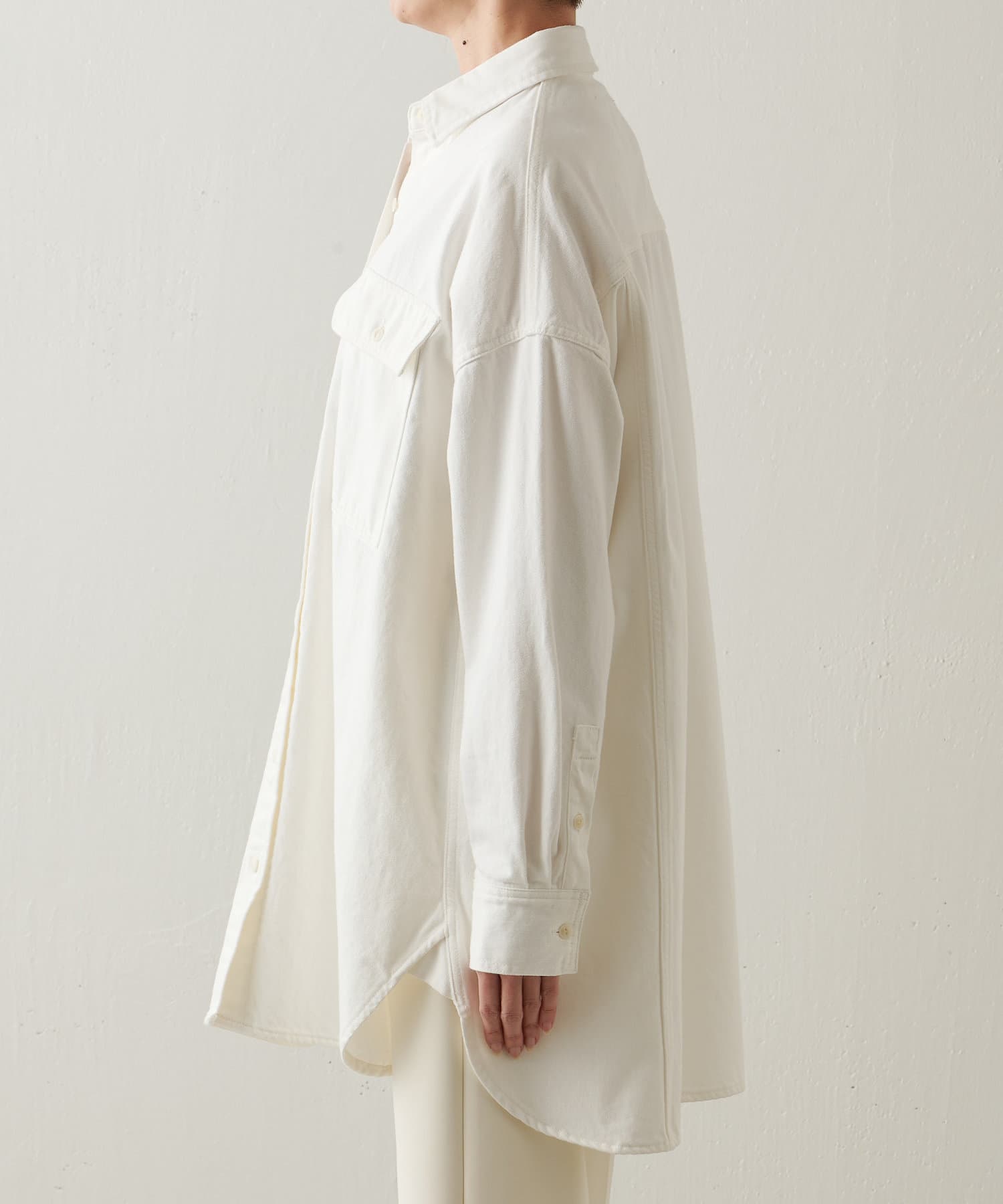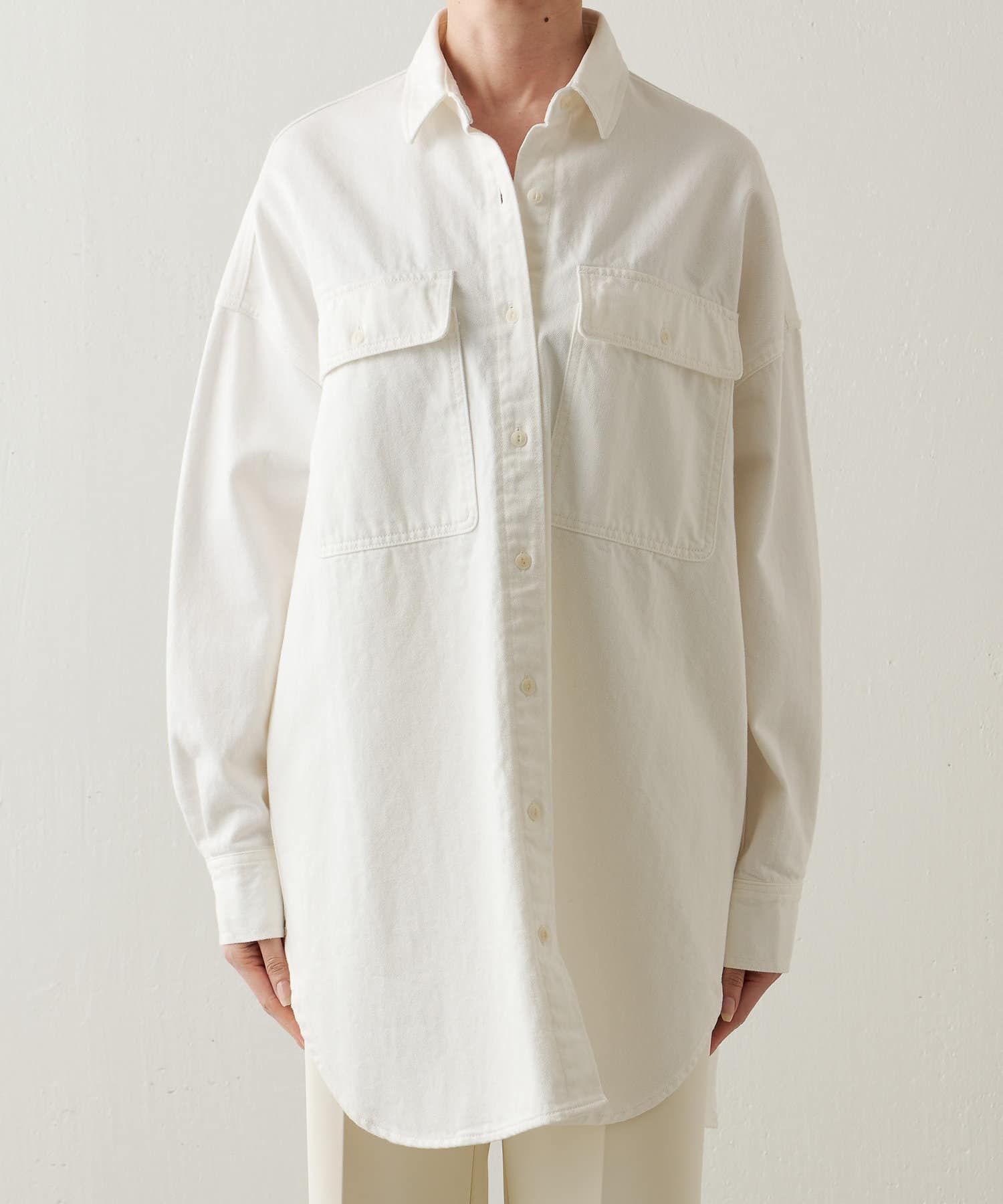 少し長めのデニムシャツのような着丈で着回し力抜群です。ヒップが隠れるので体型カバーにもなり、タイトなボトムとも相性抜群です。程よく厚みのある生地なので、季節の変わり目などの軽羽織りとしても重宝しますよ!