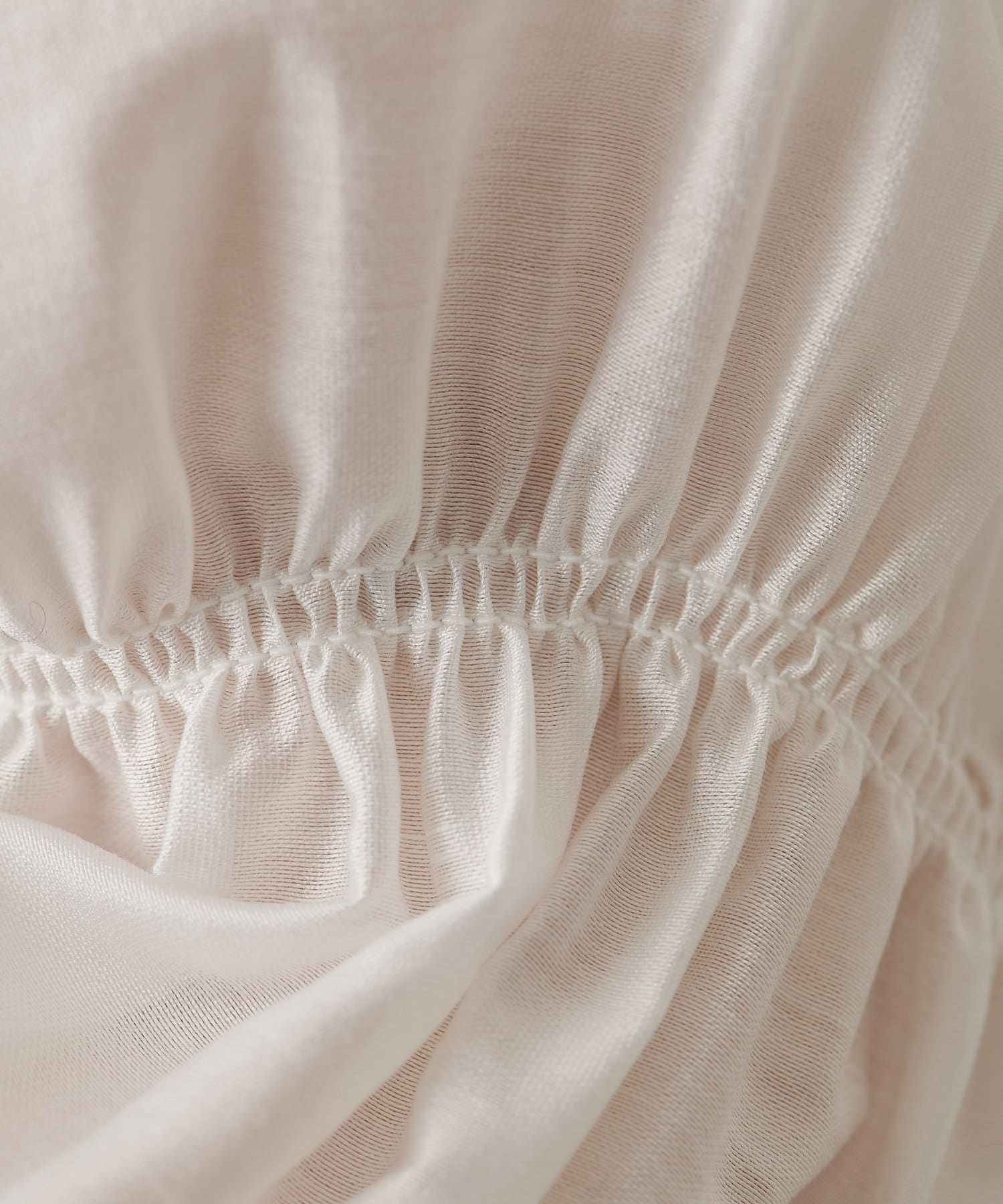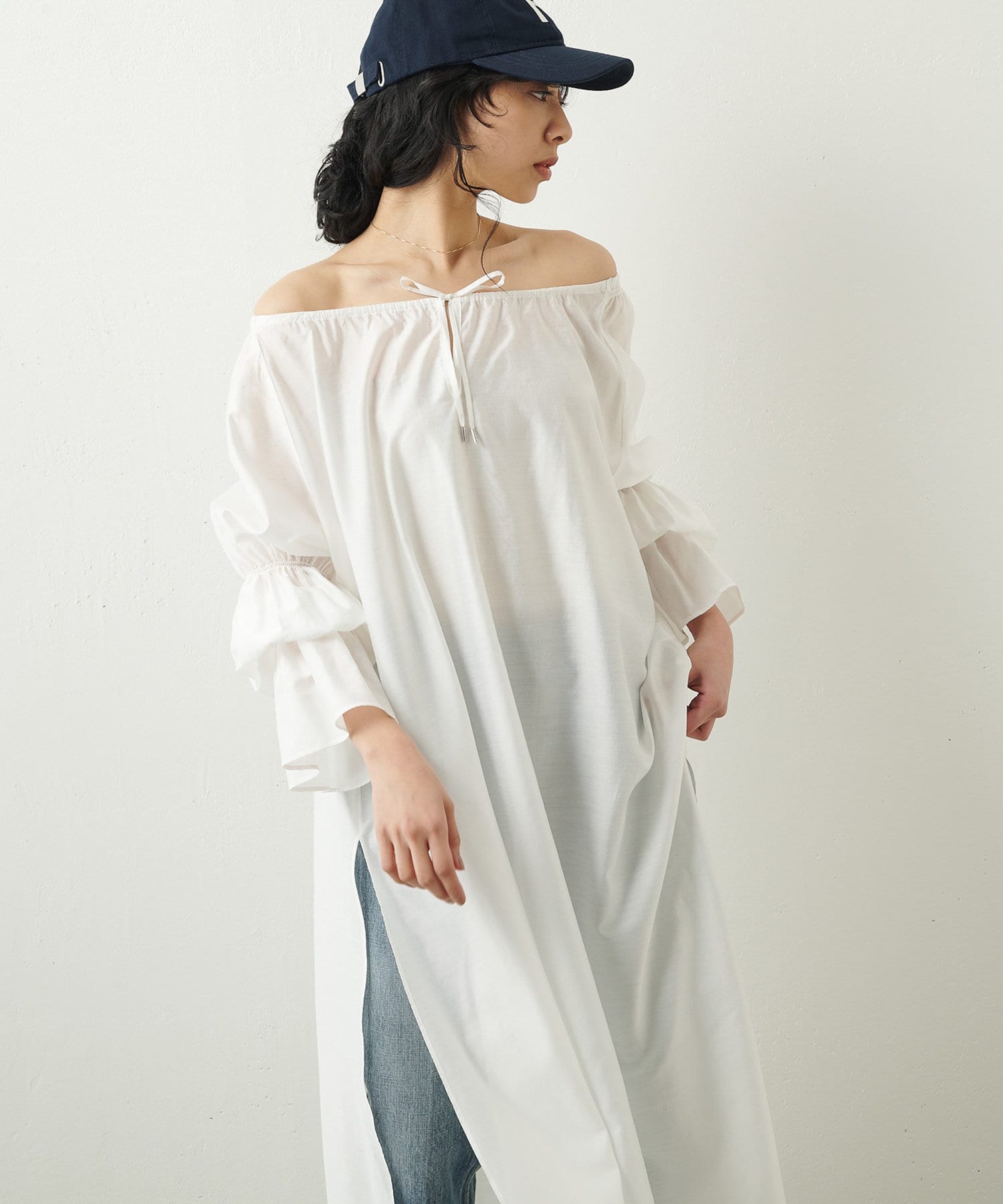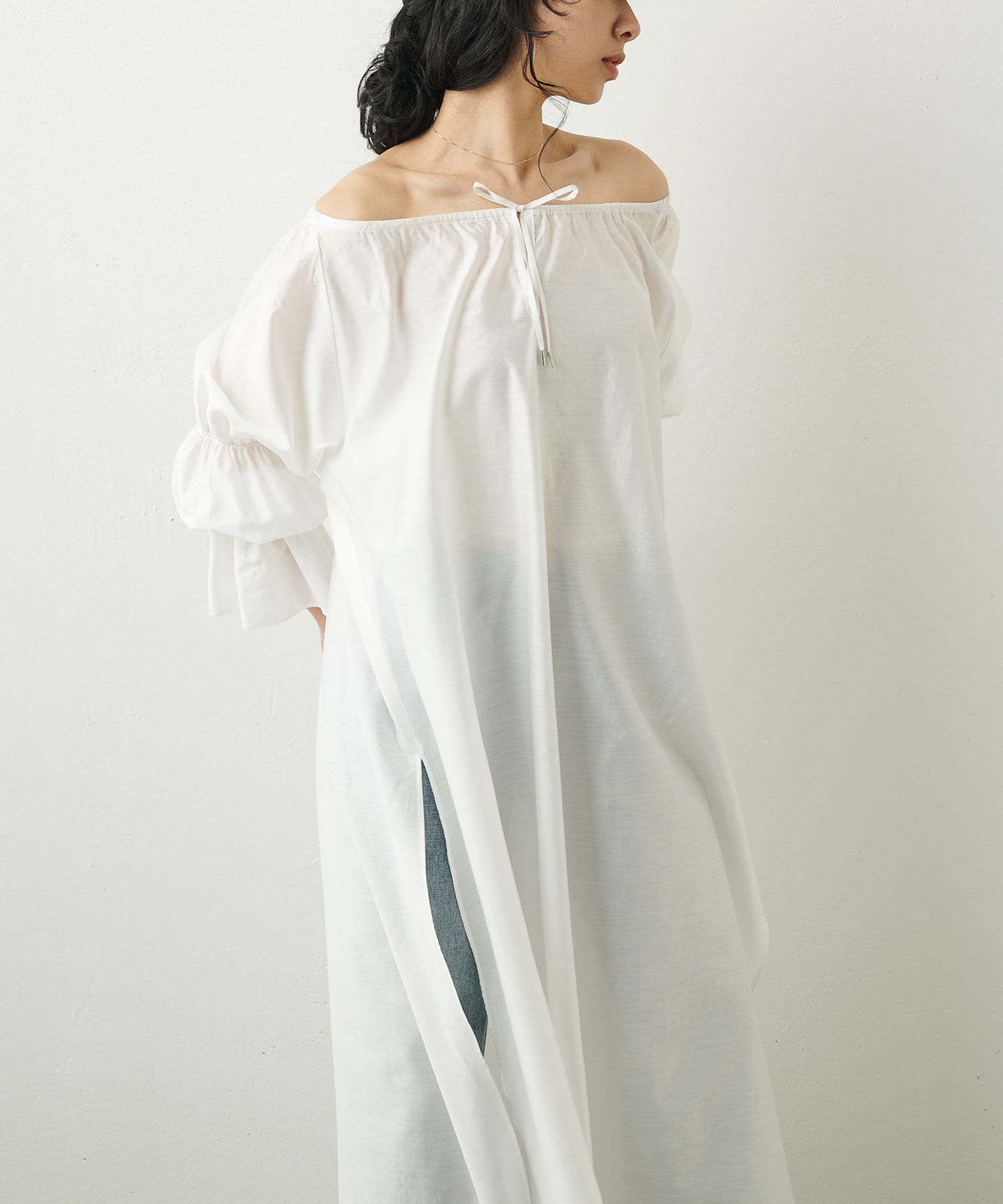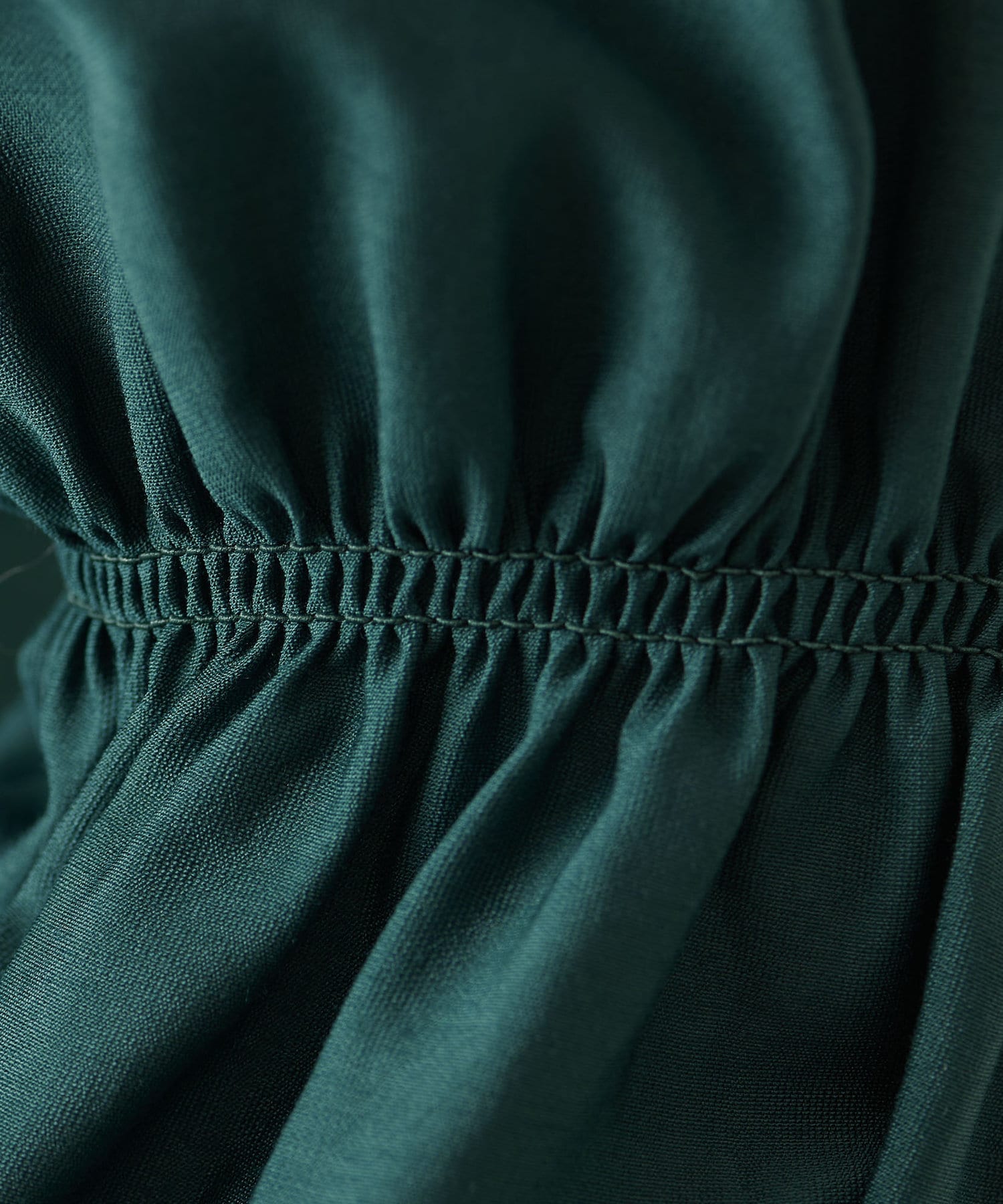 ■衿ぐりにはシャーリングを寄せ、フロント紐を緩める事でオフショルダーとしても着用可能。