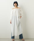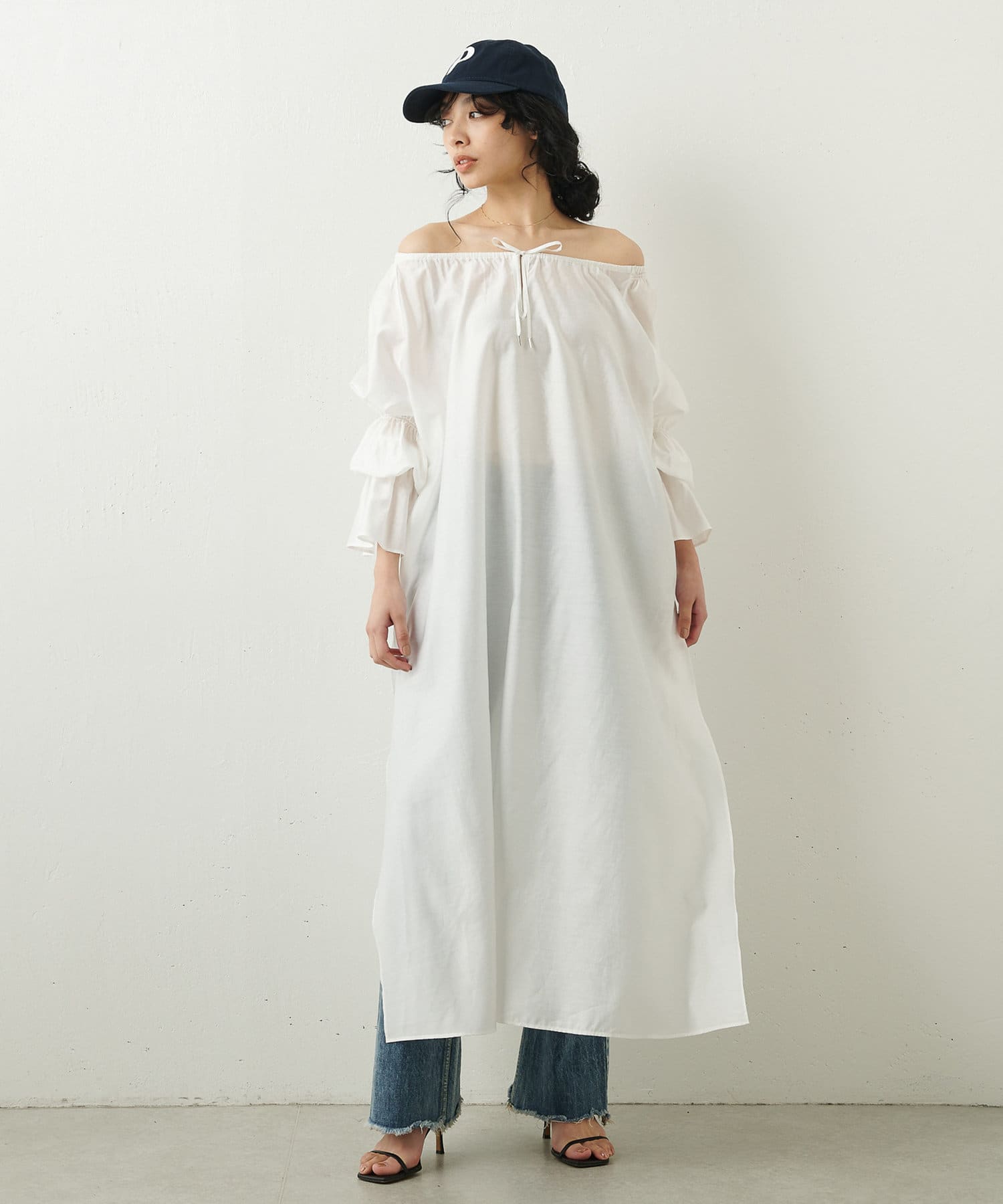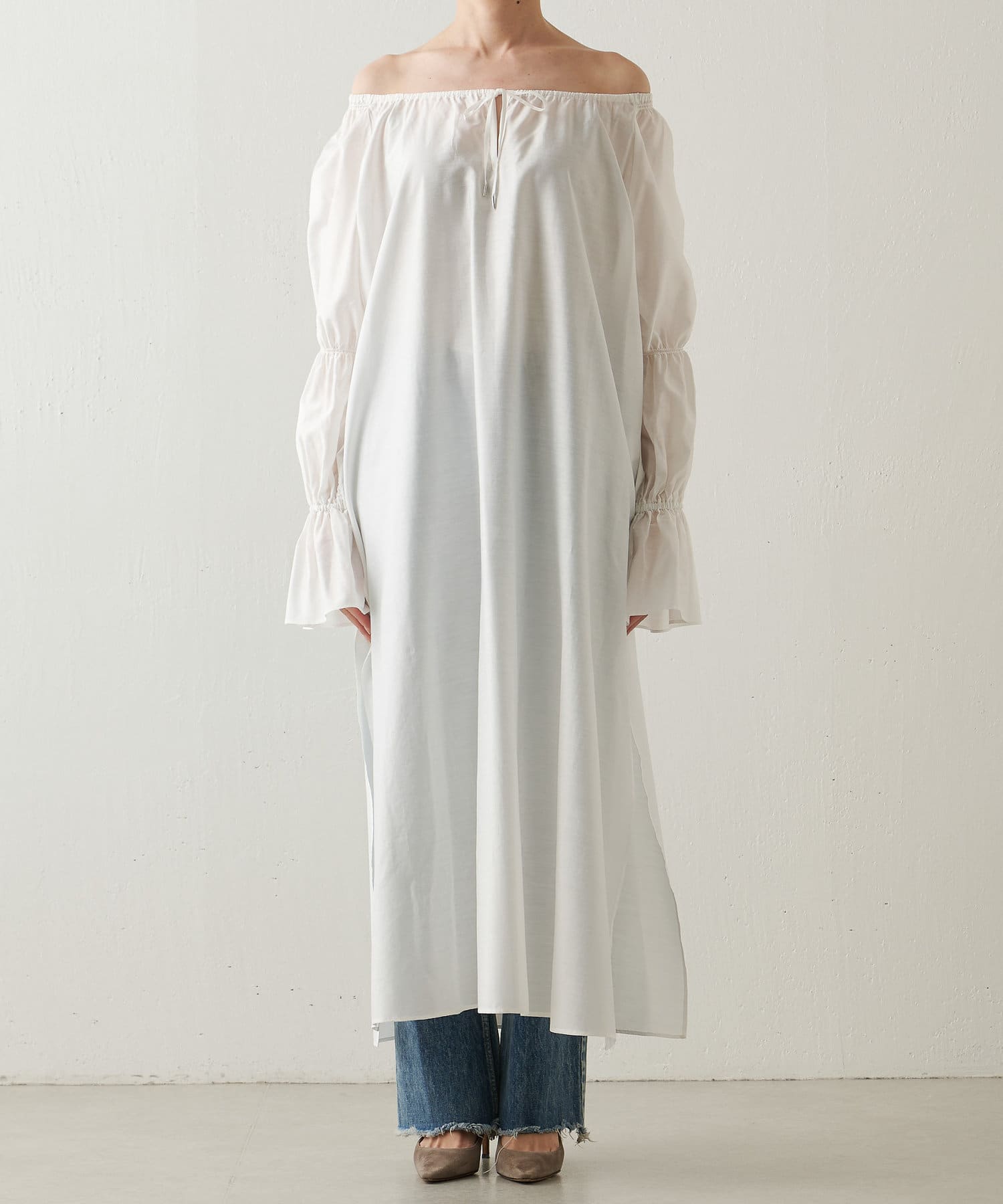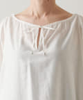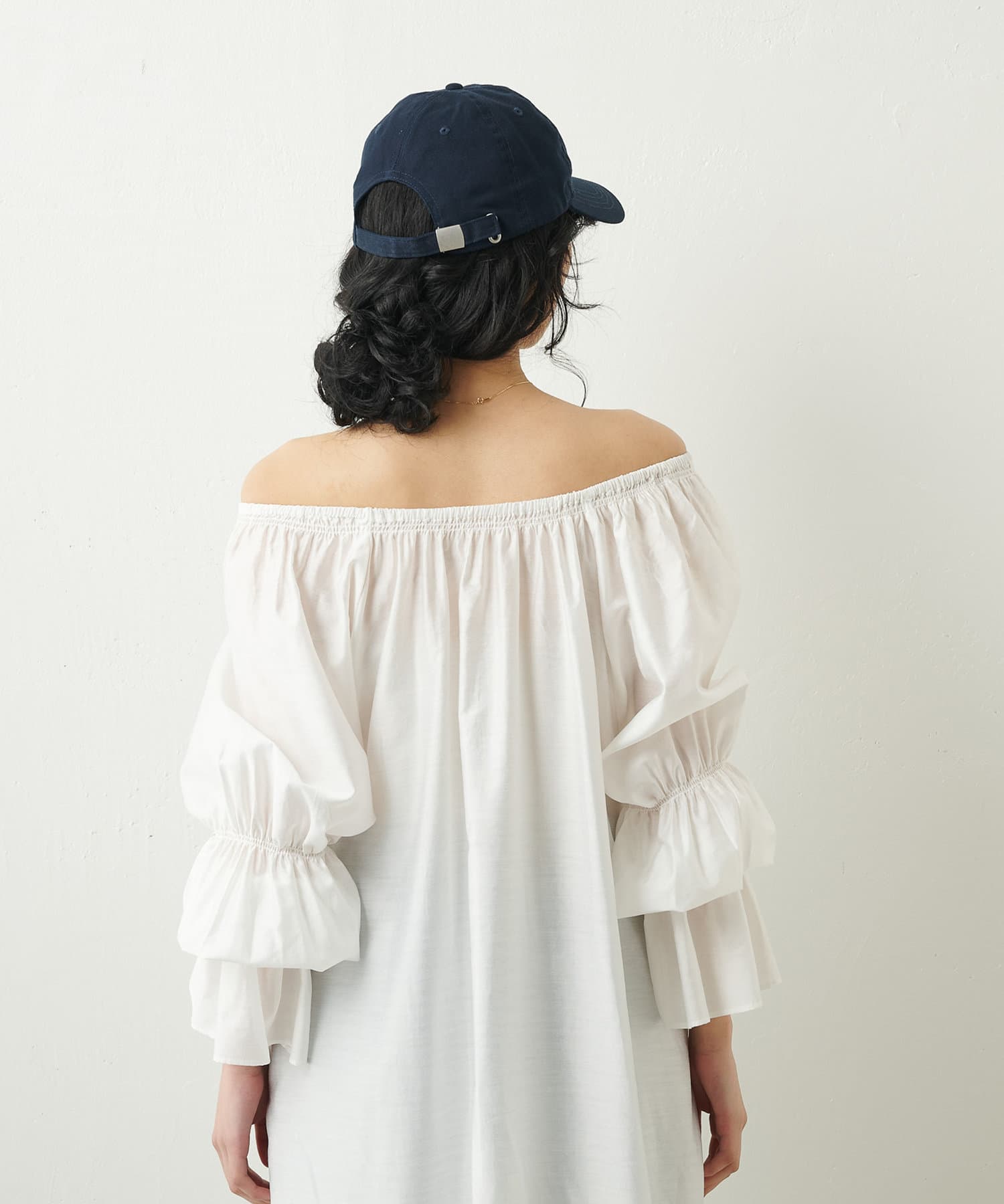 ■衿ぐりにはシャーリングを寄せ、フロント紐を緩める事でオフショルダーとしても着用可能。