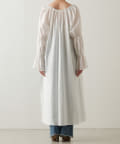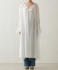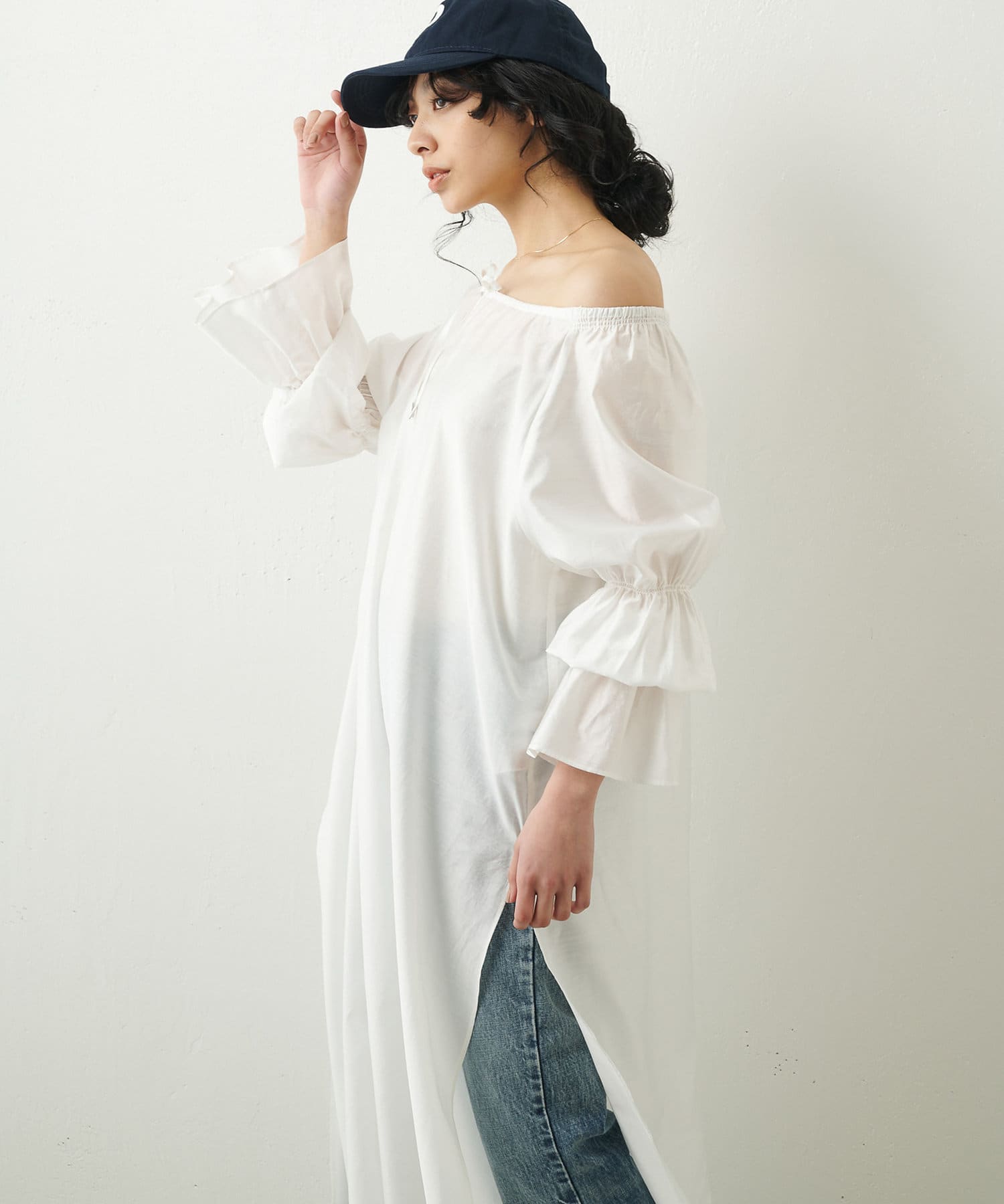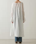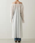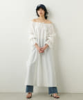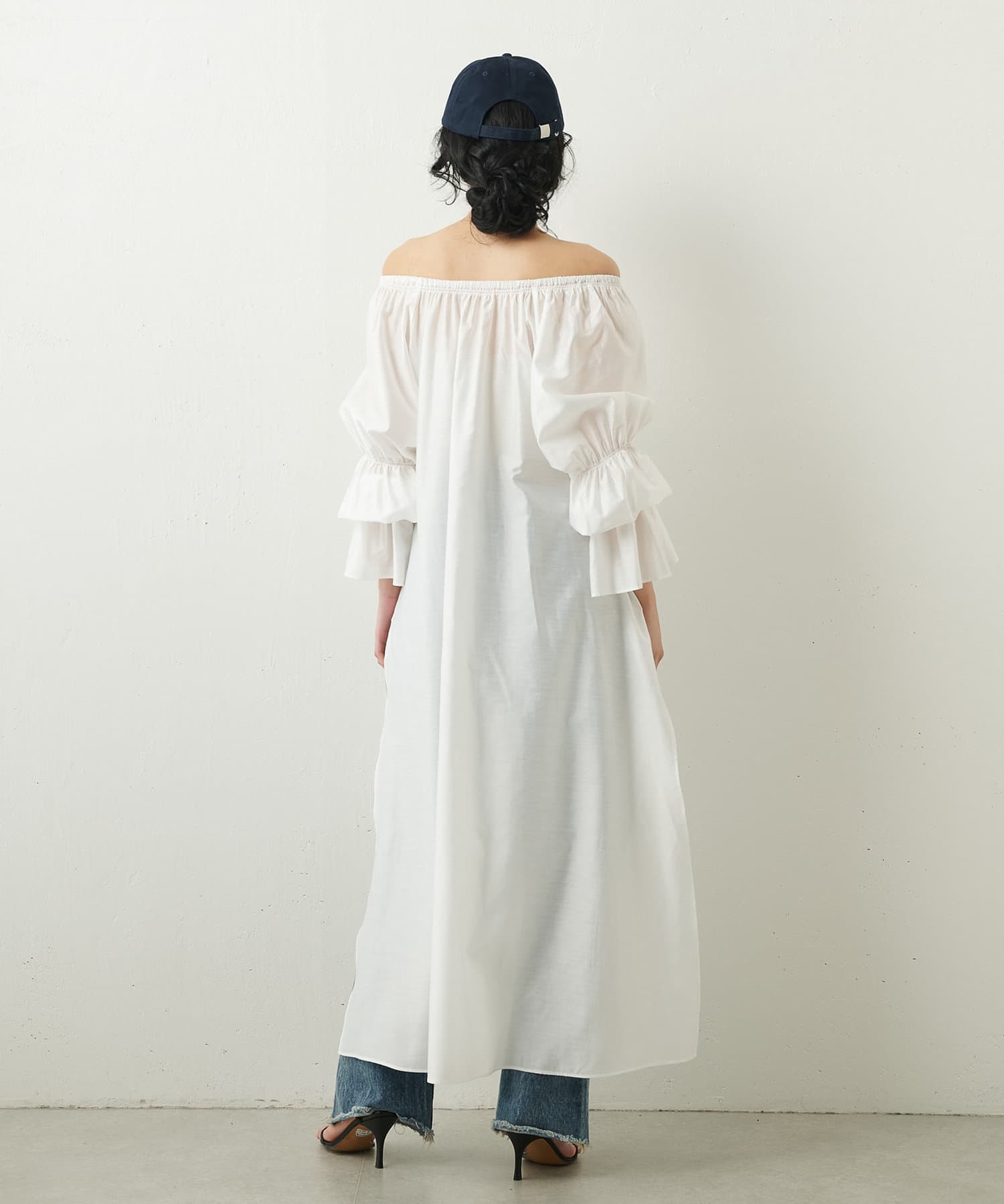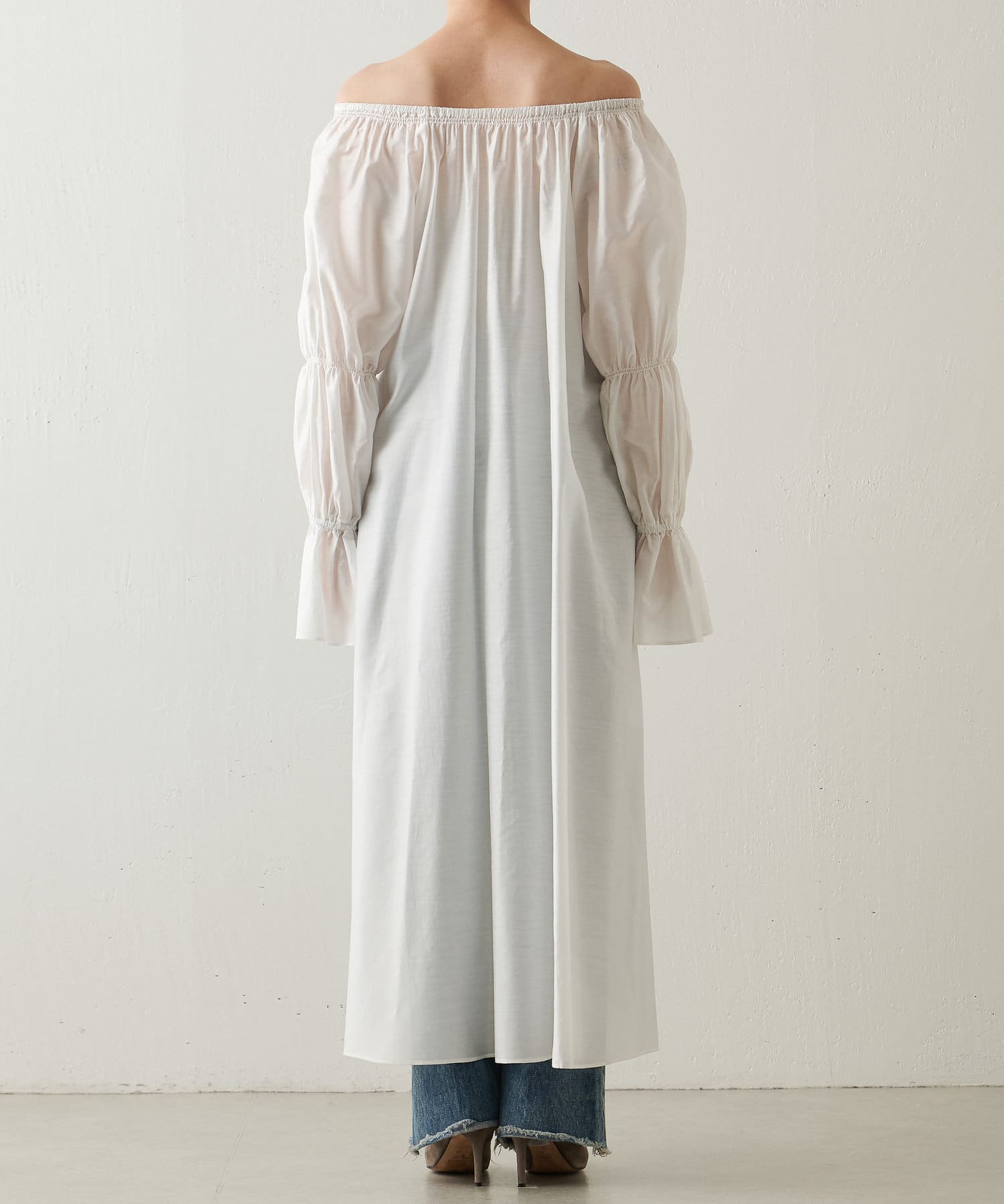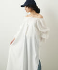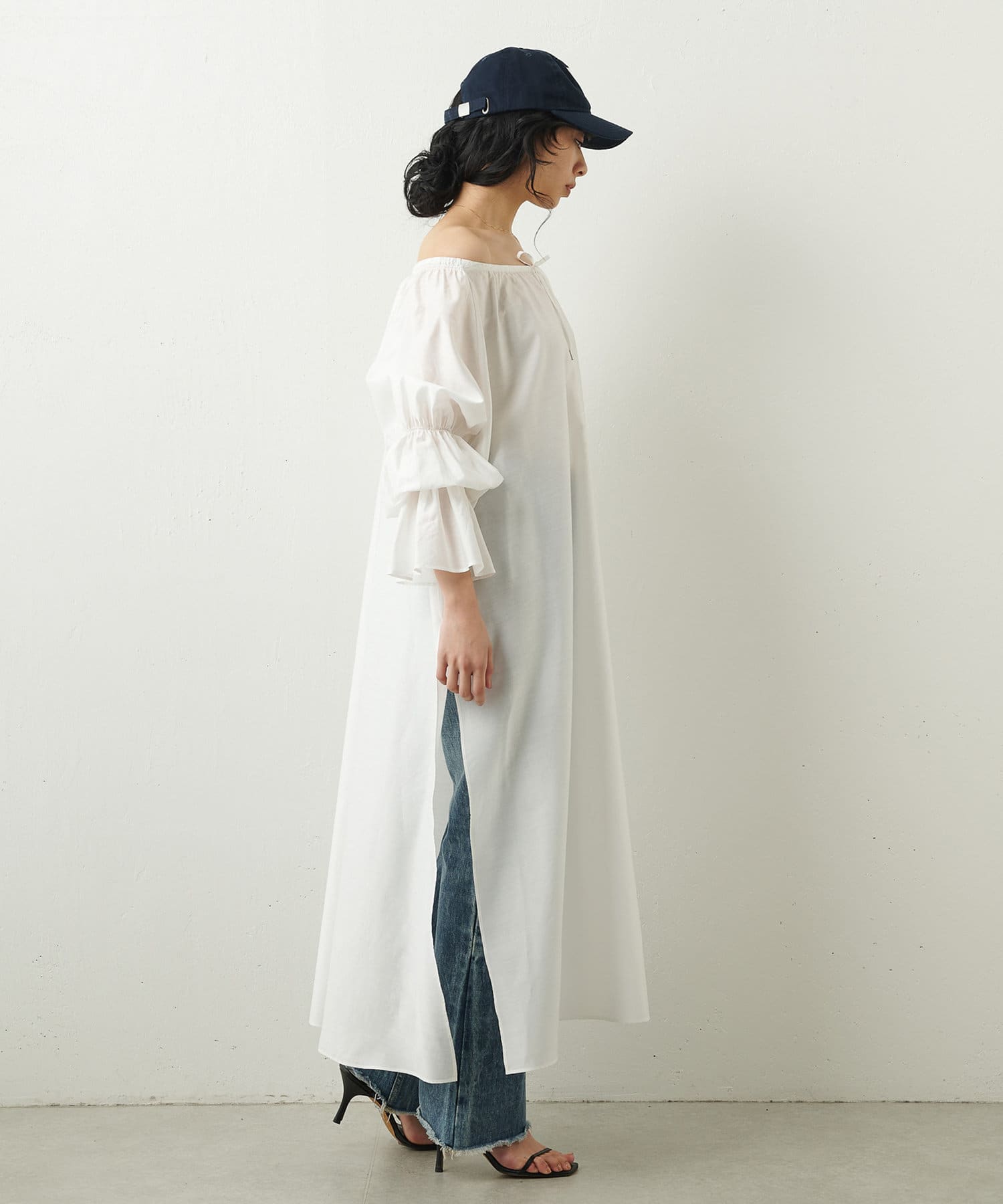 ■衿ぐりにはシャーリングを寄せ、フロント紐を緩める事でオフショルダーとしても着用可能。