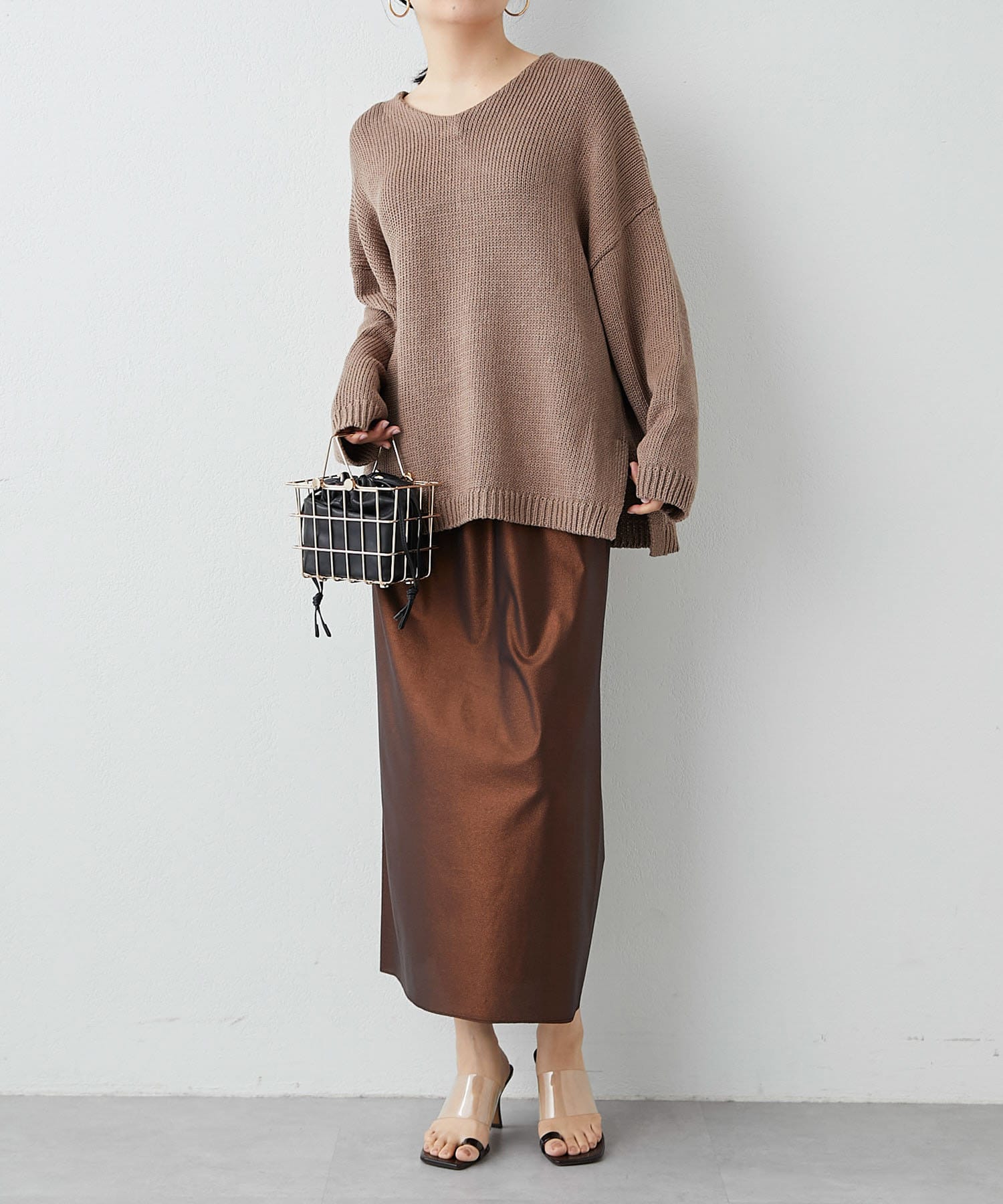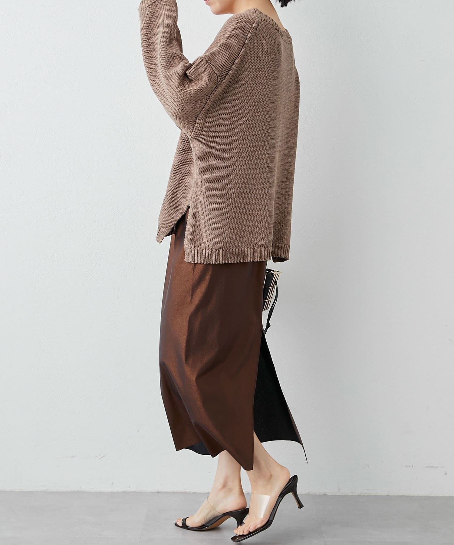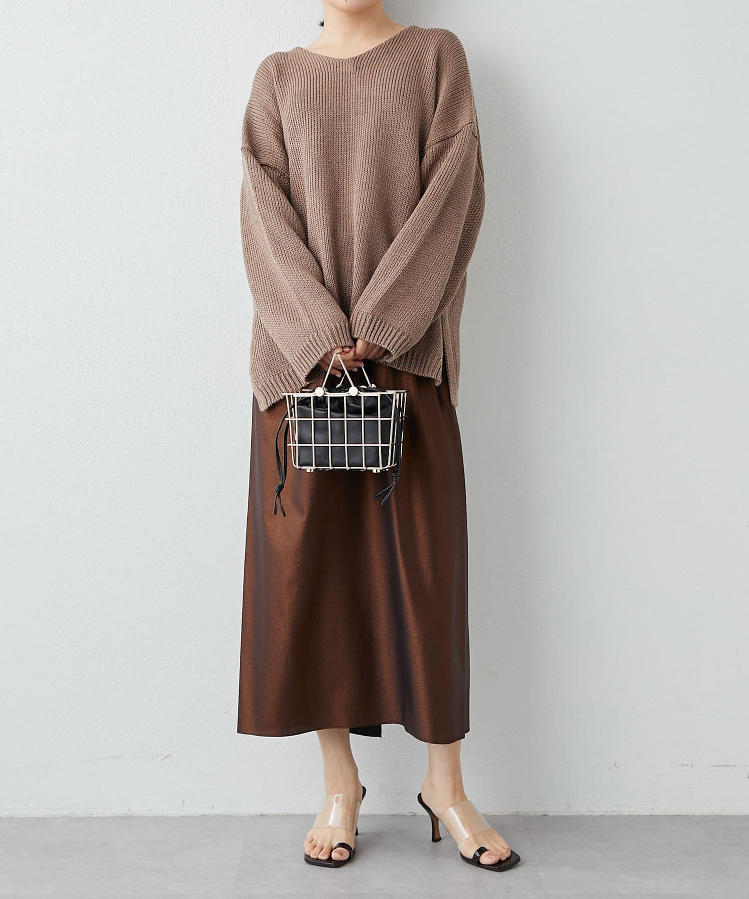 ■すっきりとしたパンツや細身のスカートに合わせてニットの緩さを引き立てるスタイリングもおすすめ。