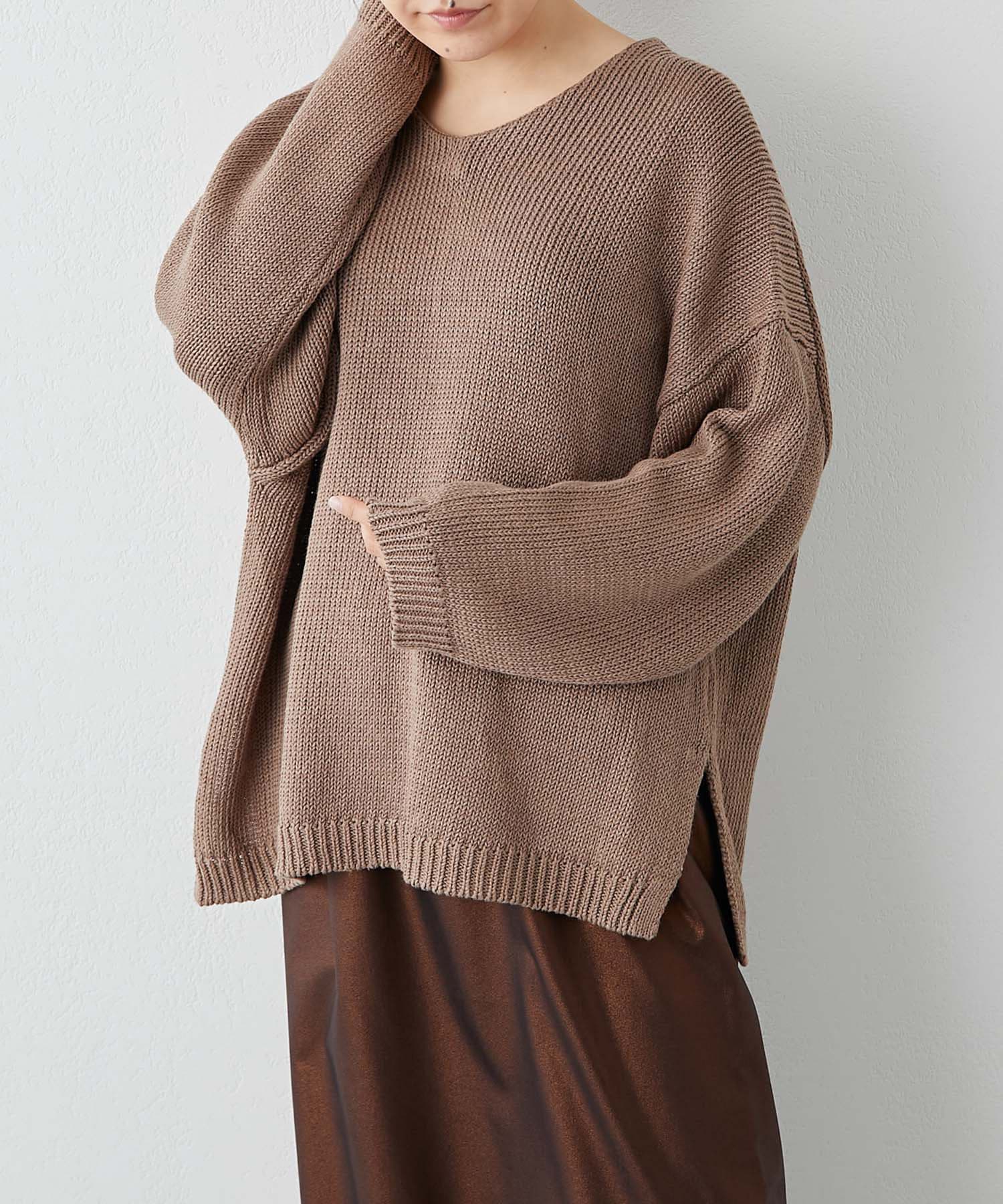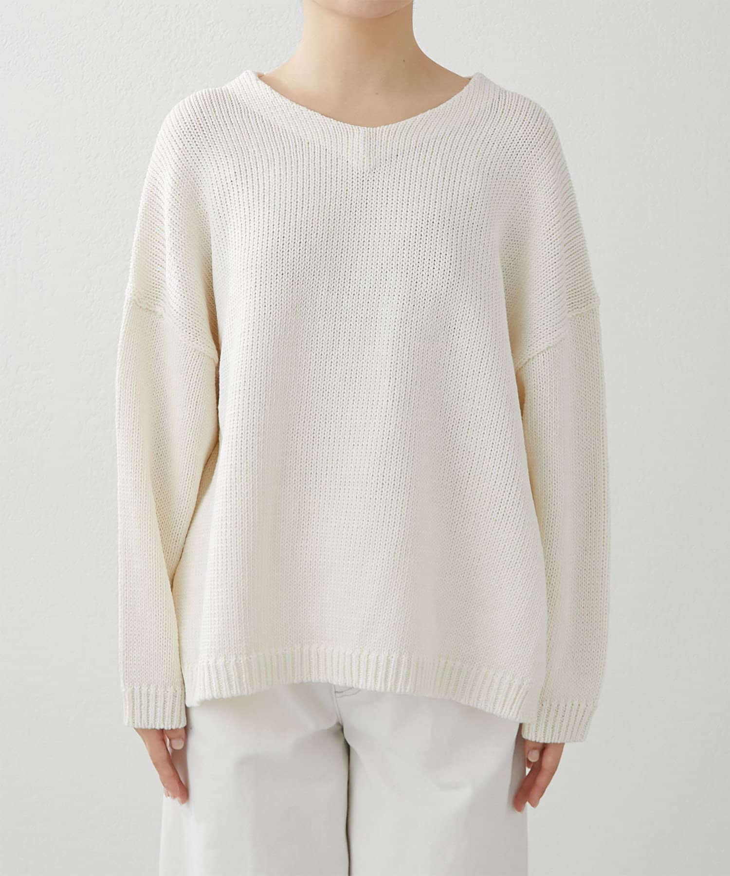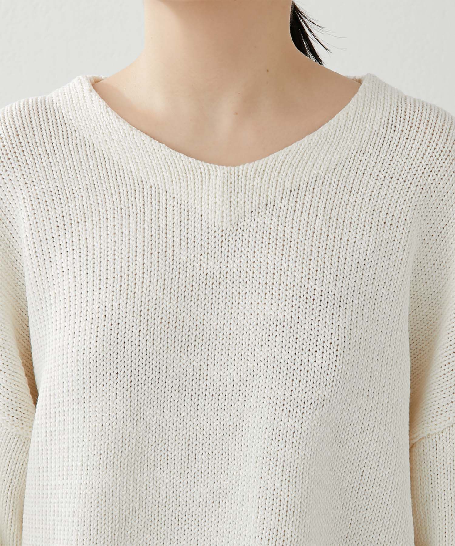 ■ゆったりとしたシルエットながら、浅めのVネックがネックラインをきれいに演出。