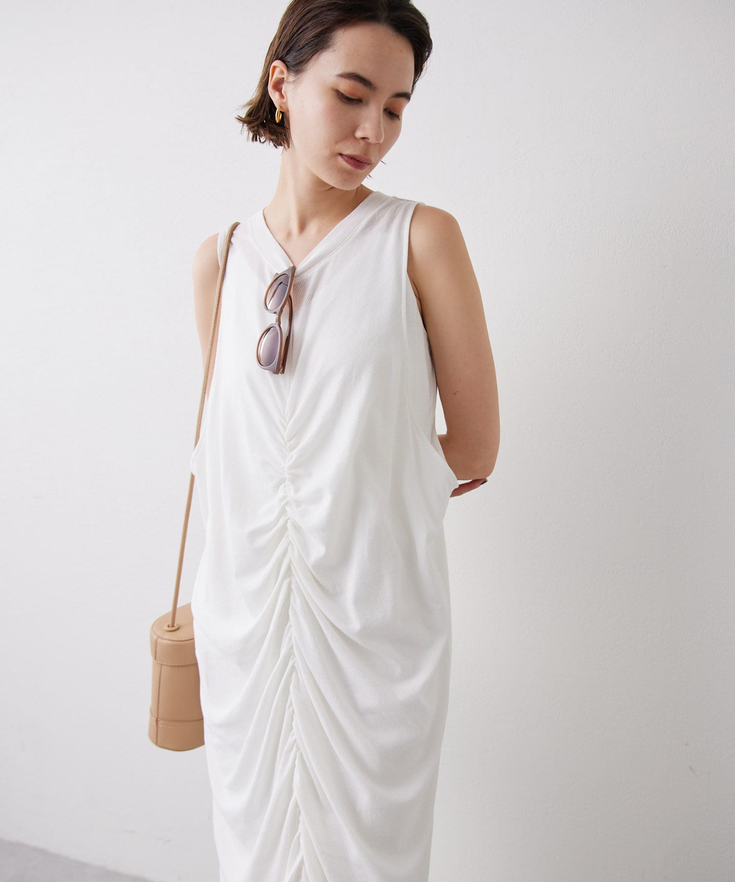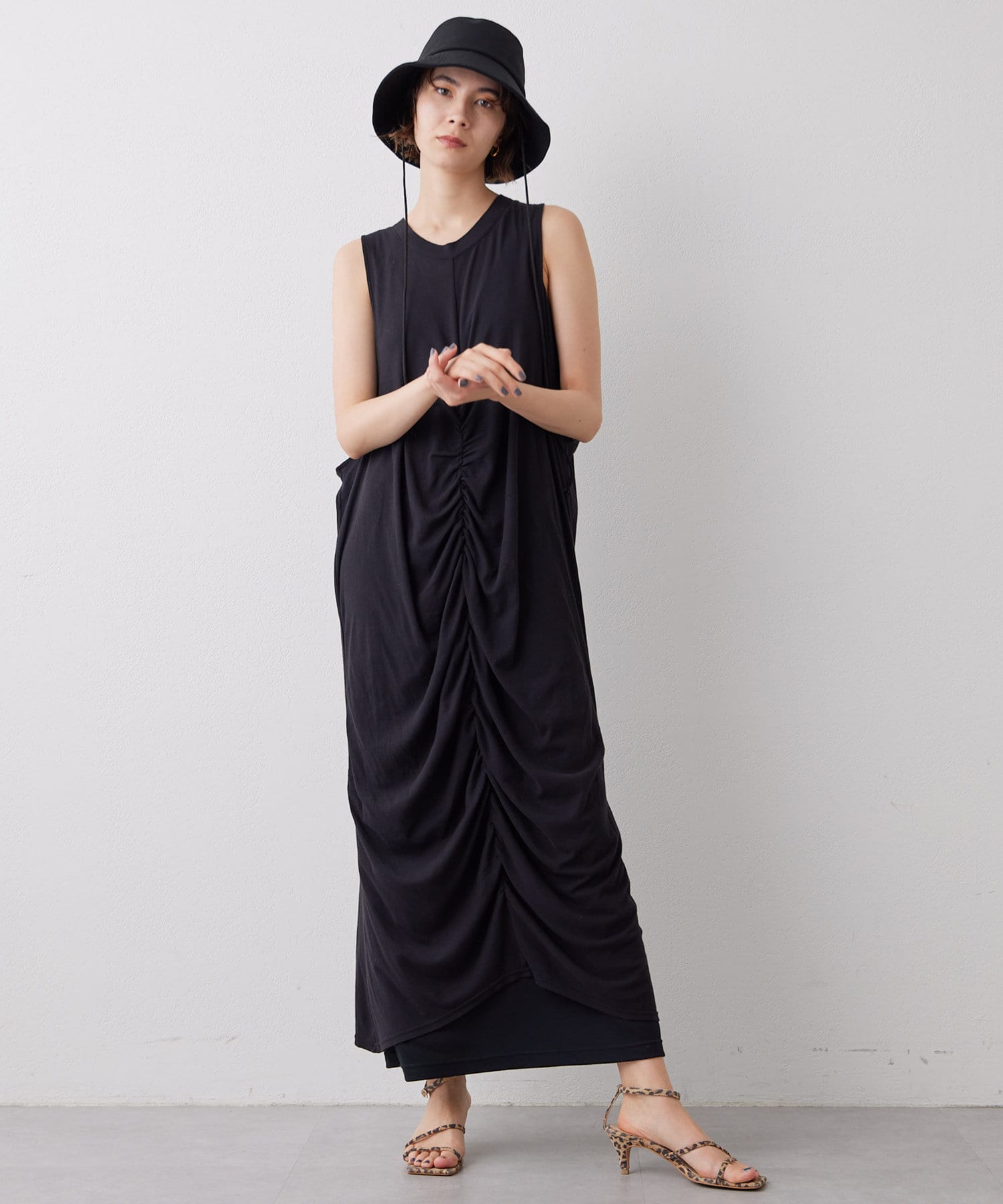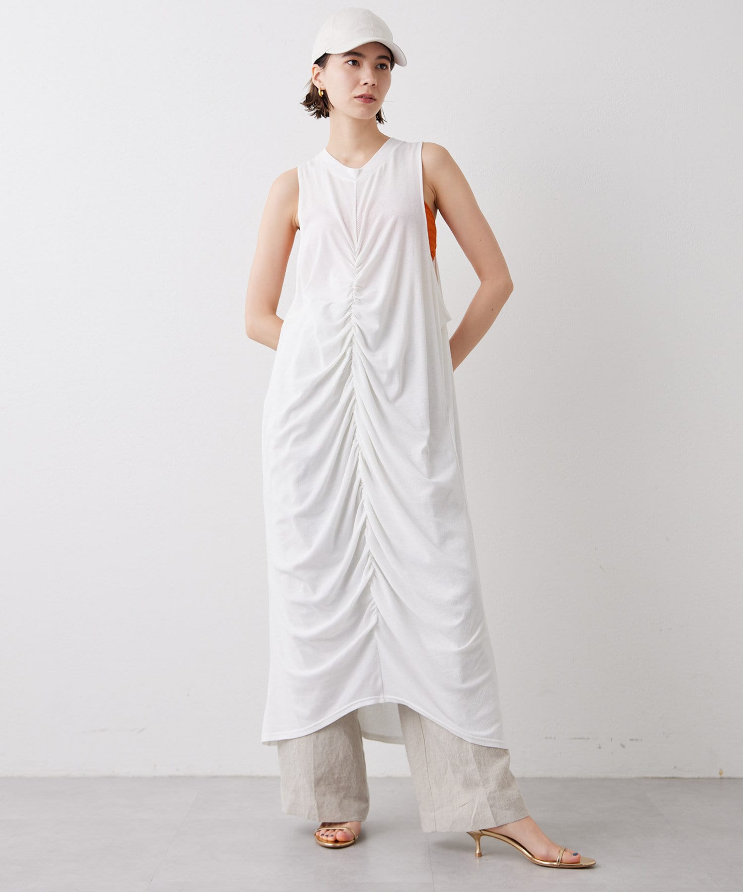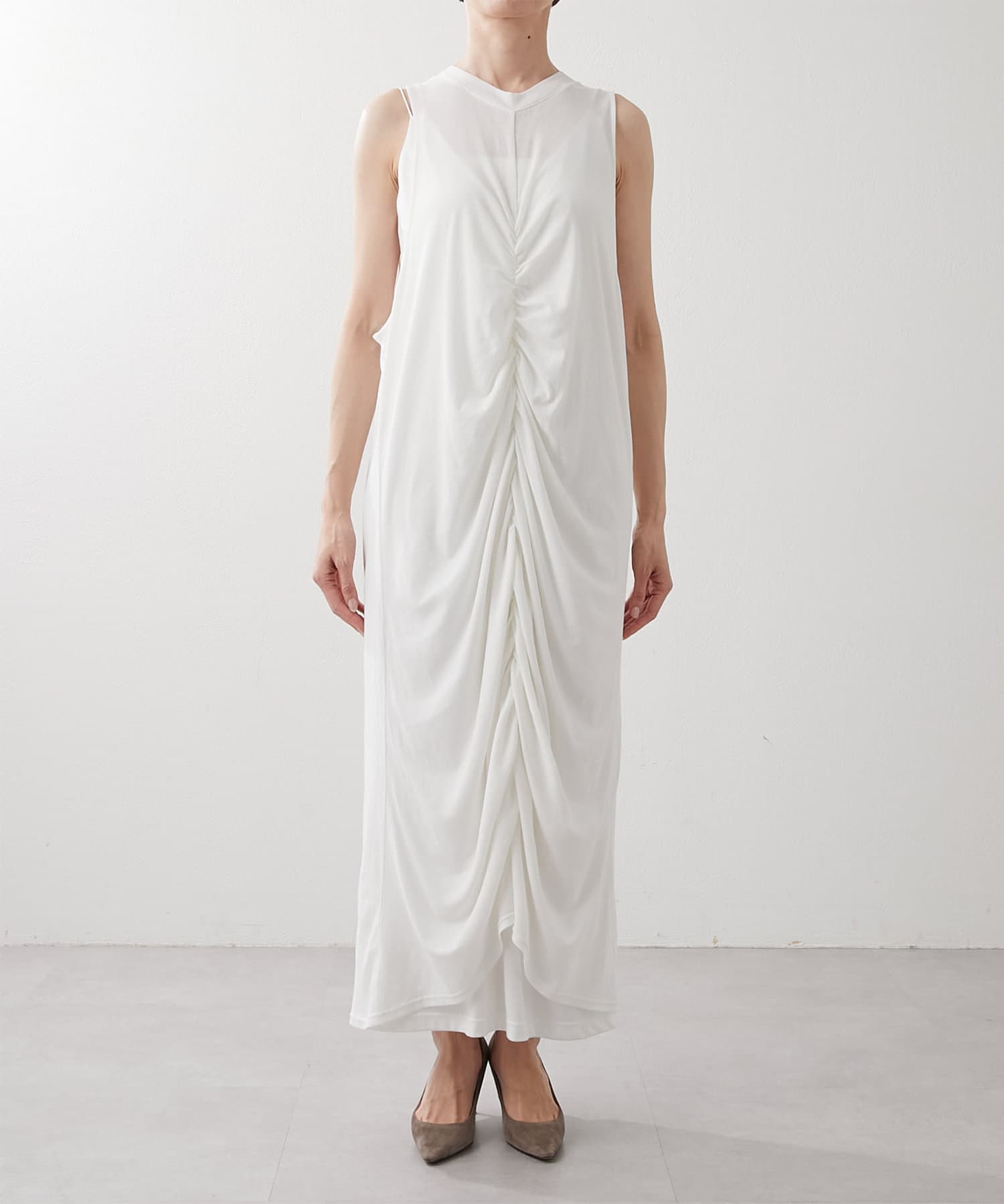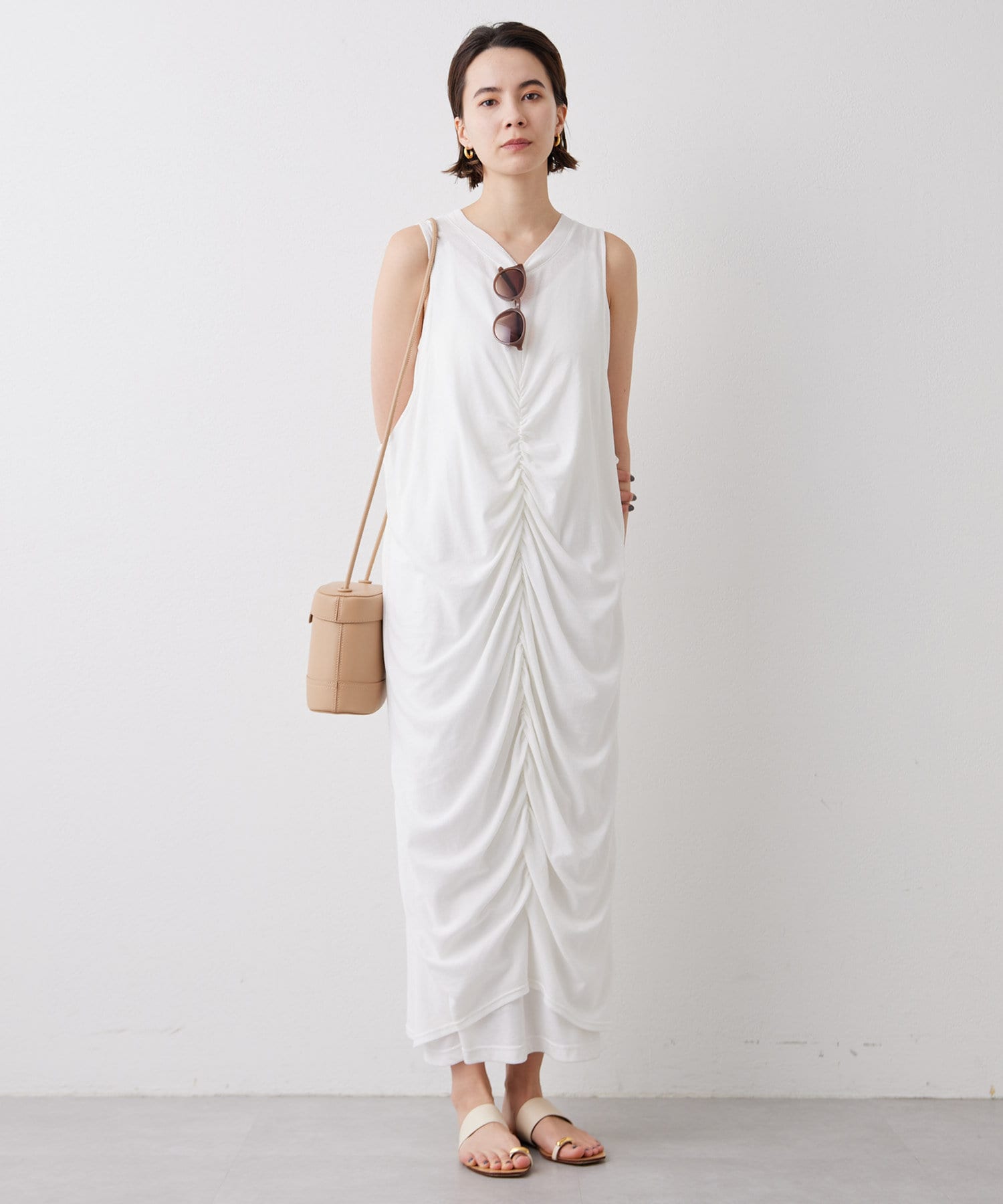 ■上に重ねるワンピースはフロントのシャーリングデザインがポイント。