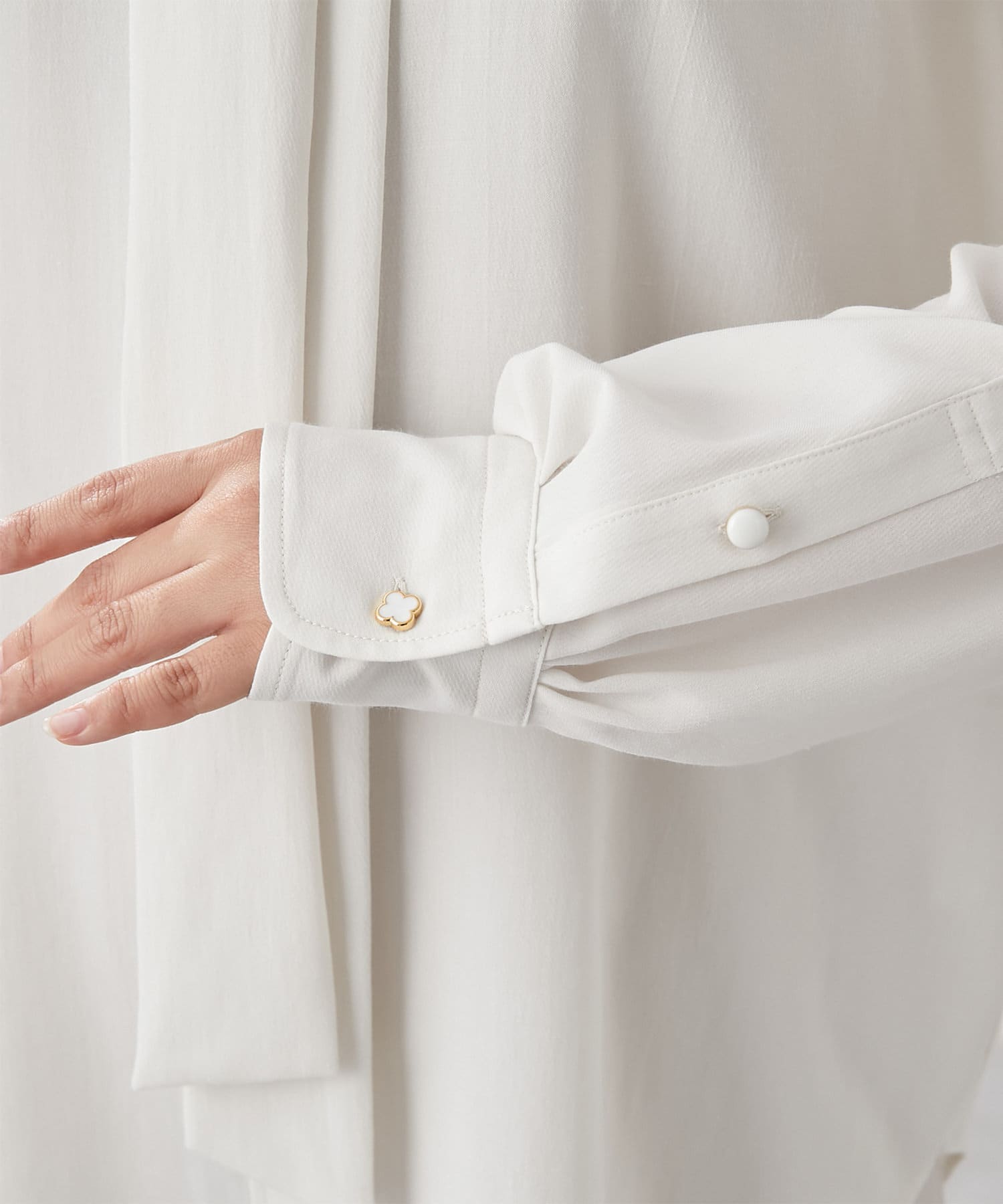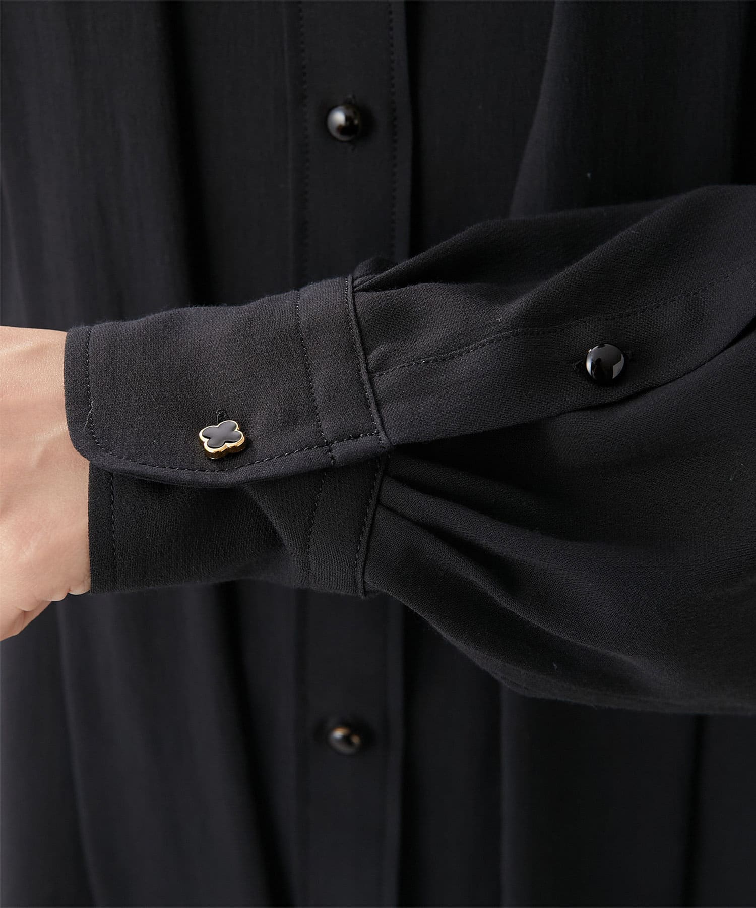 ■アジャスト可能な袖口カフスに施したクローバー型のボタンがポイント。