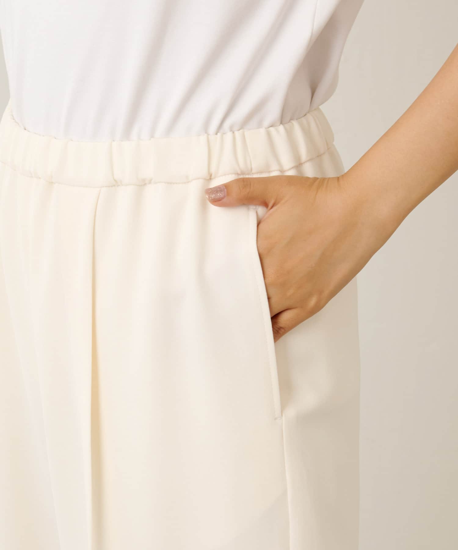 ウエストゴムデザインですが、トップスをインした際にも綺麗に整います。落ち感のある素材は、シンプルなスタイリングもどこか女性らしく見せてくれます。ウエスト紐をぎゅっと絞ればサイズ調節もでき、細身の私でも落ちてきませんでした。