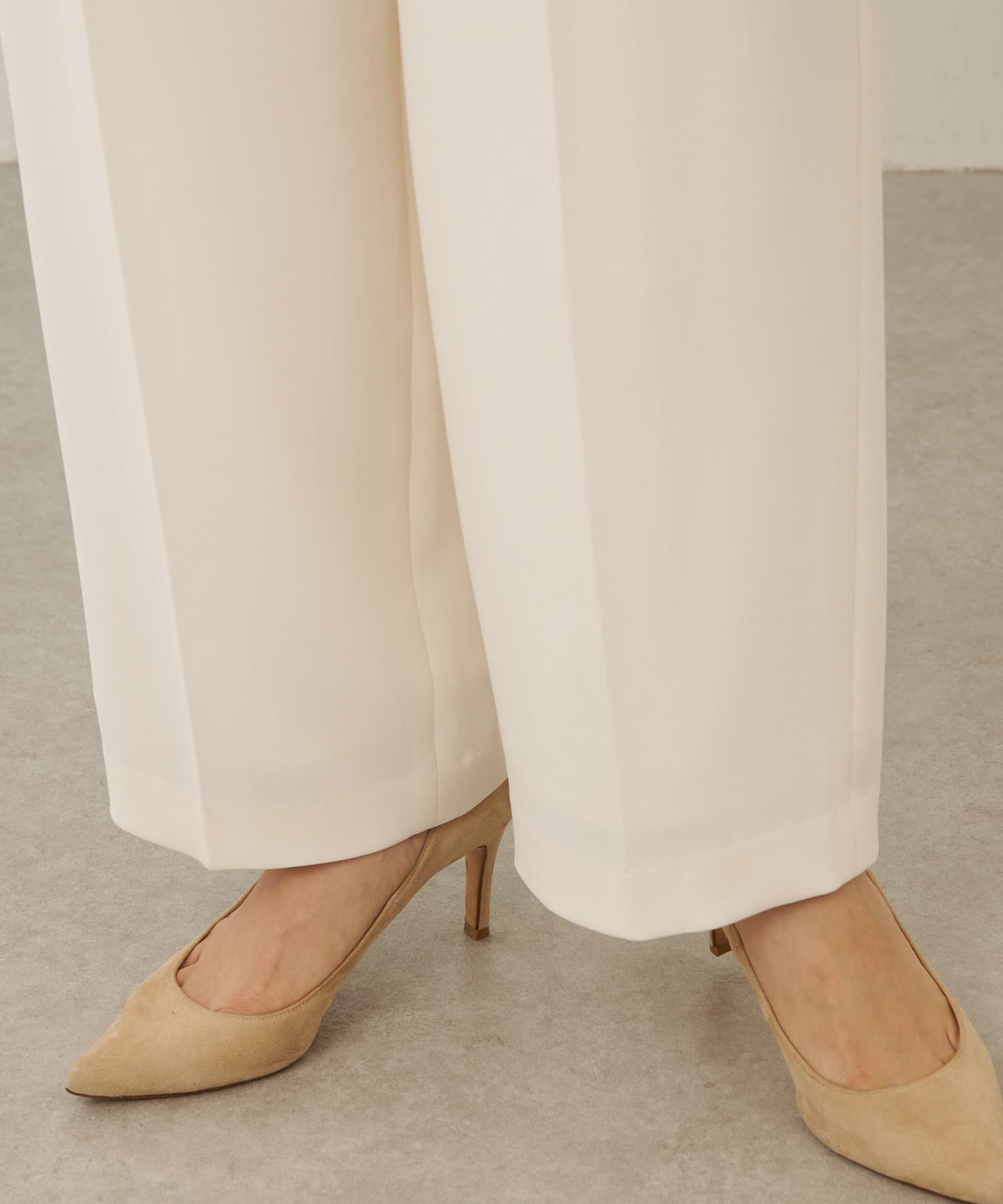 楽してきれい見えするイージーパンツ。生地のとろみと落ち感が雰囲気を出してくれます。着回し力のある一枚。イージーパンツでカジュアルな印象を受けがちですが、センタープレスがきちんと感も出してくれるのでオフィスカジュアルにも◎です。少しハリを感じられるところが、上品です。