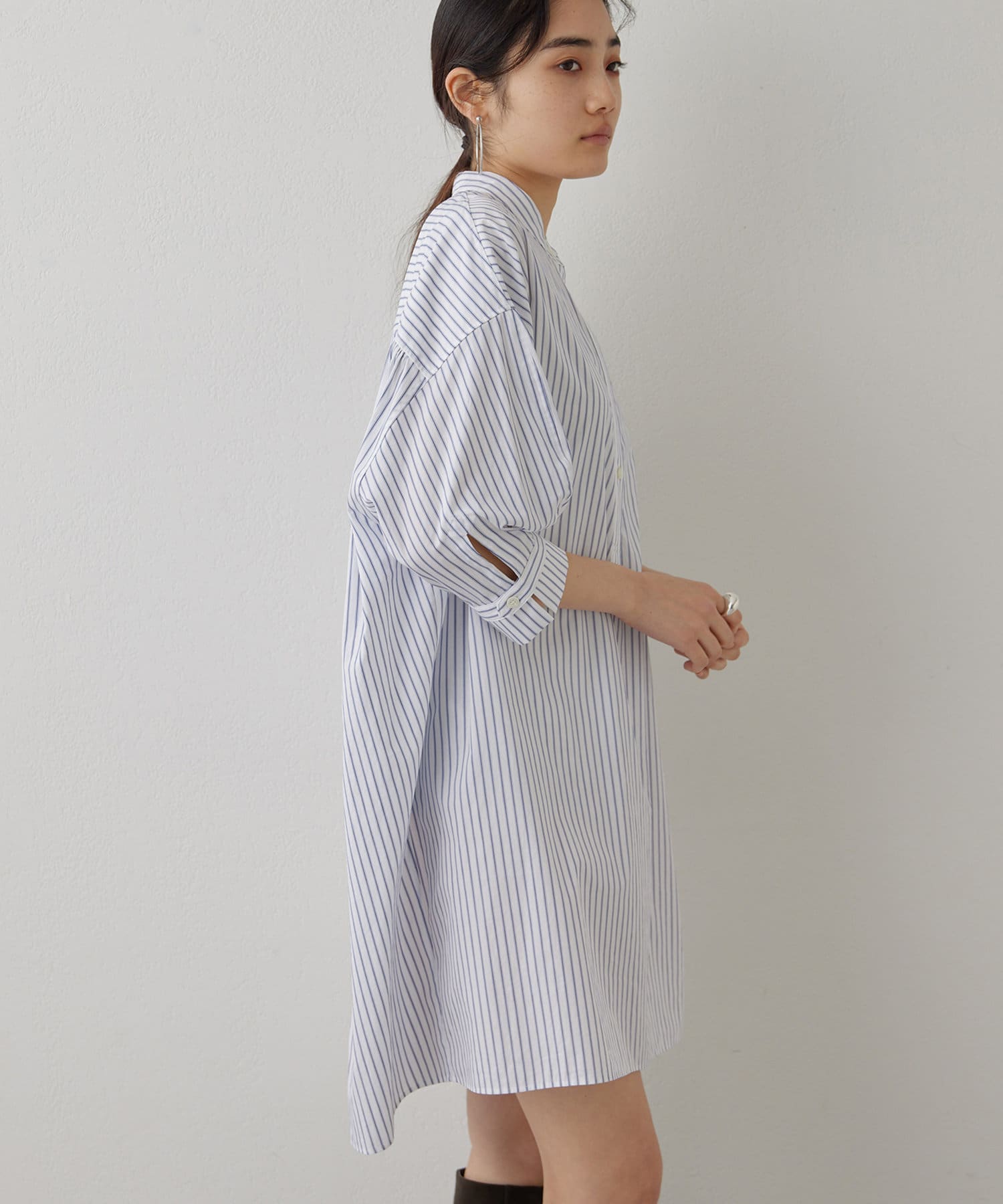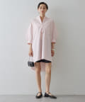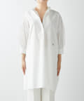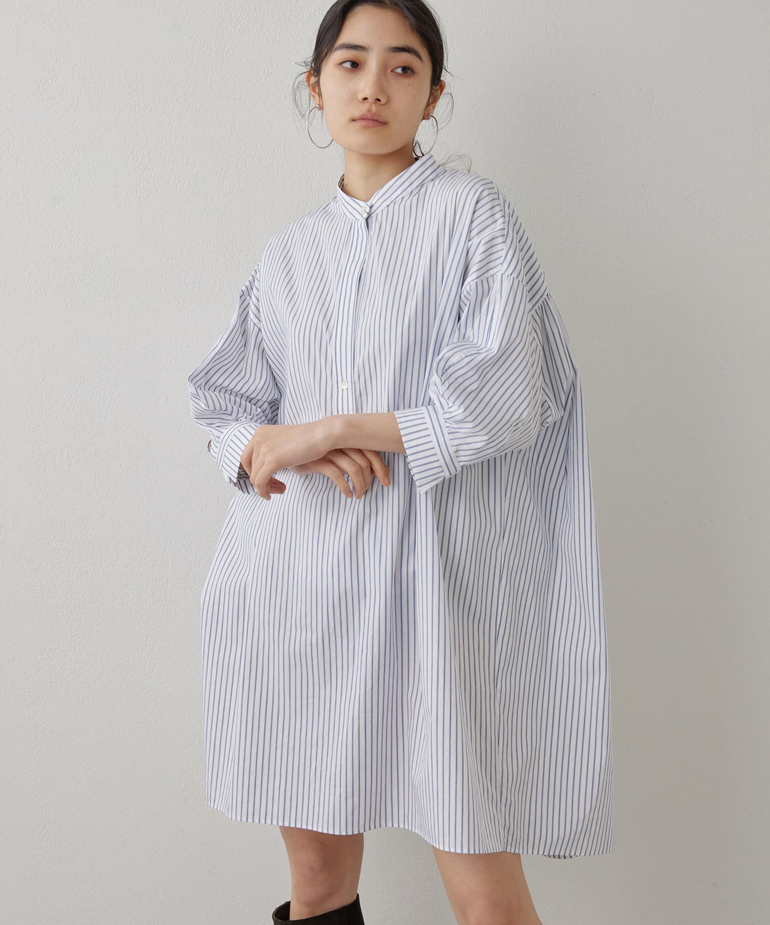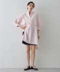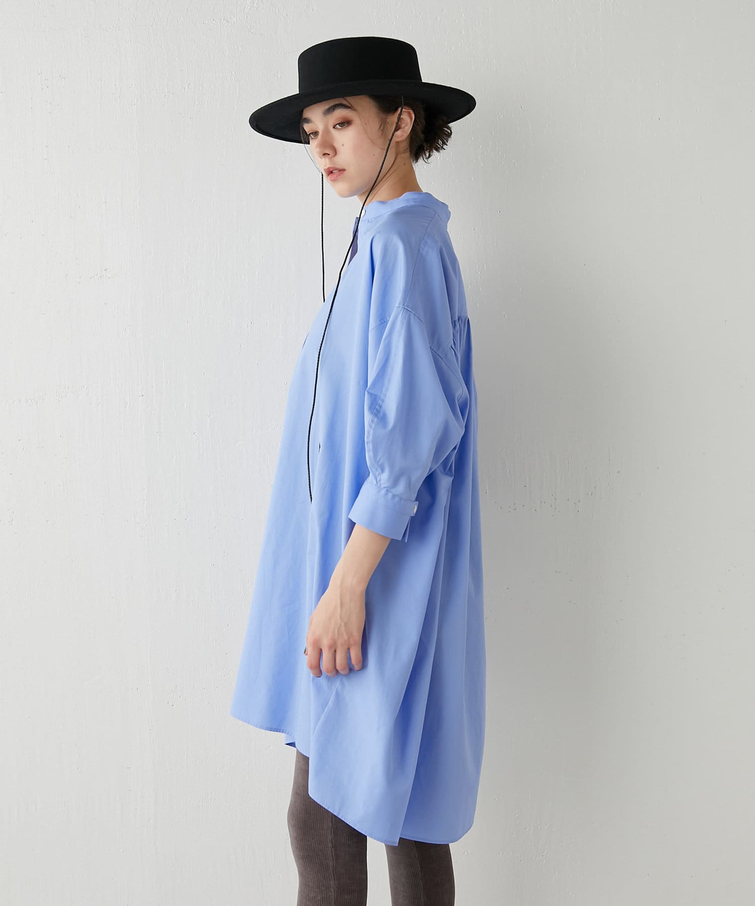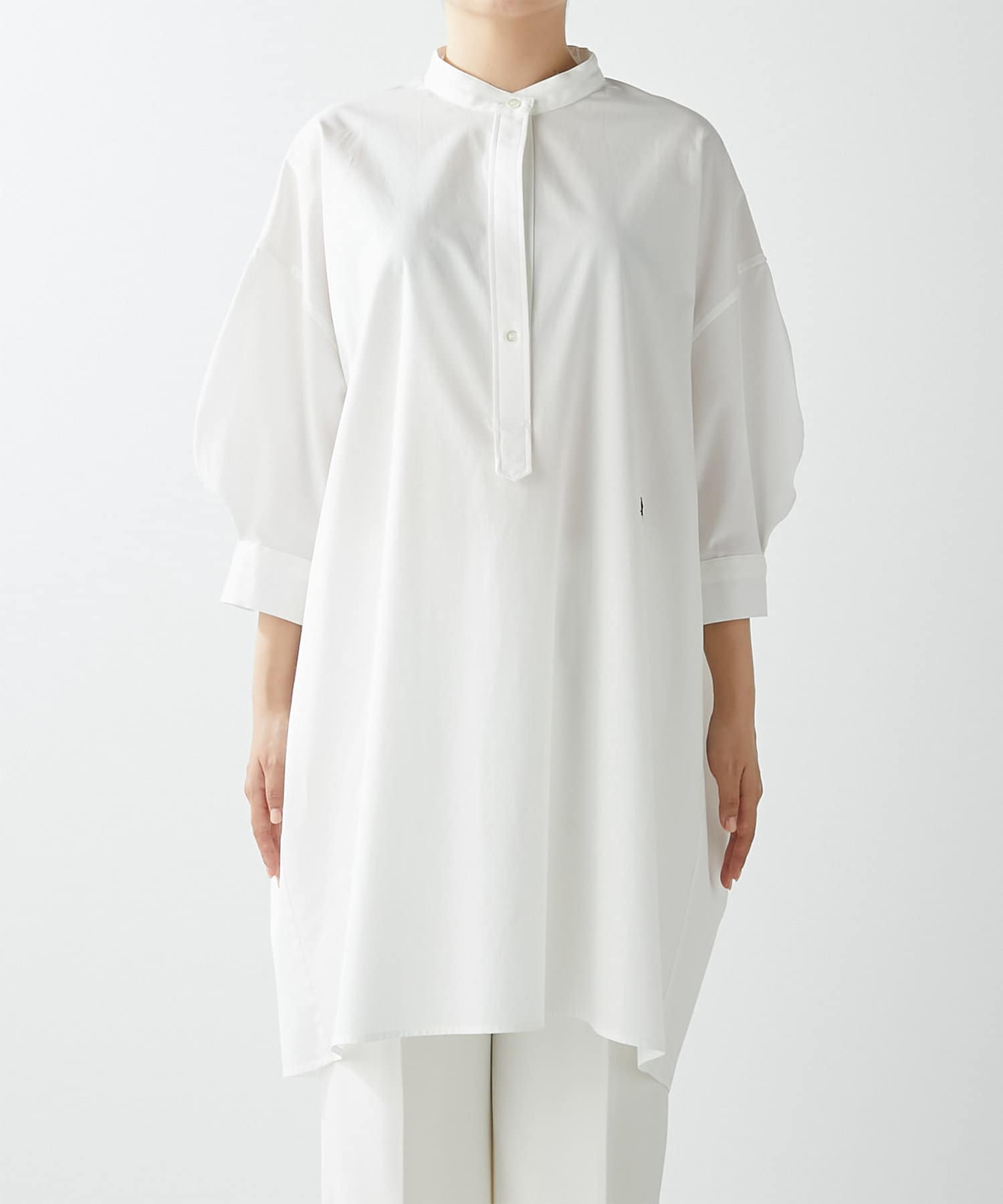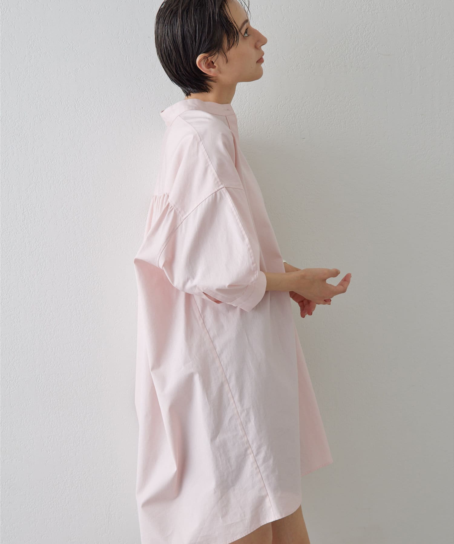 今っぽいビッグシルエットなシャツチュニックです。ハリのある綿素材で、一枚で着映えします。スタンドカラー仕様なので顔周りはスッキリと見せてくれます。