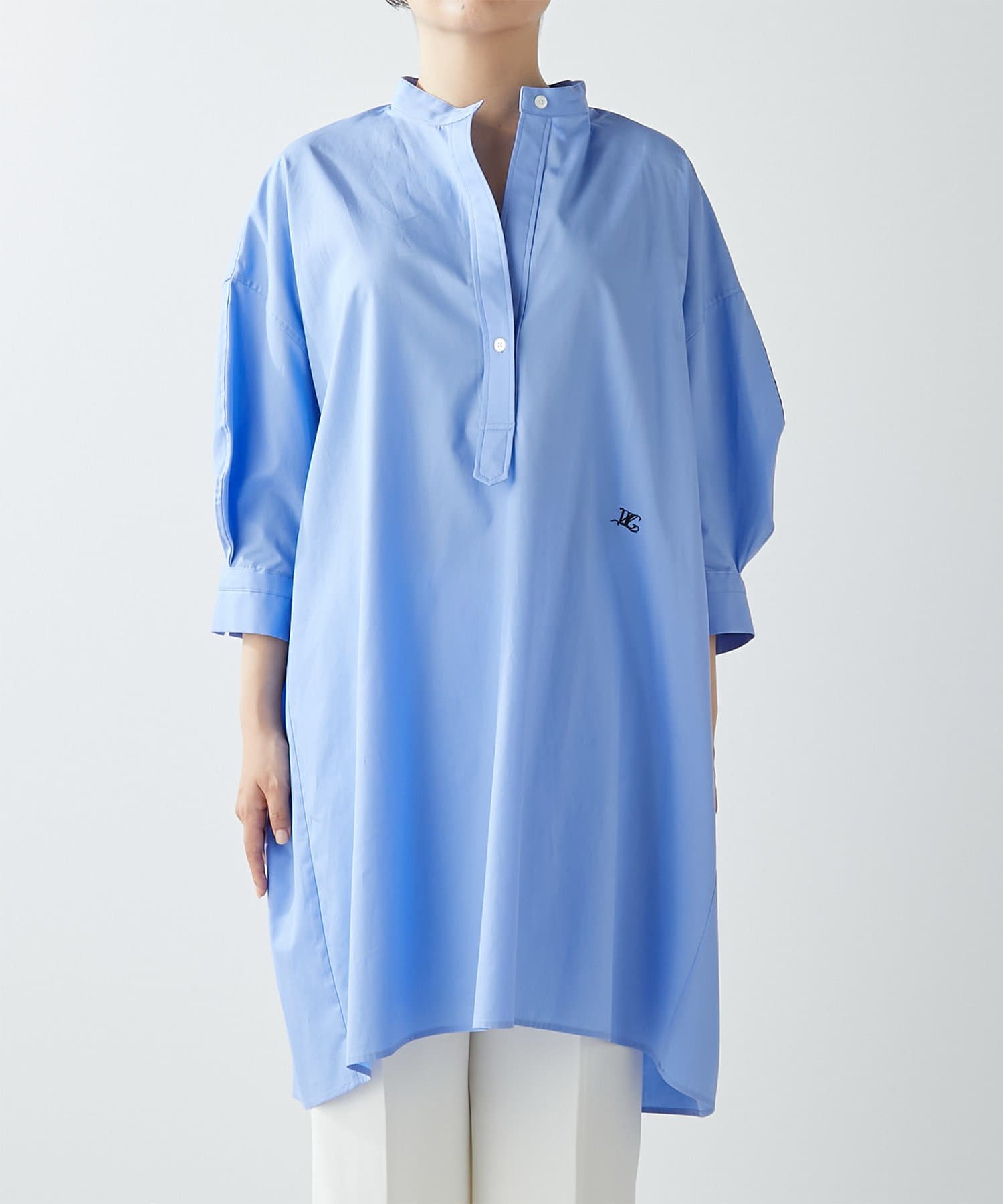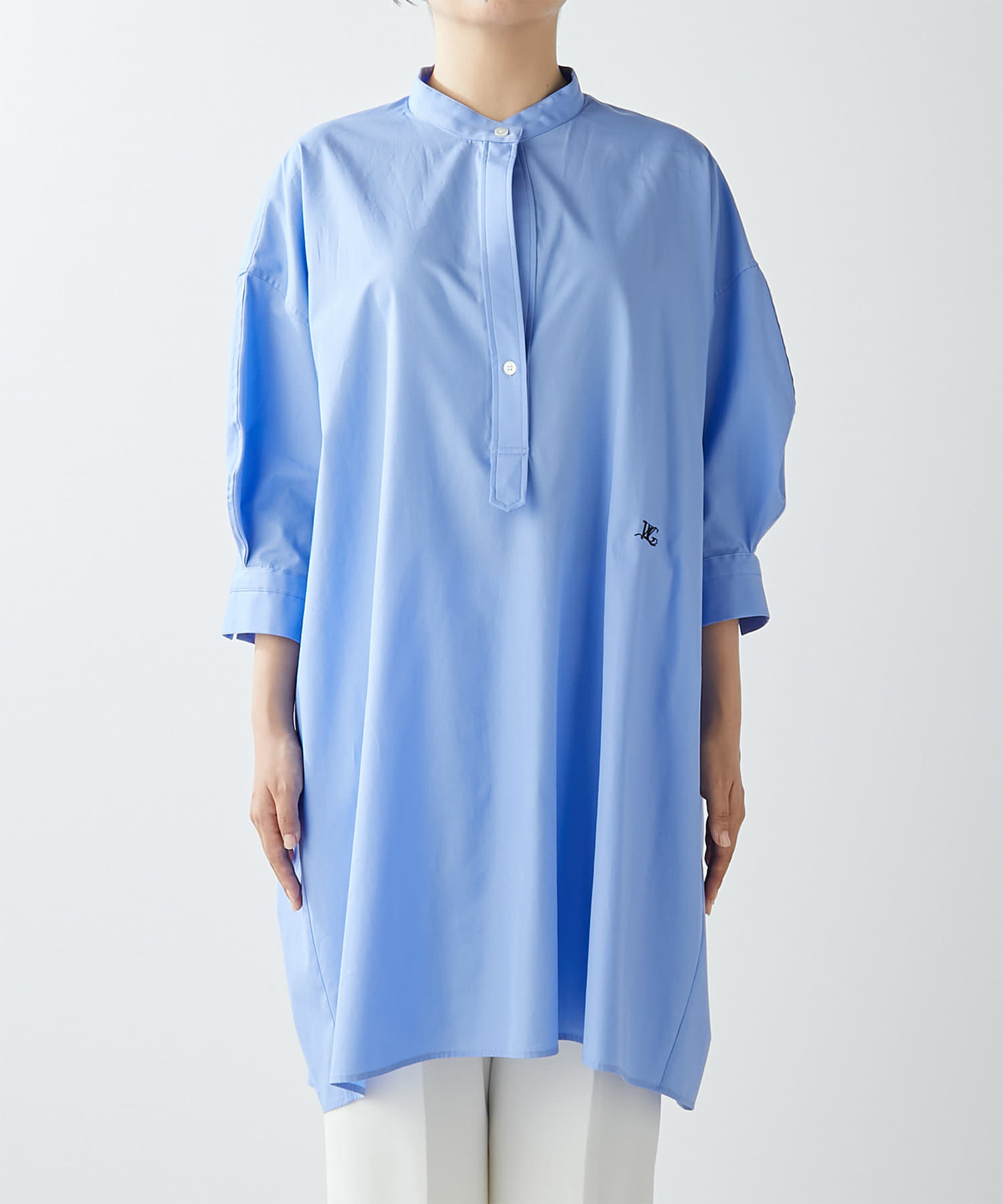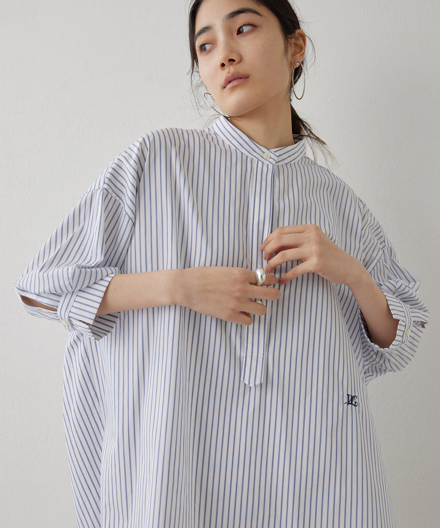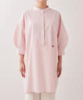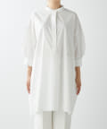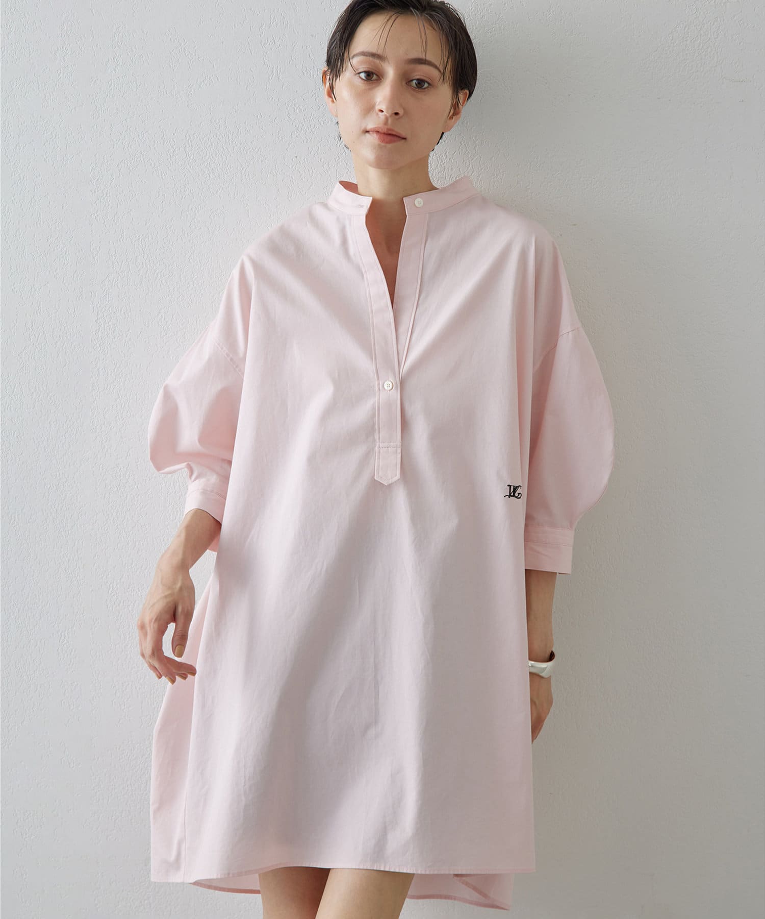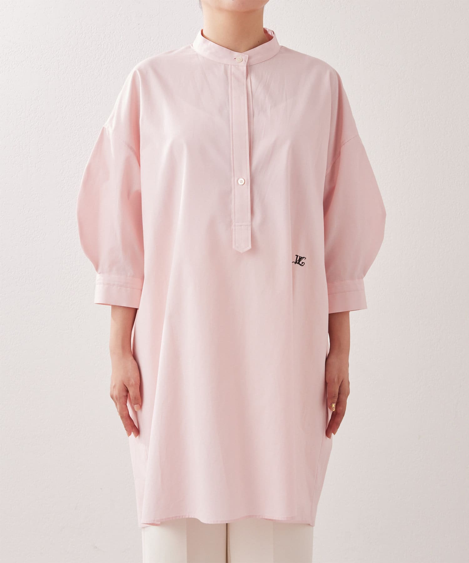 今っぽいビッグシルエットなシャツチュニックです。ハリのある綿素材で、一枚で着映えします。スタンドカラー仕様なので顔周りはスッキリと見せてくれます。