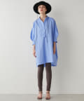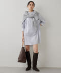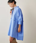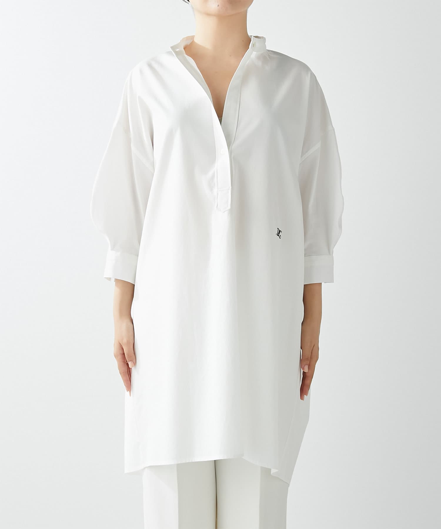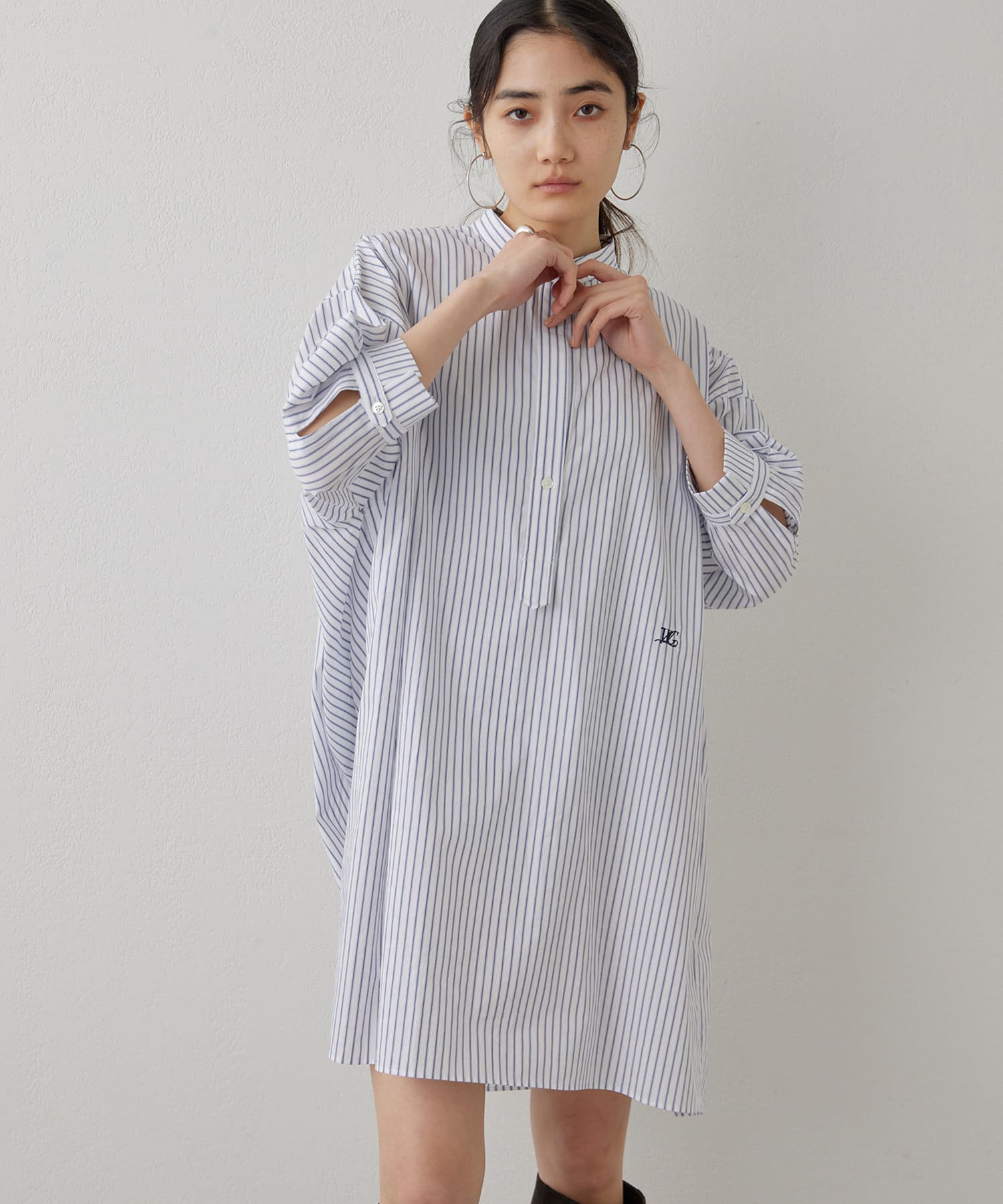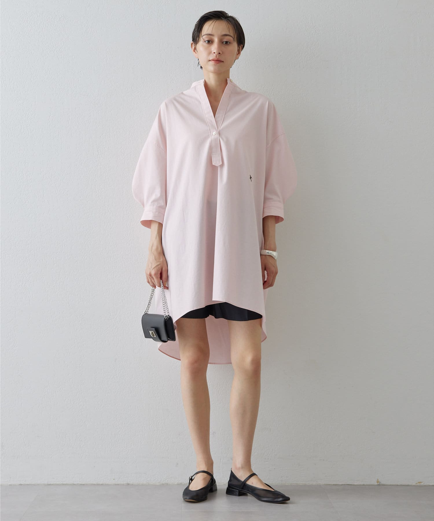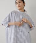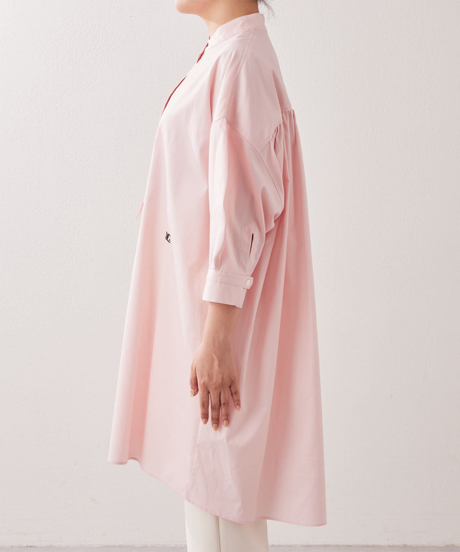 今っぽいビッグシルエットなシャツチュニックです。ハリのある綿素材で、一枚で着映えします。スタンドカラー仕様なので顔周りはスッキリと見せてくれます。
