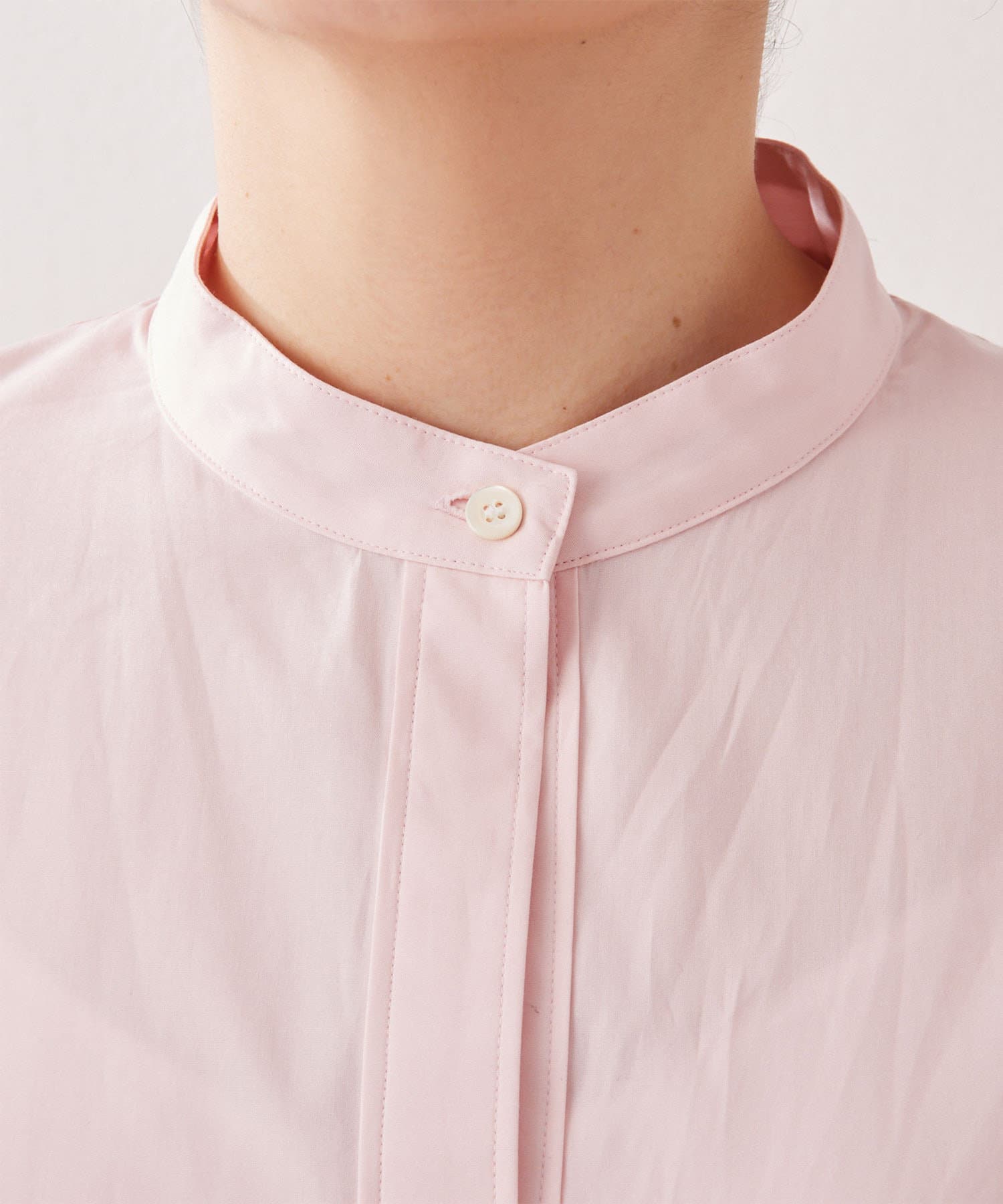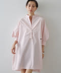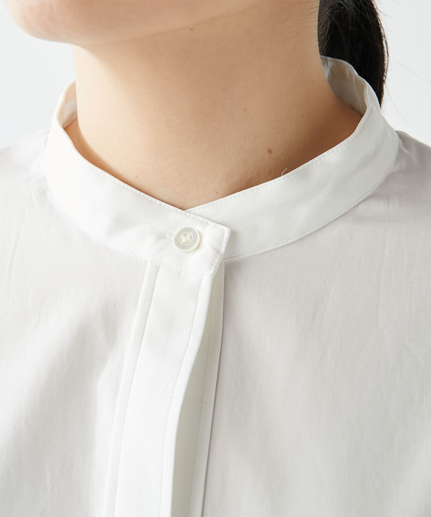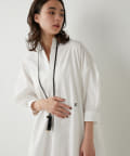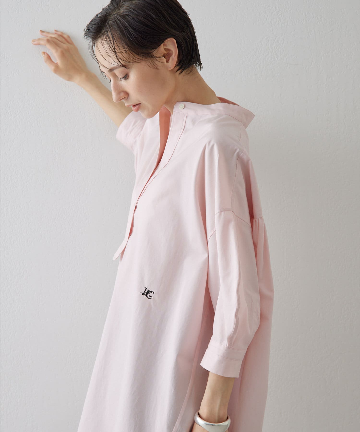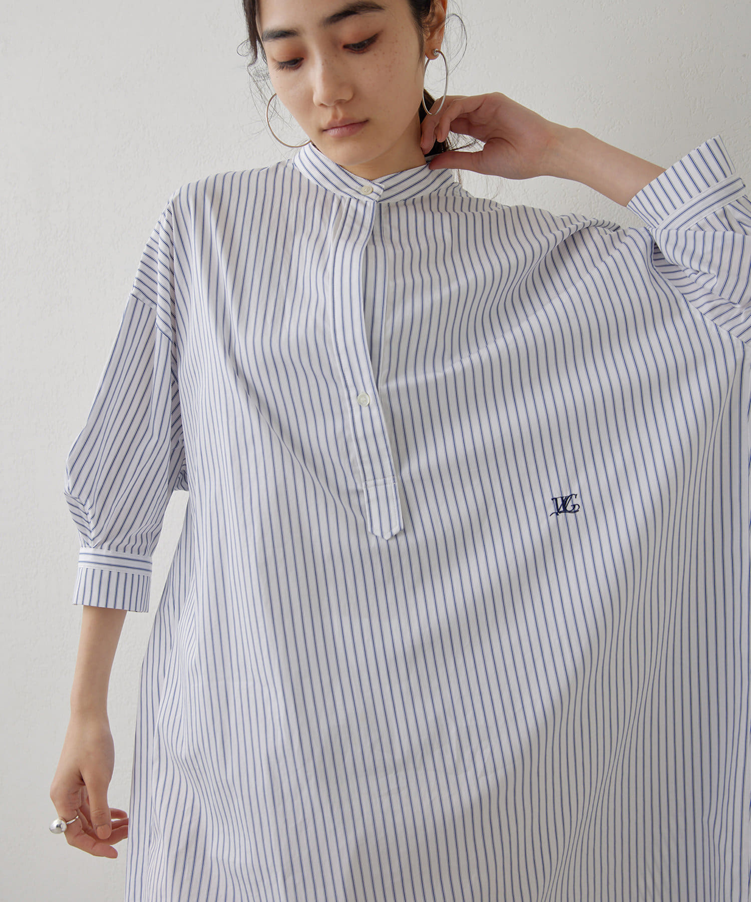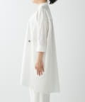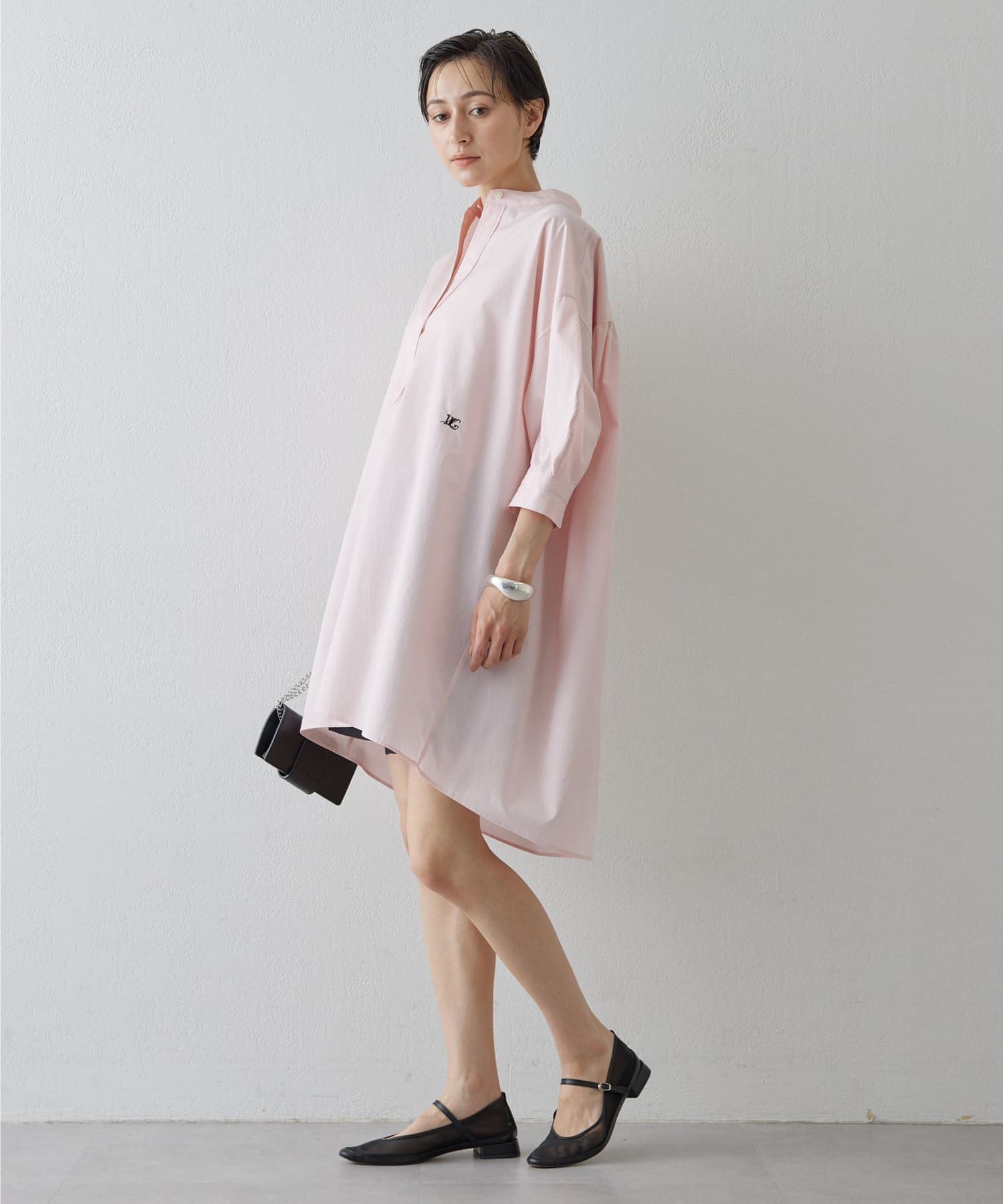 今っぽいビッグシルエットなシャツチュニックです。ハリのある綿素材で、一枚で着映えします。スタンドカラー仕様なので顔周りはスッキリと見せてくれます。
