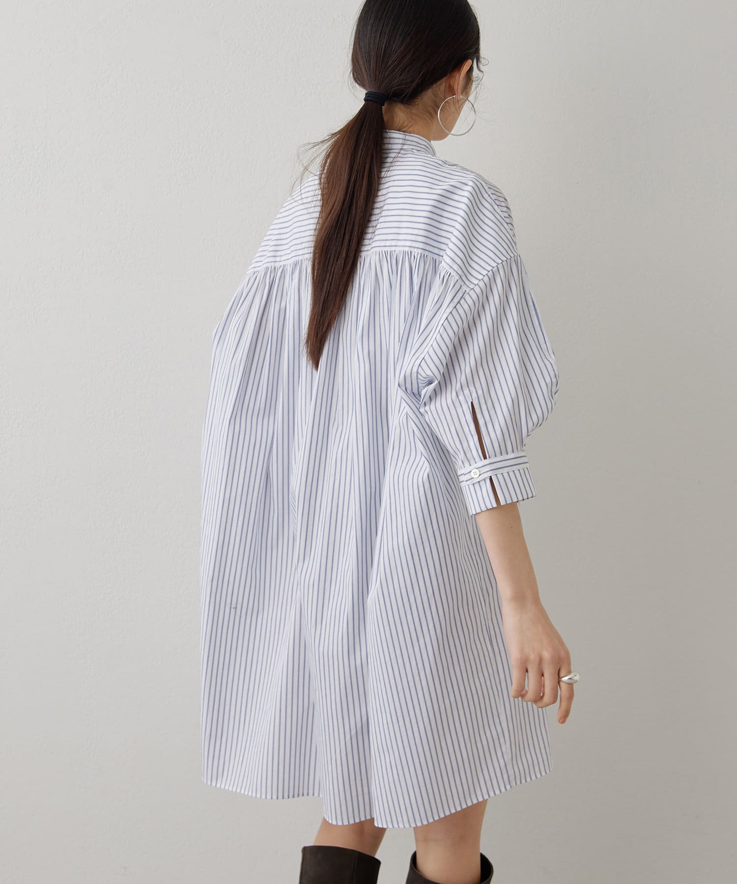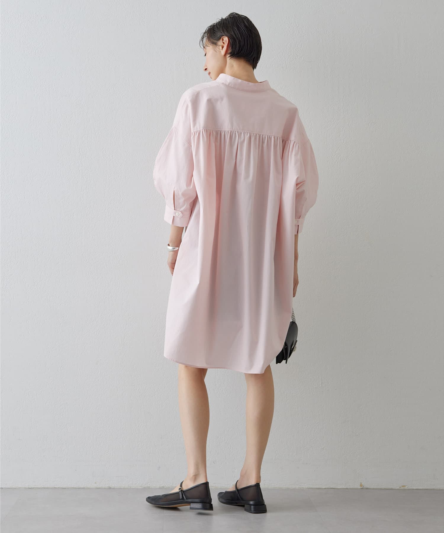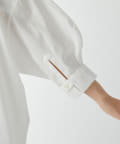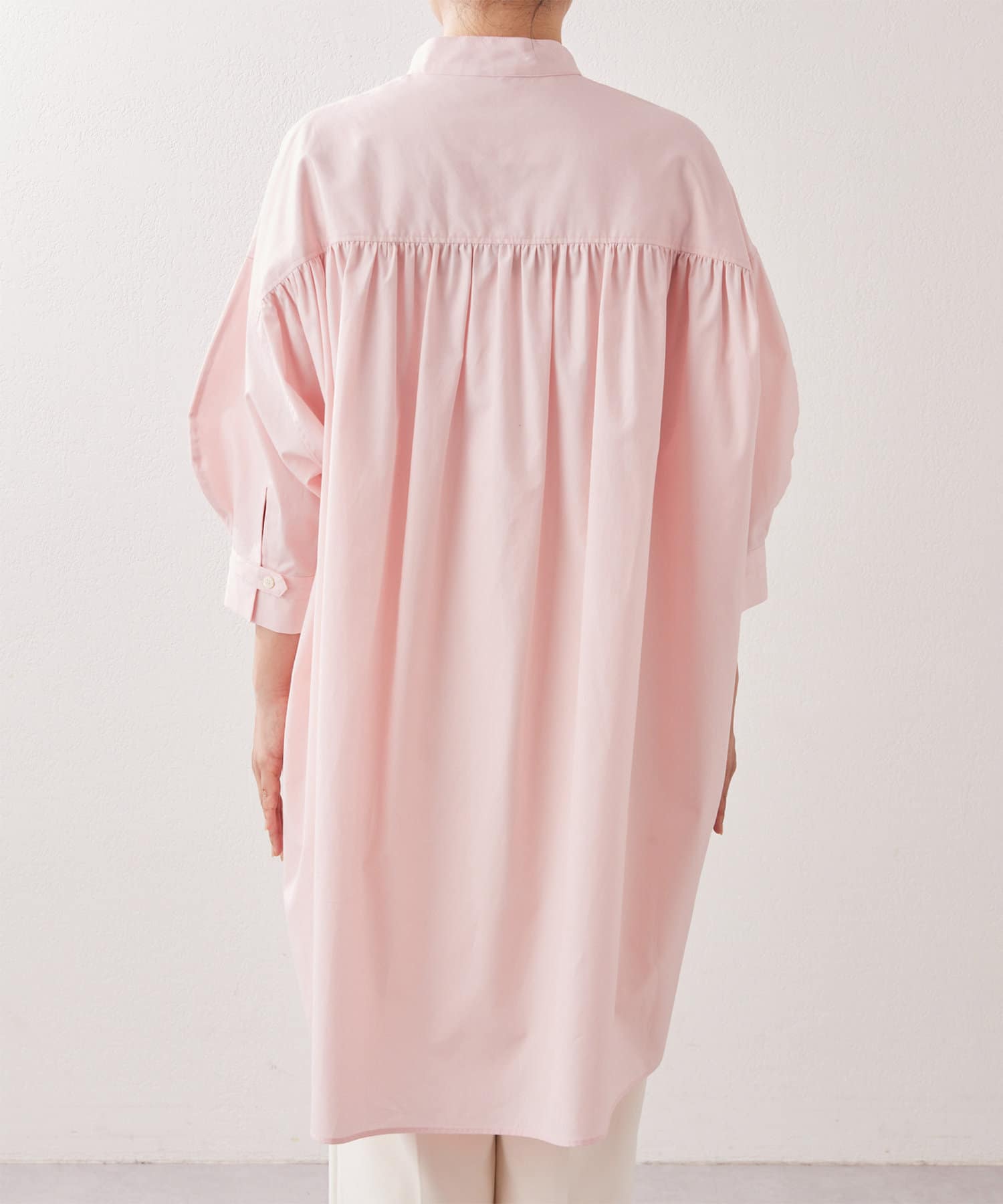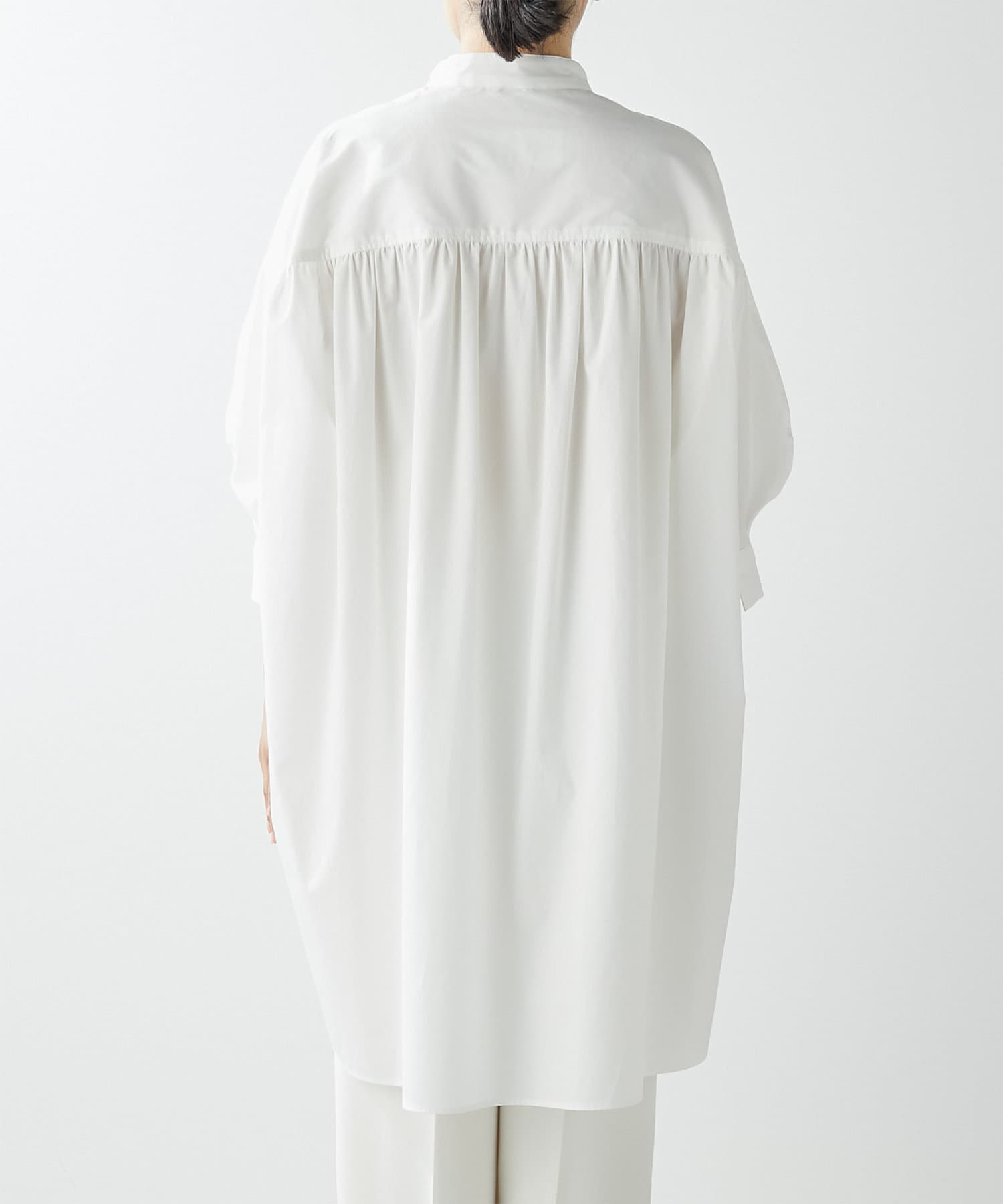 オーバーサイズながら、短めの袖丈や前後差のある裾デザインですっきりと見せてくれます。背面に入ったギャザーでバッグシルエットも綺麗です。
