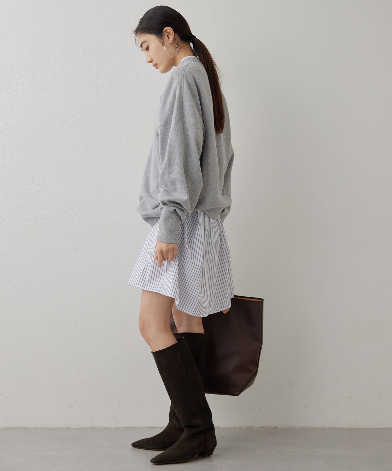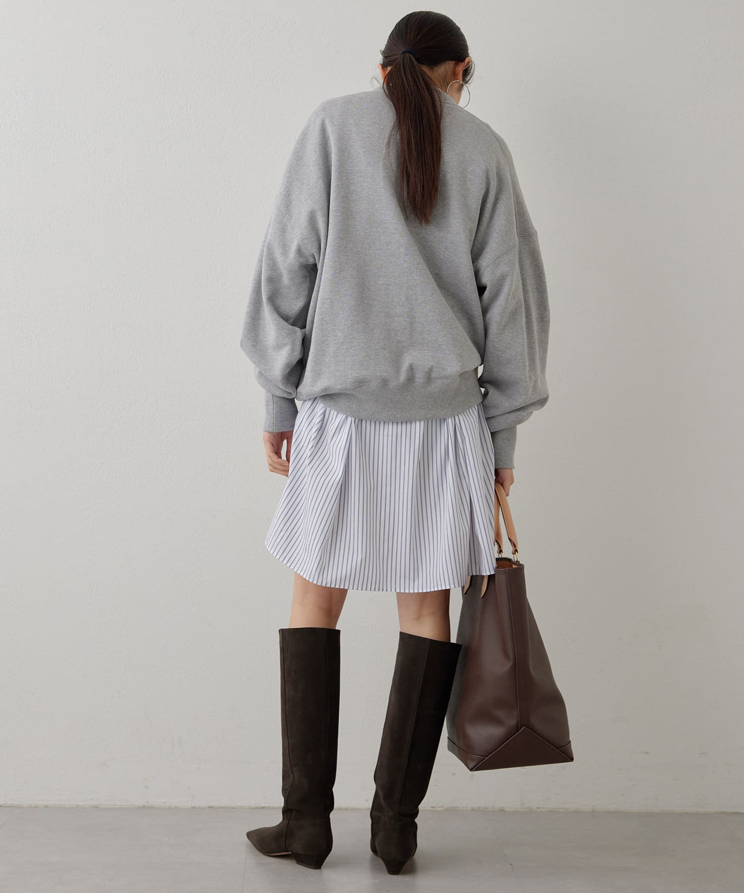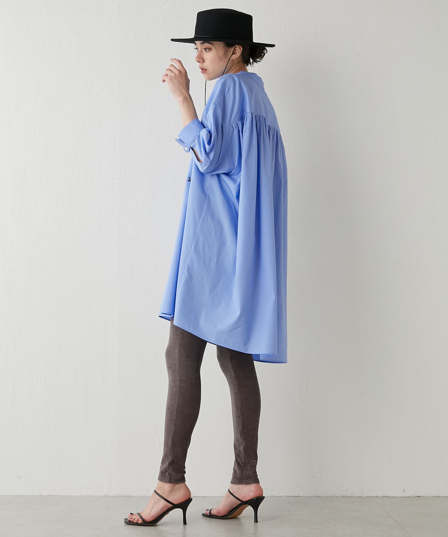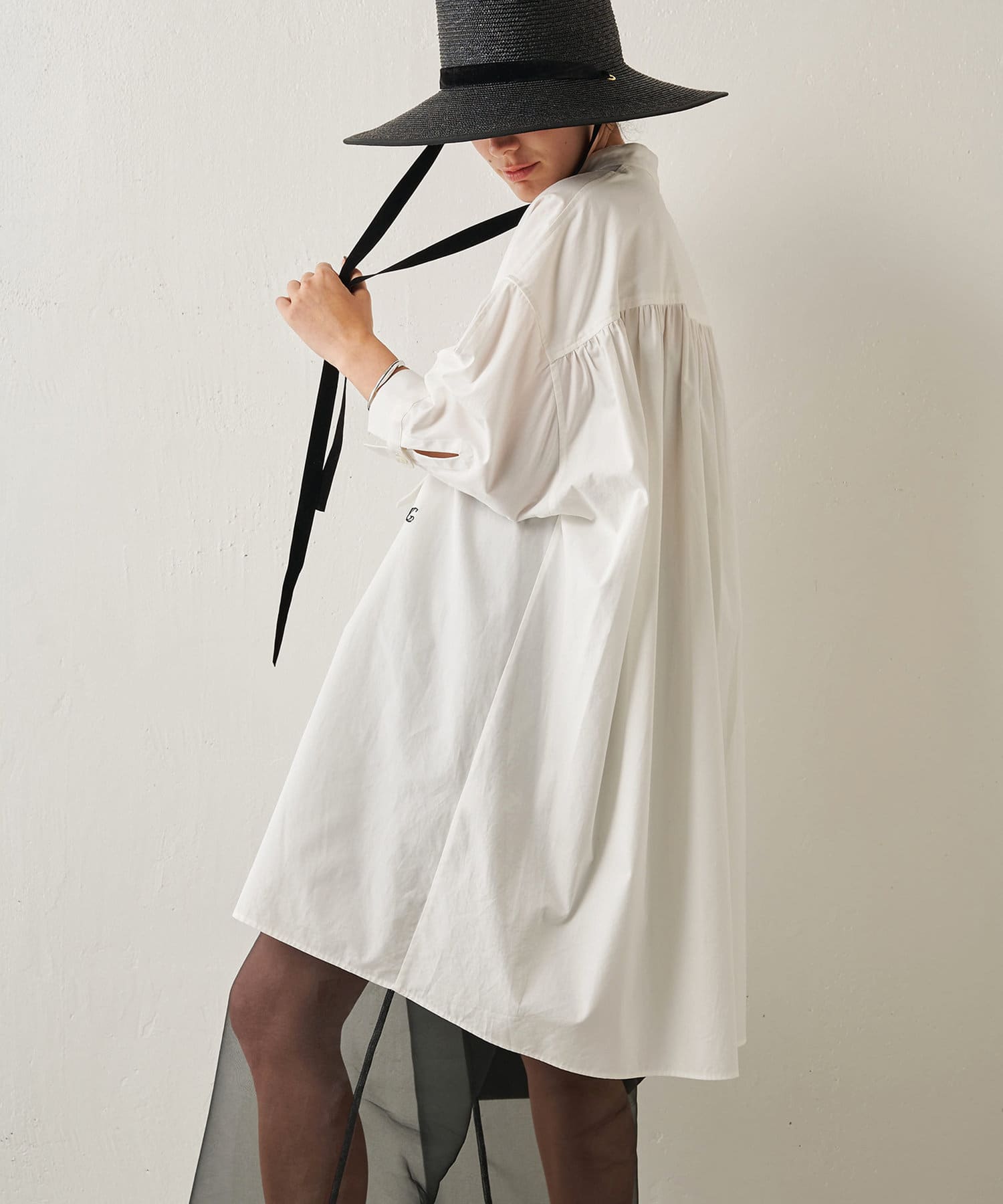 オーバーサイズながら、短めの袖丈や前後差のある裾デザインですっきりと見せてくれます。背面に入ったギャザーでバッグシルエットも綺麗です。