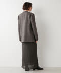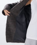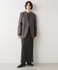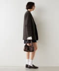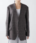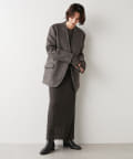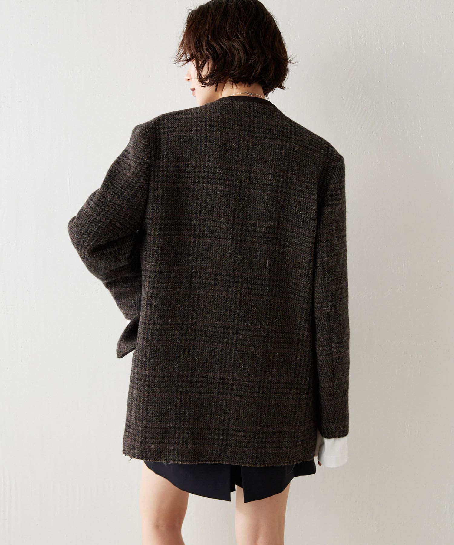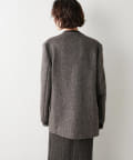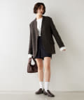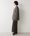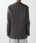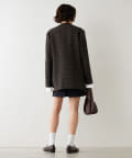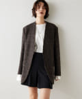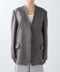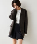 ノーカラーでかっちり感がありますが、襟の断ち切りデザインがこなれ感をプラスしてくれます。ヒップが隠れる着丈で合わせるボトムを選びません。肩パッド入りなので、シルエットがしっかり決まり着用時も着崩れせずに着用可能です。