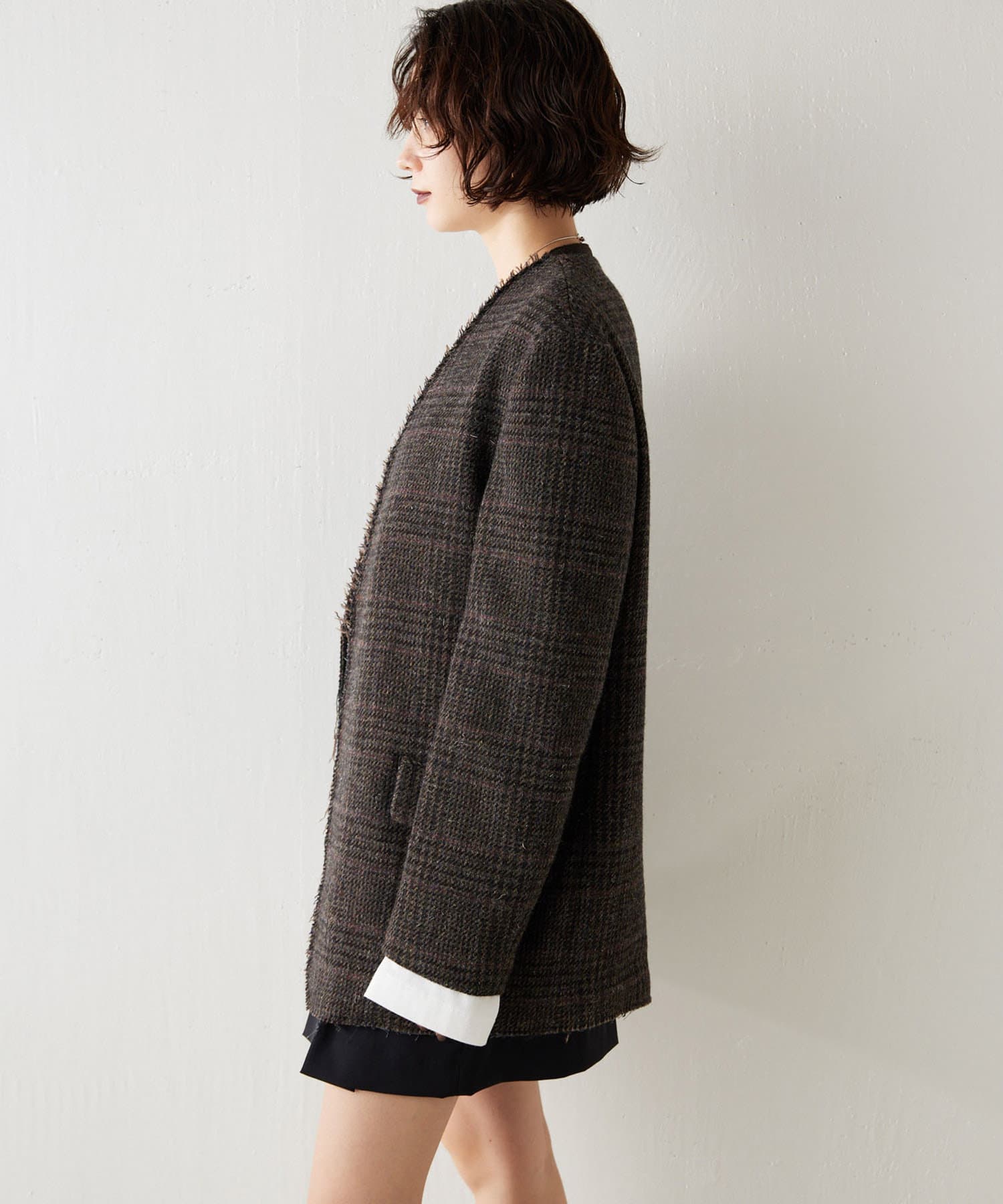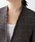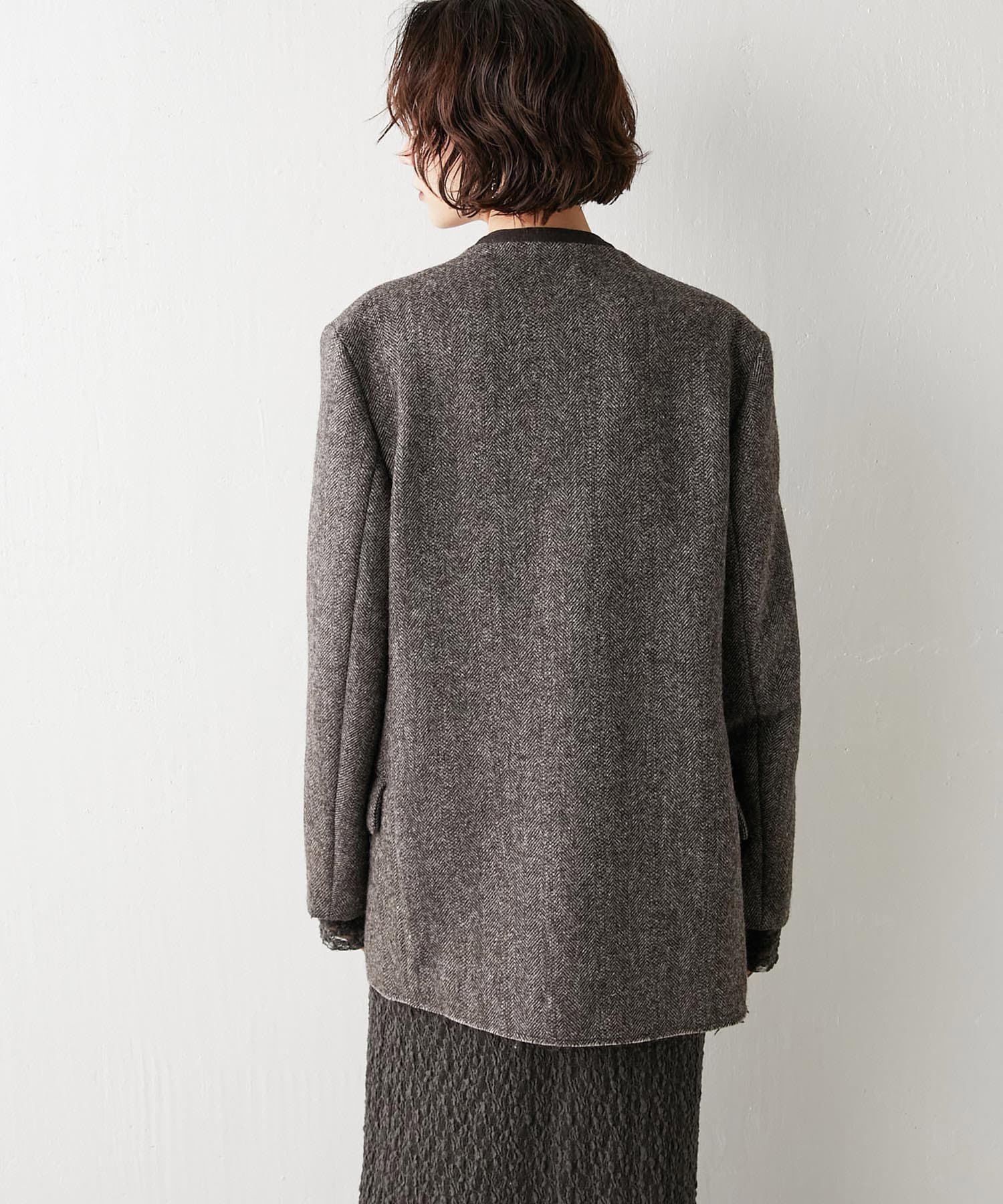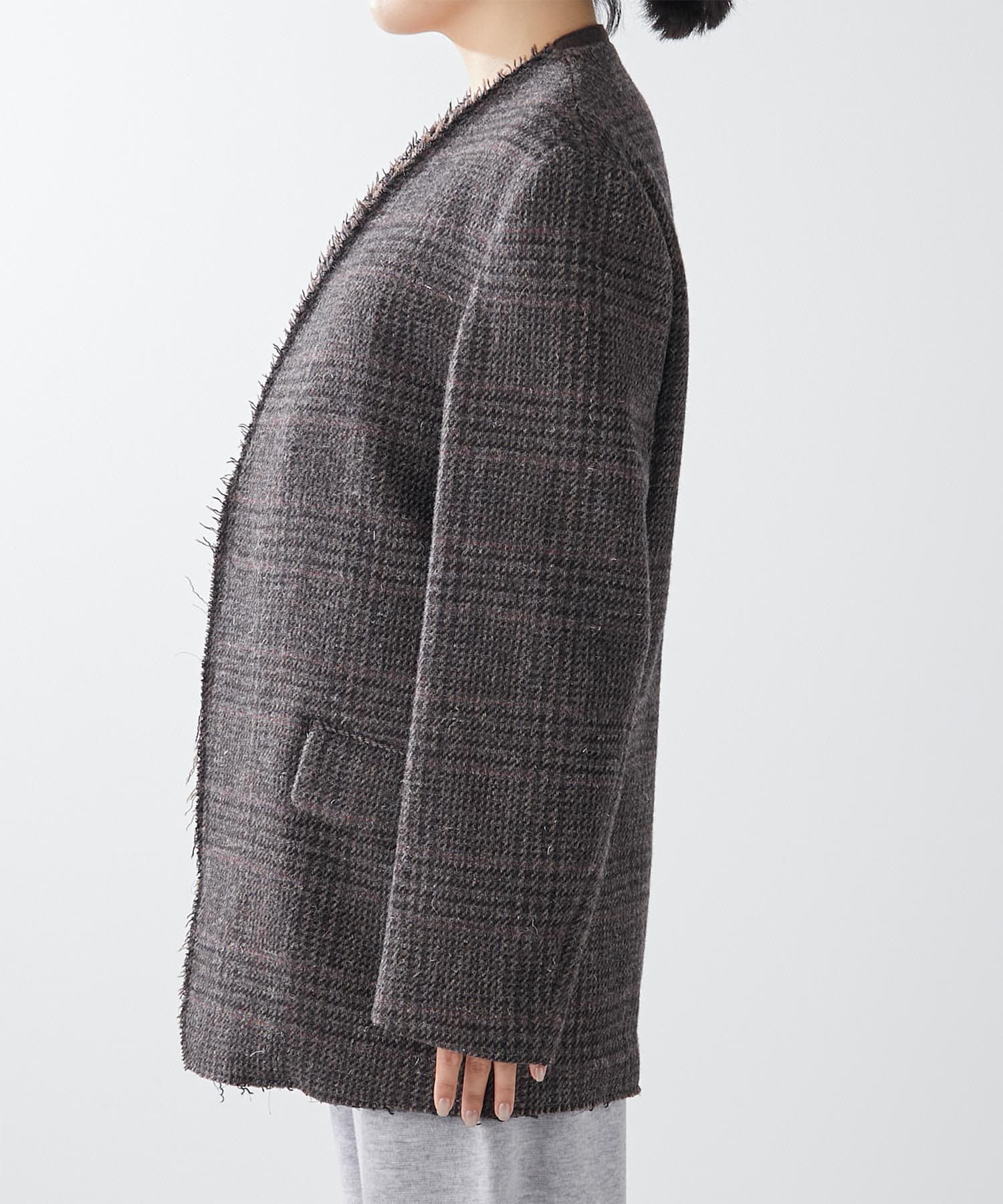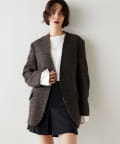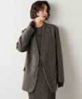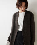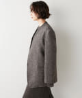 ノーカラーというと綺麗めな印象となりそうですが、こちらは別。襟元が裁ち切りのデザインでこなれ感がでます。縦のラインが出ますので、個人的には細く見える?!と感じました。深みのあるカラーで、秋冬らしい逸品。さり気なく、カーディガン感覚で投入できるジャケットだと思います。