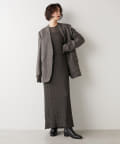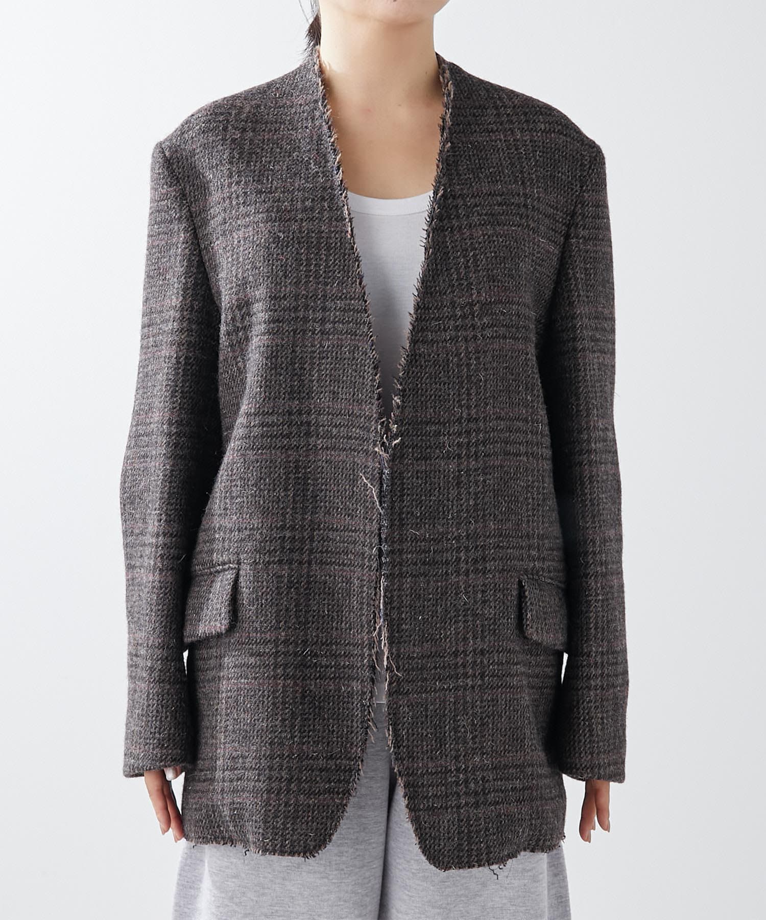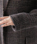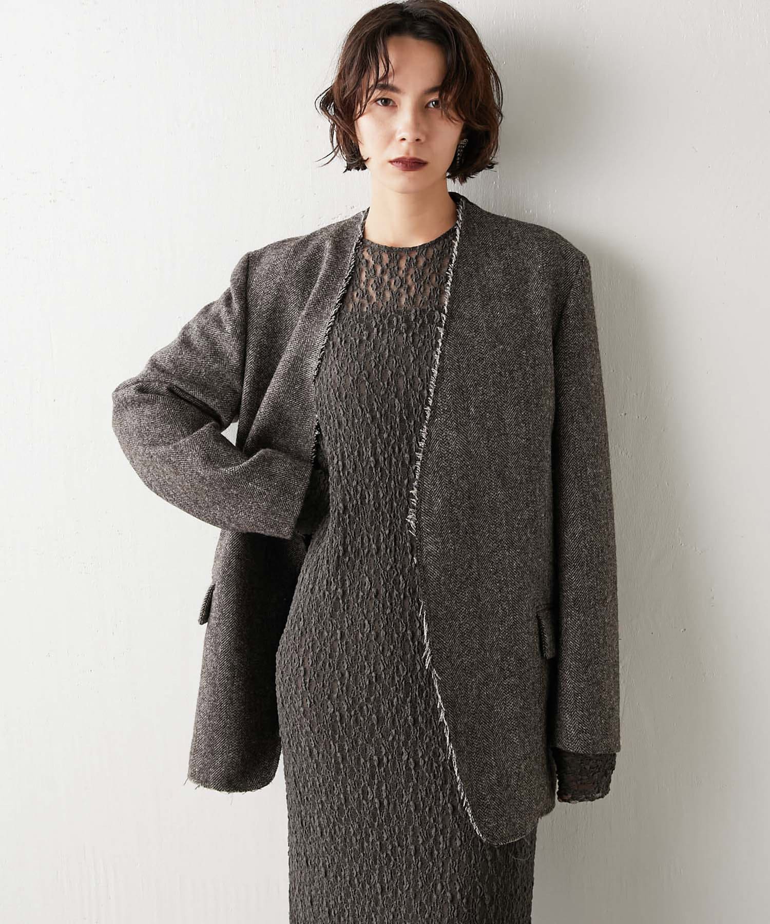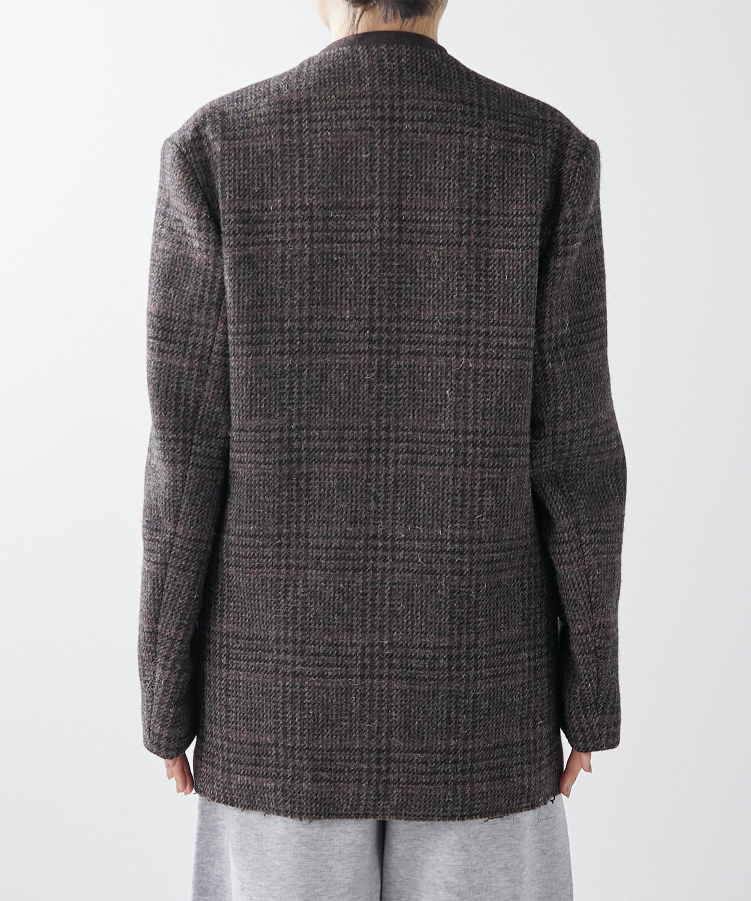 ノーカラーというと綺麗めな印象となりそうですが、こちらは別。襟元が裁ち切りのデザインでこなれ感がでます。縦のラインが出ますので、個人的には細く見える?!と感じました。深みのあるカラーで、秋冬らしい逸品。さり気なく、カーディガン感覚で投入できるジャケットだと思います。