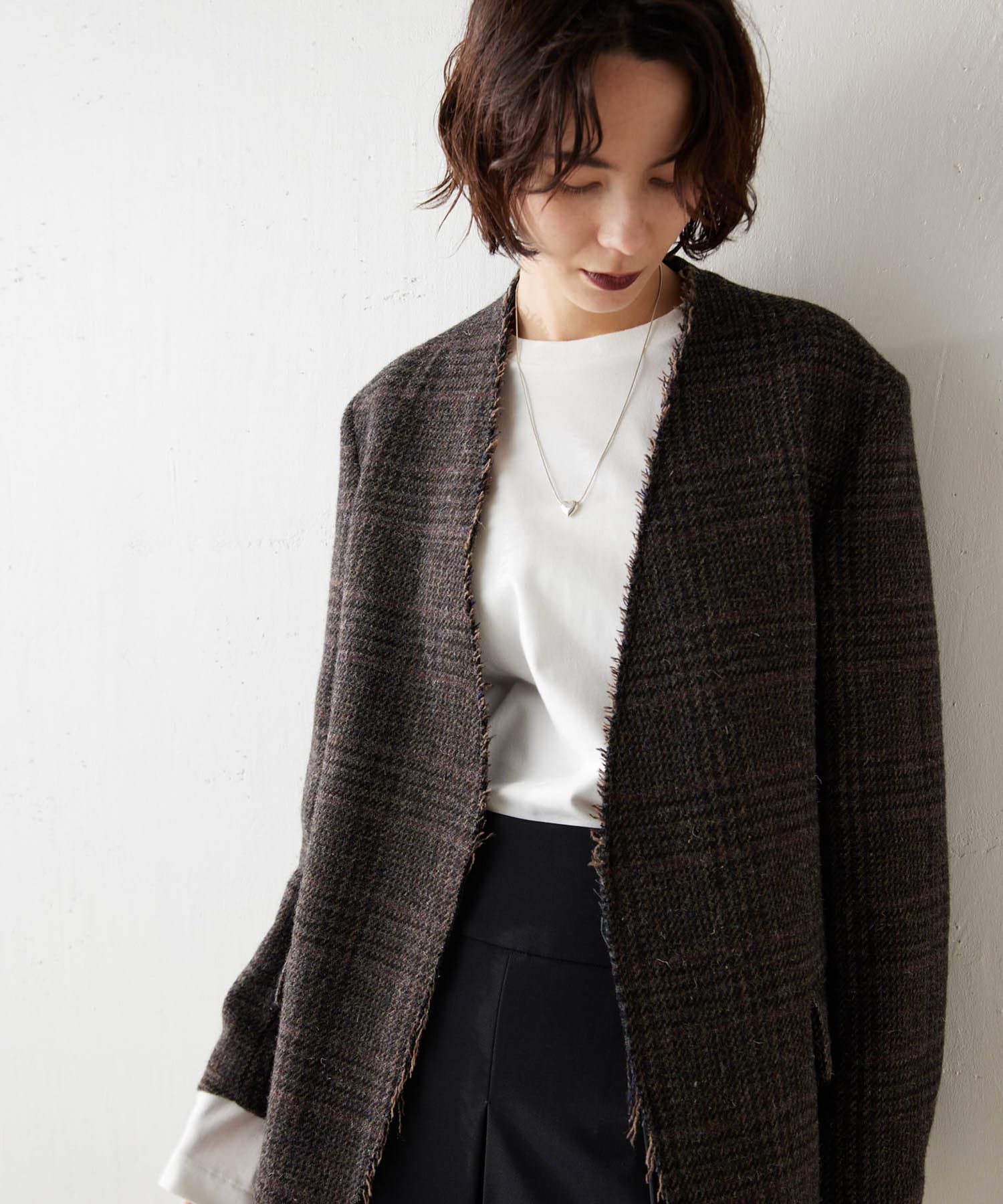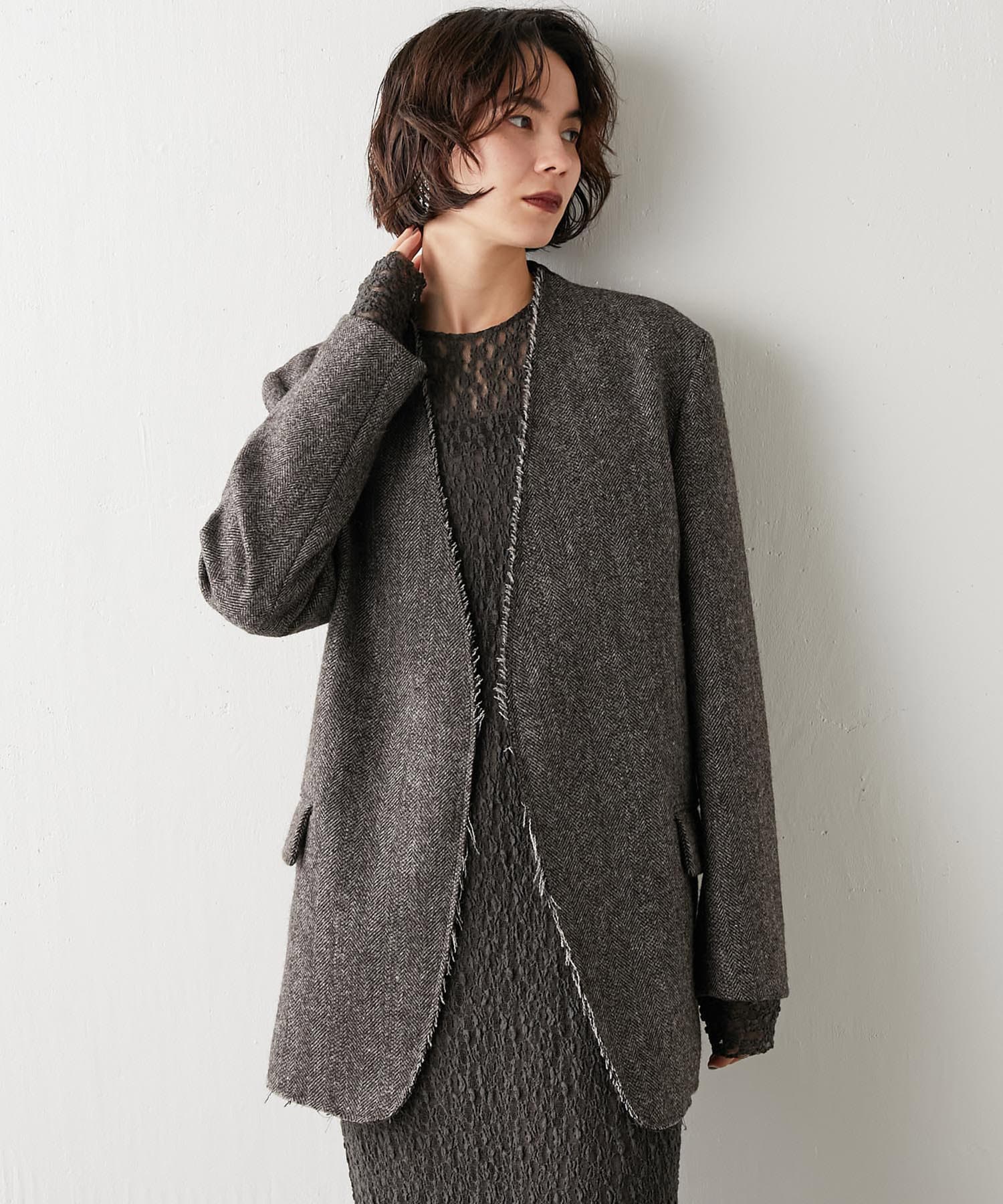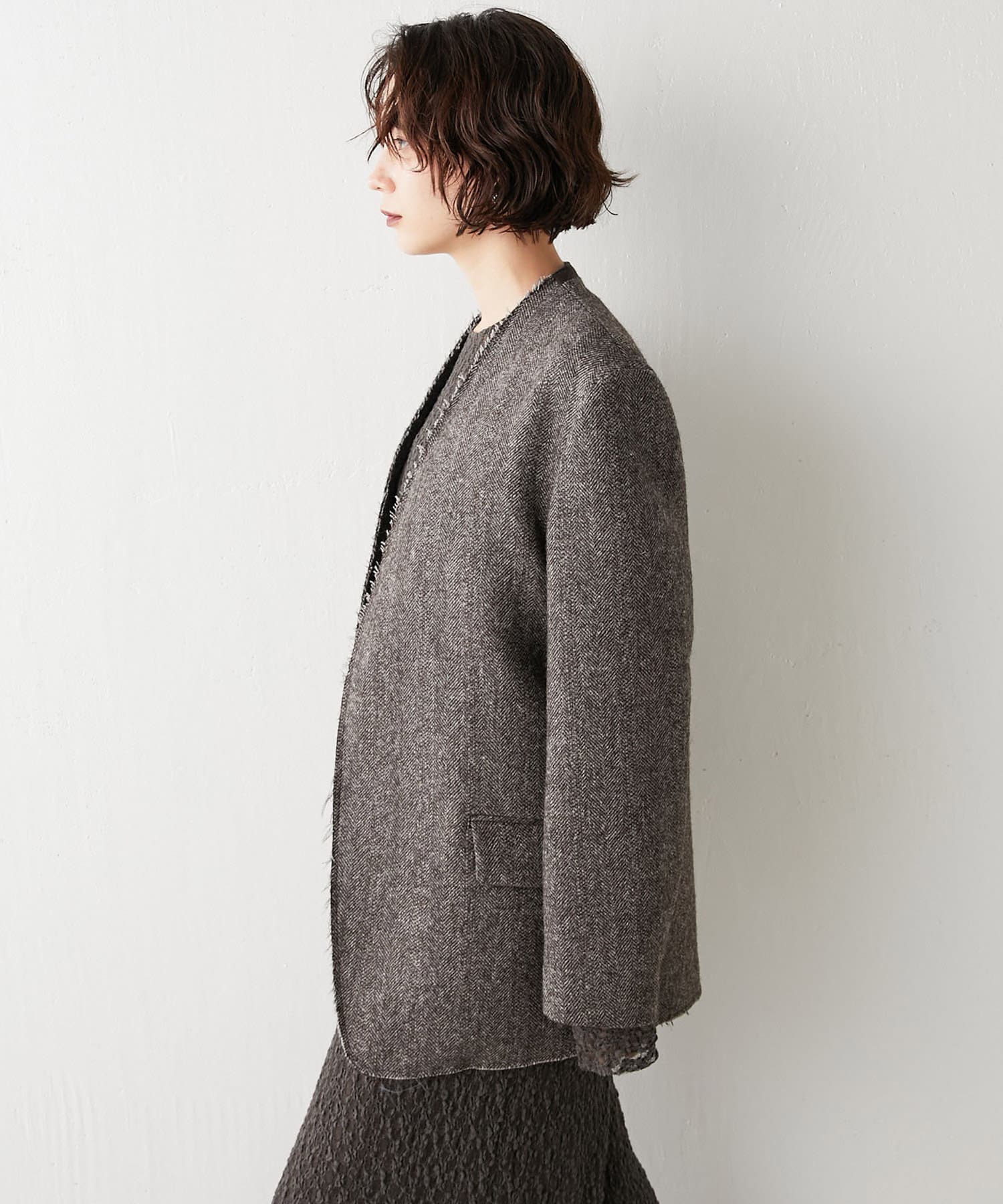 秋冬の着こなしをクラシカルに彩る、大人のノーカラージャケット