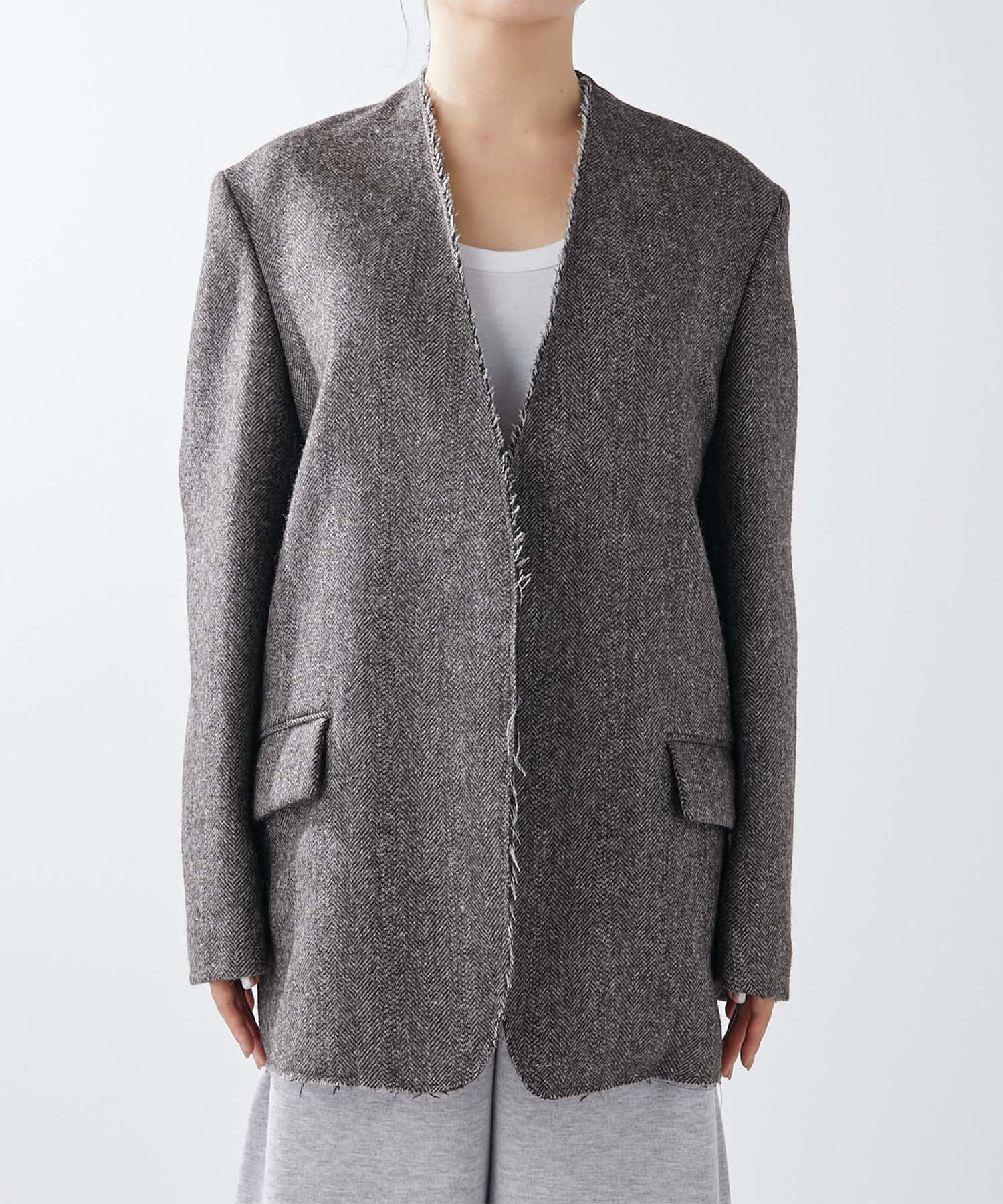 ■オーバーサイズジャケットの衿ぐりを裁ち切ったように仕上げた抜け感のある一着。