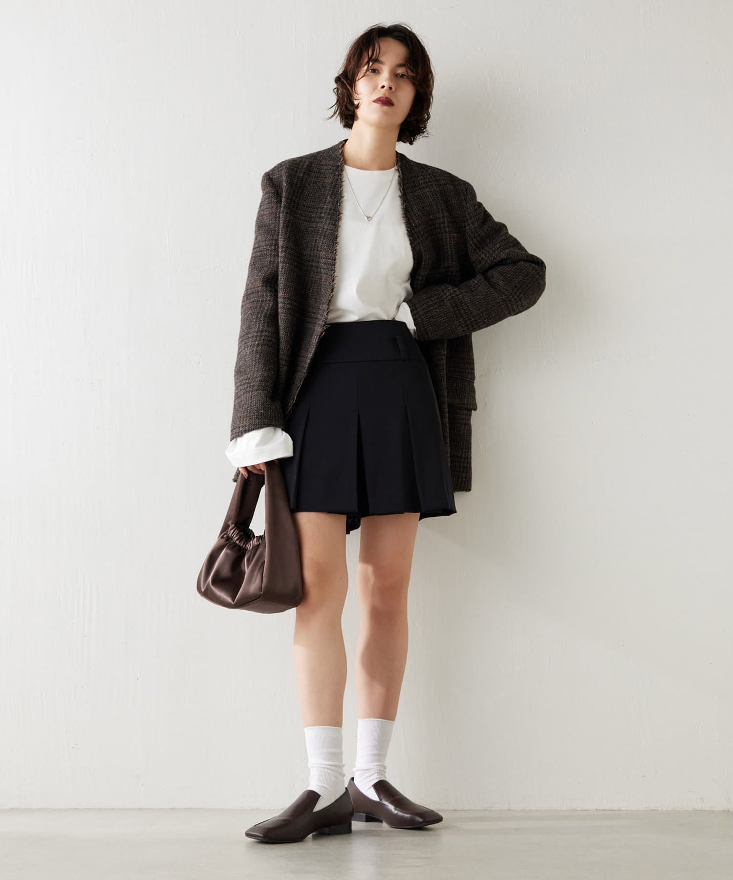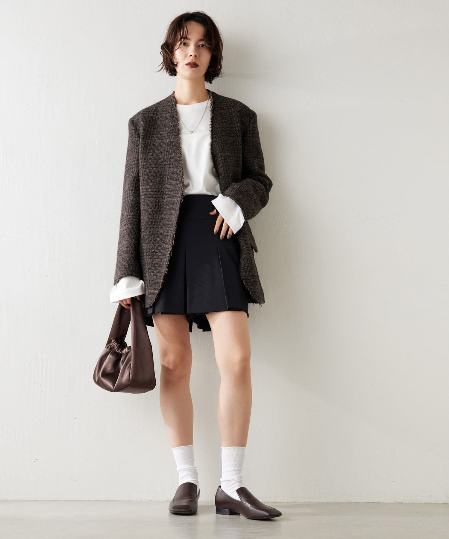 ■フェミニンなワンピースとのコントラストのあるスタイルから、トレンドのミニボトムとのコーディネートもおすすめ。