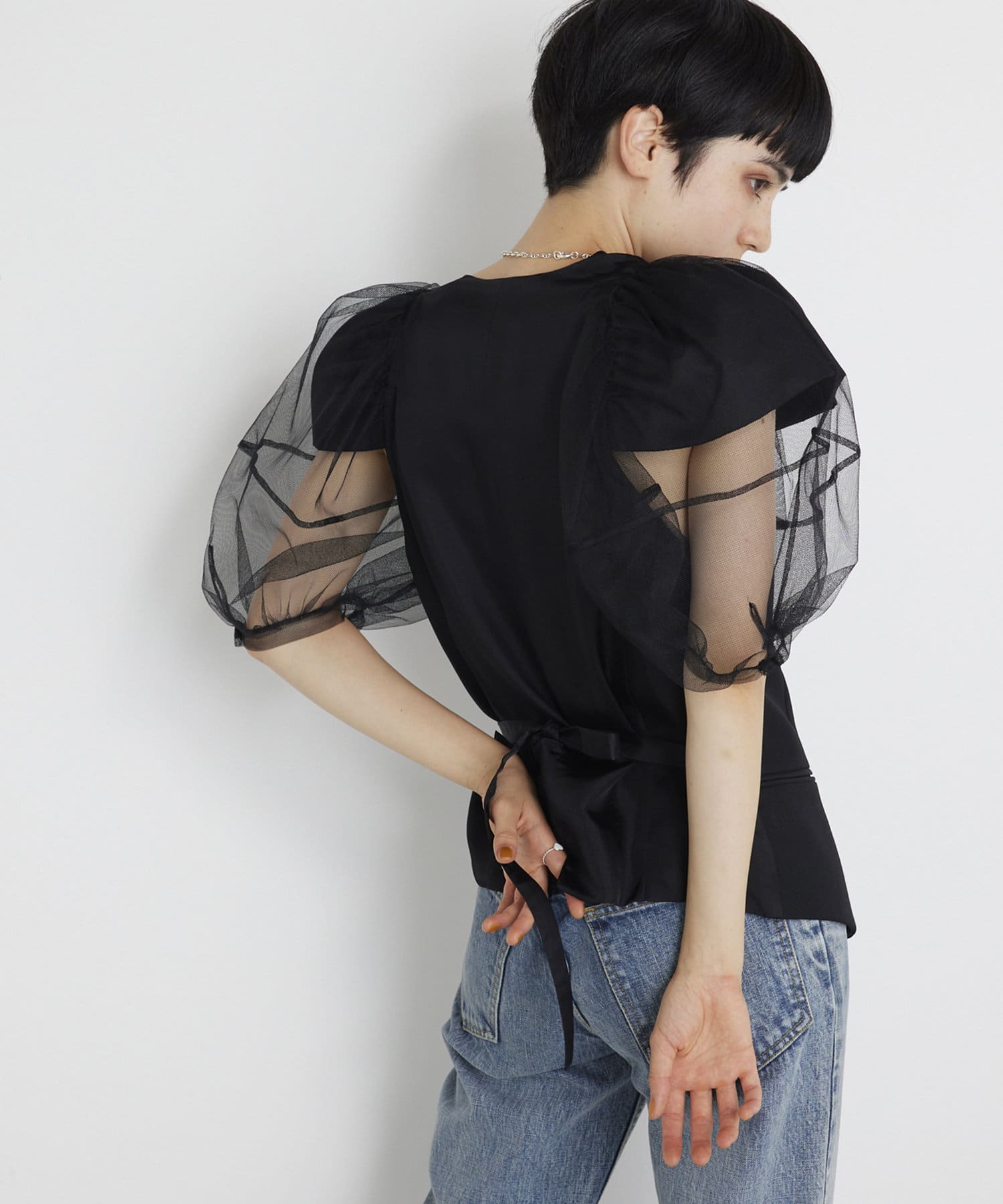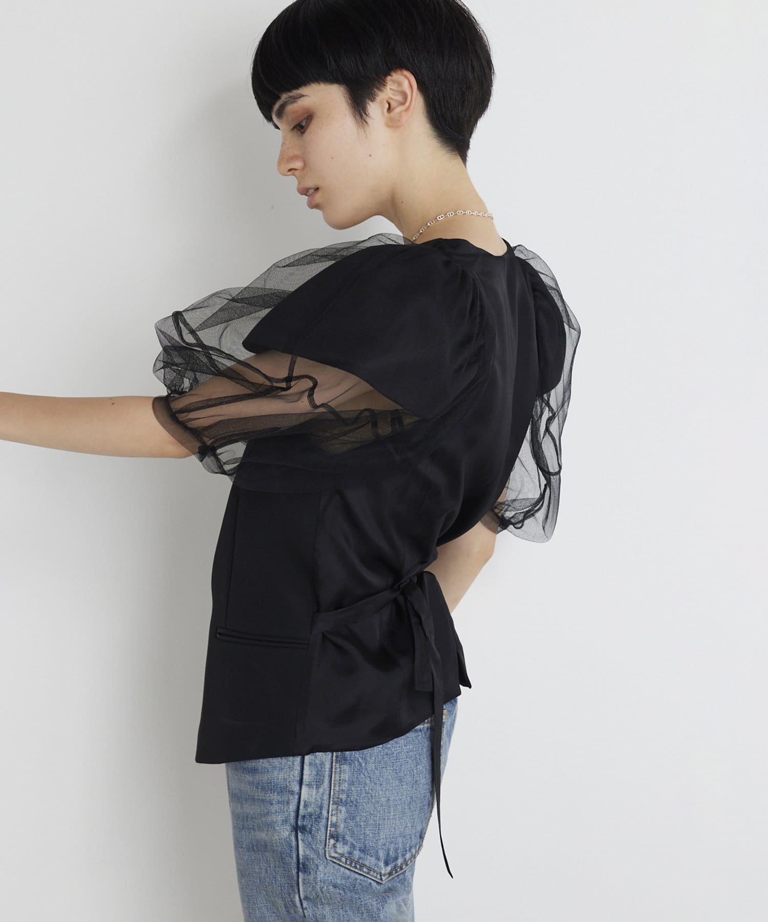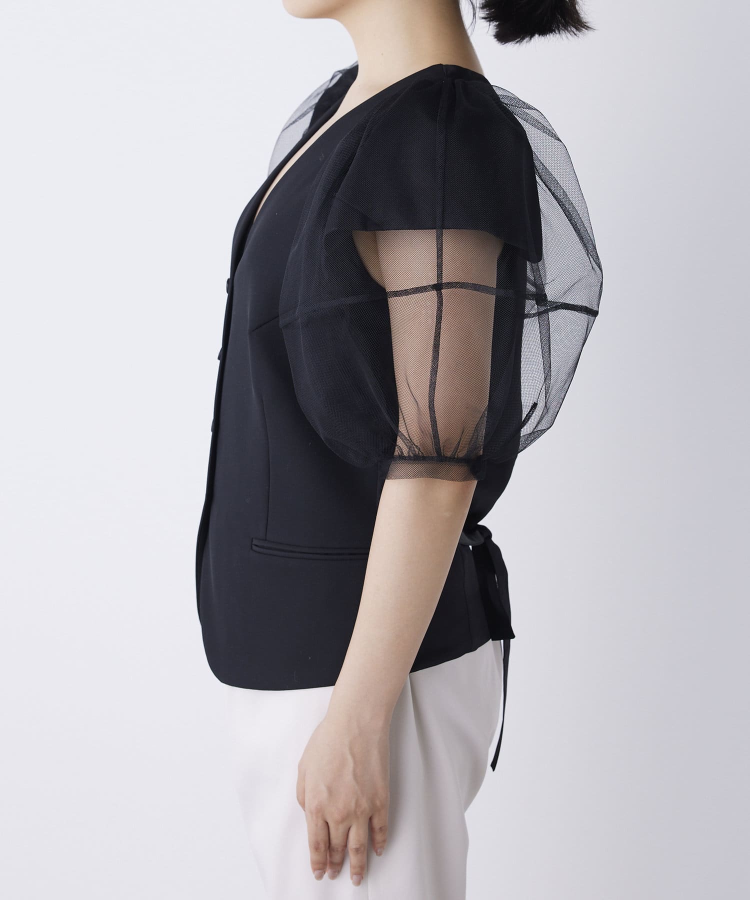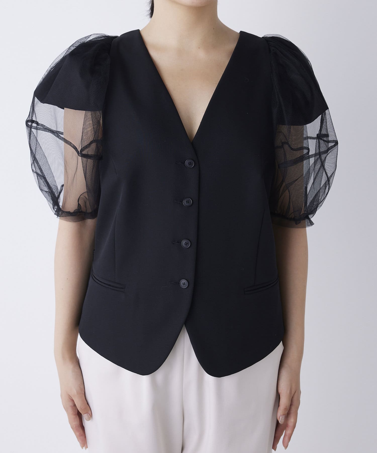 ■テーラリングの美しいベストに、チュールのスリーブをドッキングしたようなデザイン。