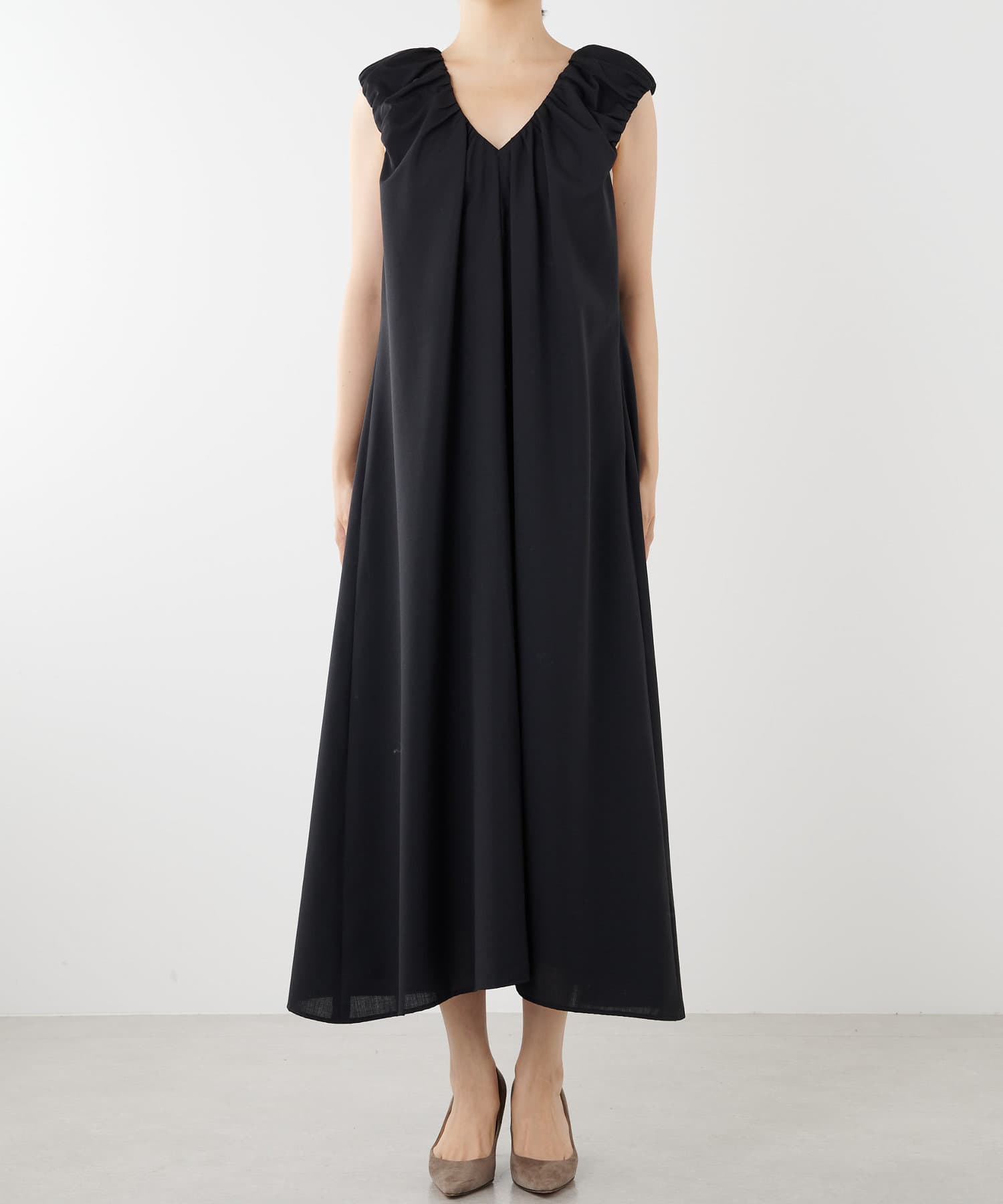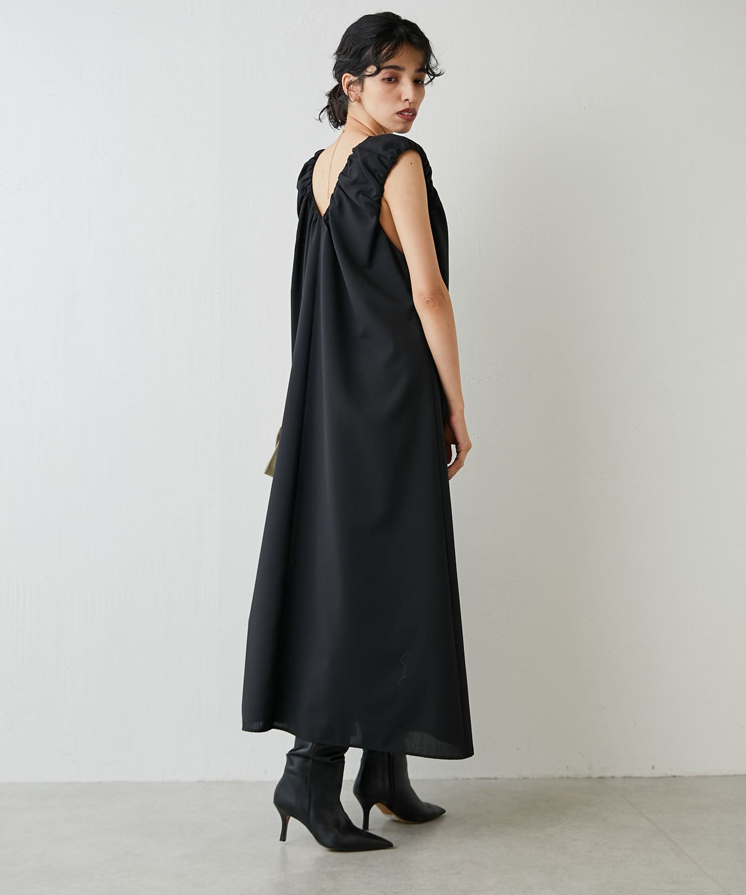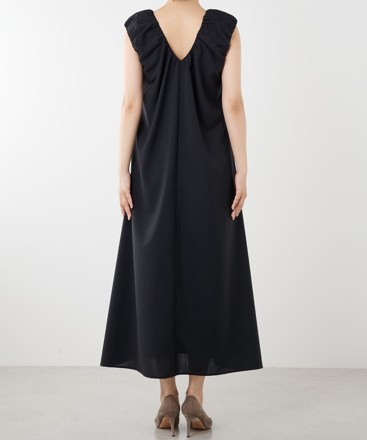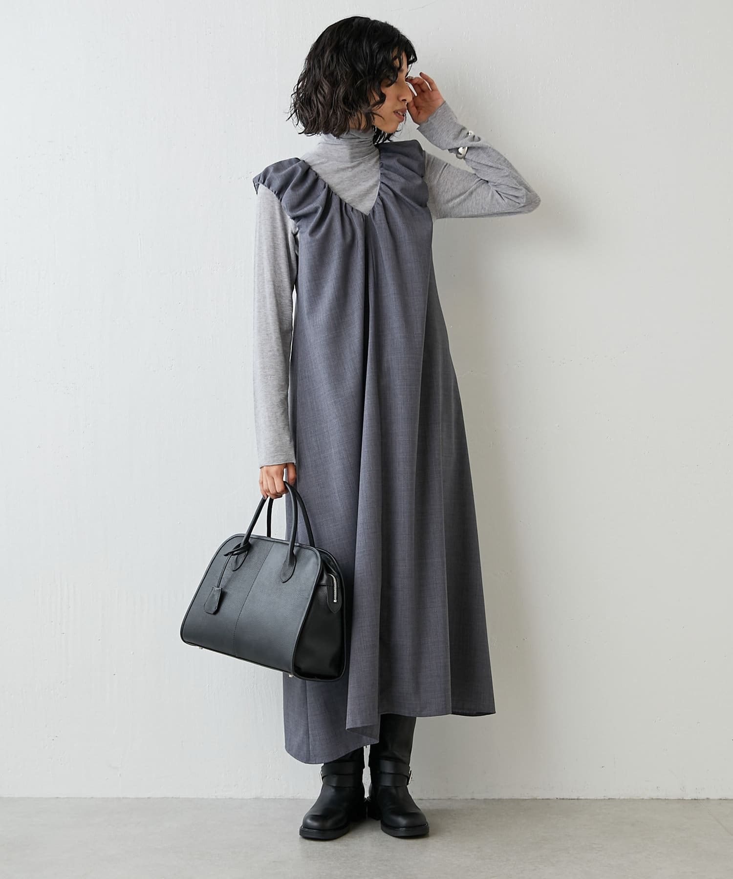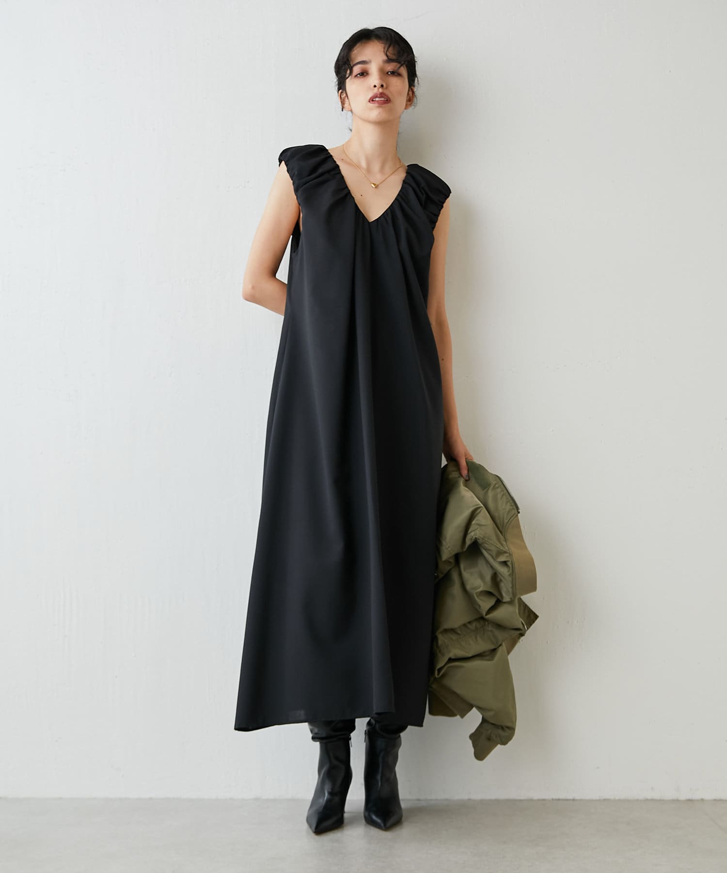 前後のブイネックが抜け感となり、スッキリとした上半身となるワンピース。ギャザーがさり気なく華やかさを出してくれます。腰の位置が高く見えるデザインで自然とスタイルアップ効果があります。一枚ではもちろんのこと、インナーに薄手のインナーを合わせて着用することもでき、着回し力がございます。