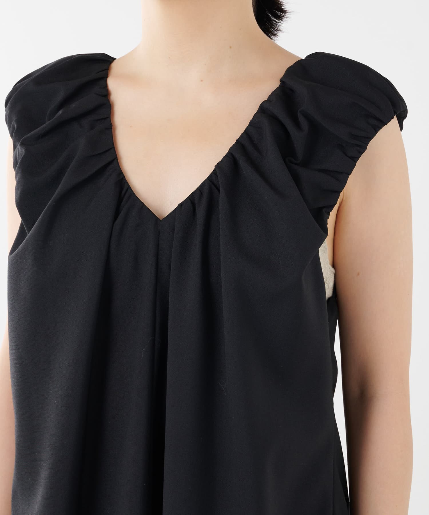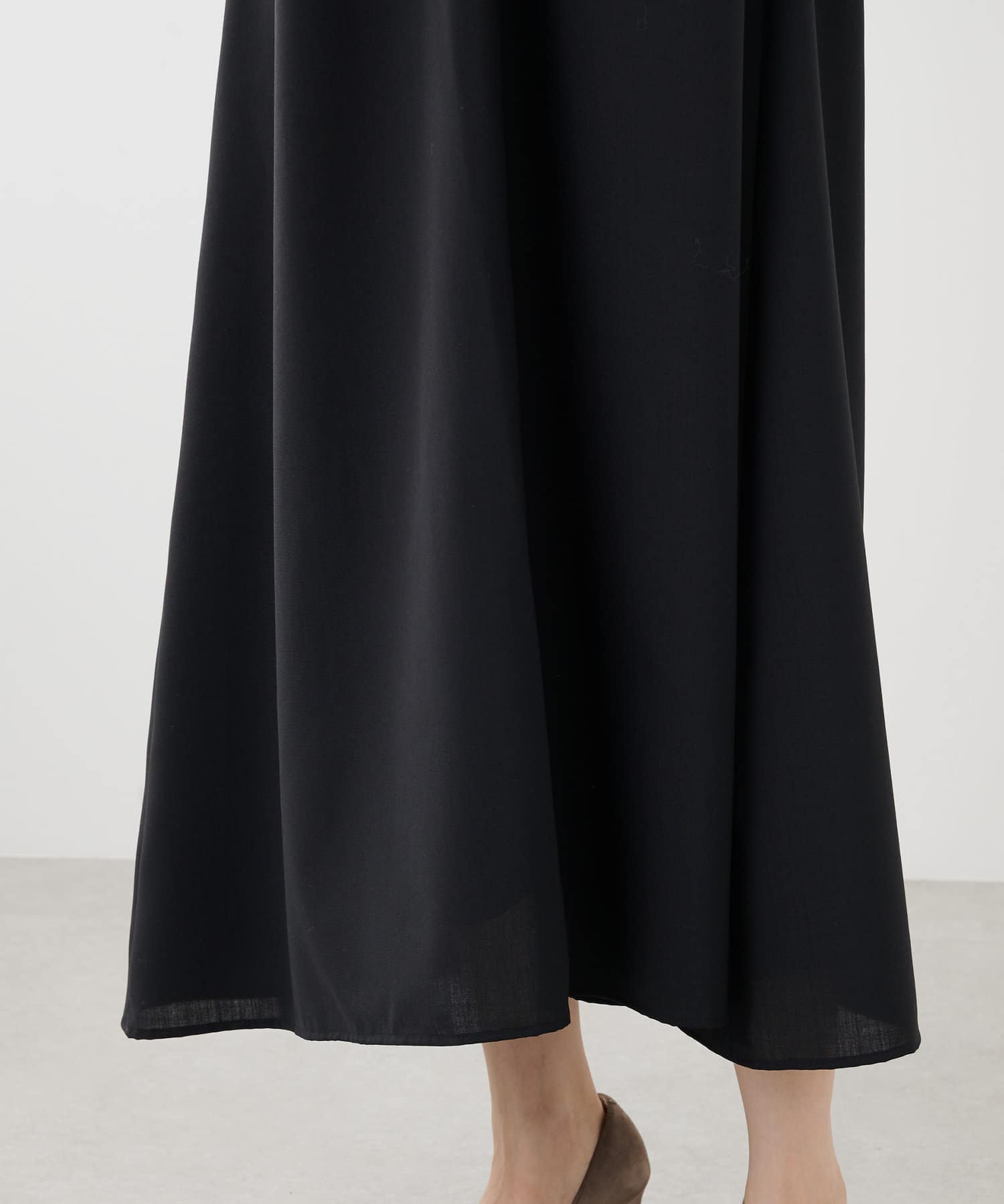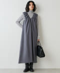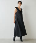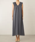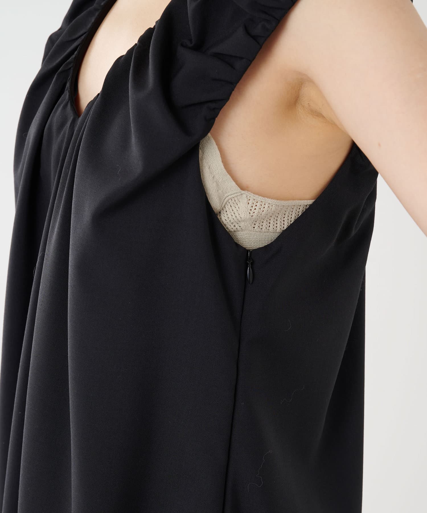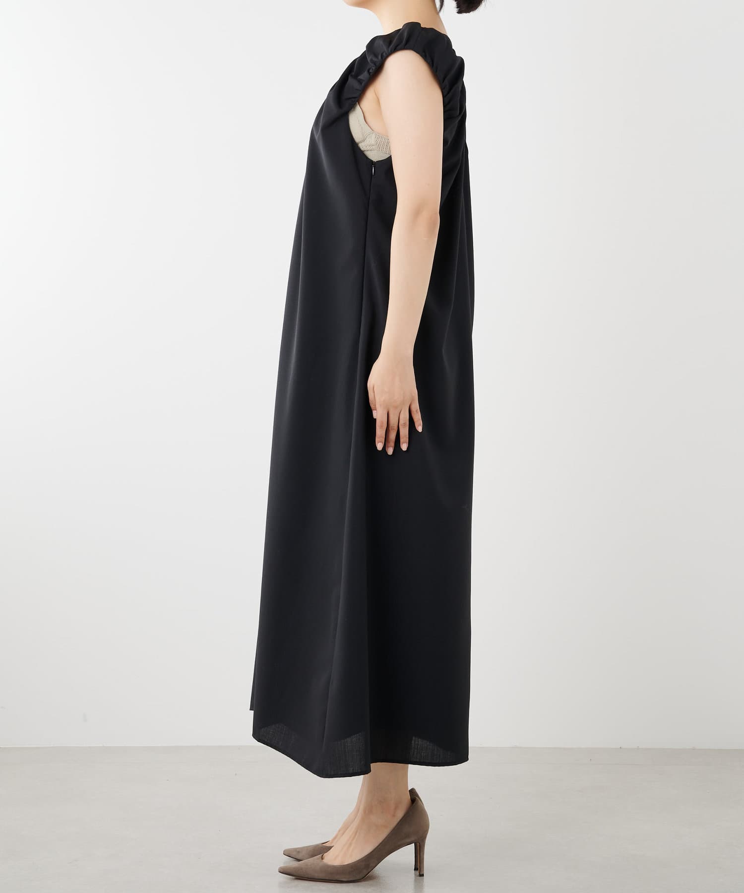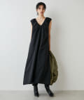 前後のブイネックが抜け感となり、スッキリとした上半身となるワンピース。ギャザーがさり気なく華やかさを出してくれます。腰の位置が高く見えるデザインで自然とスタイルアップ効果があります。一枚ではもちろんのこと、インナーに薄手のインナーを合わせて着用することもでき、着回し力がございます。