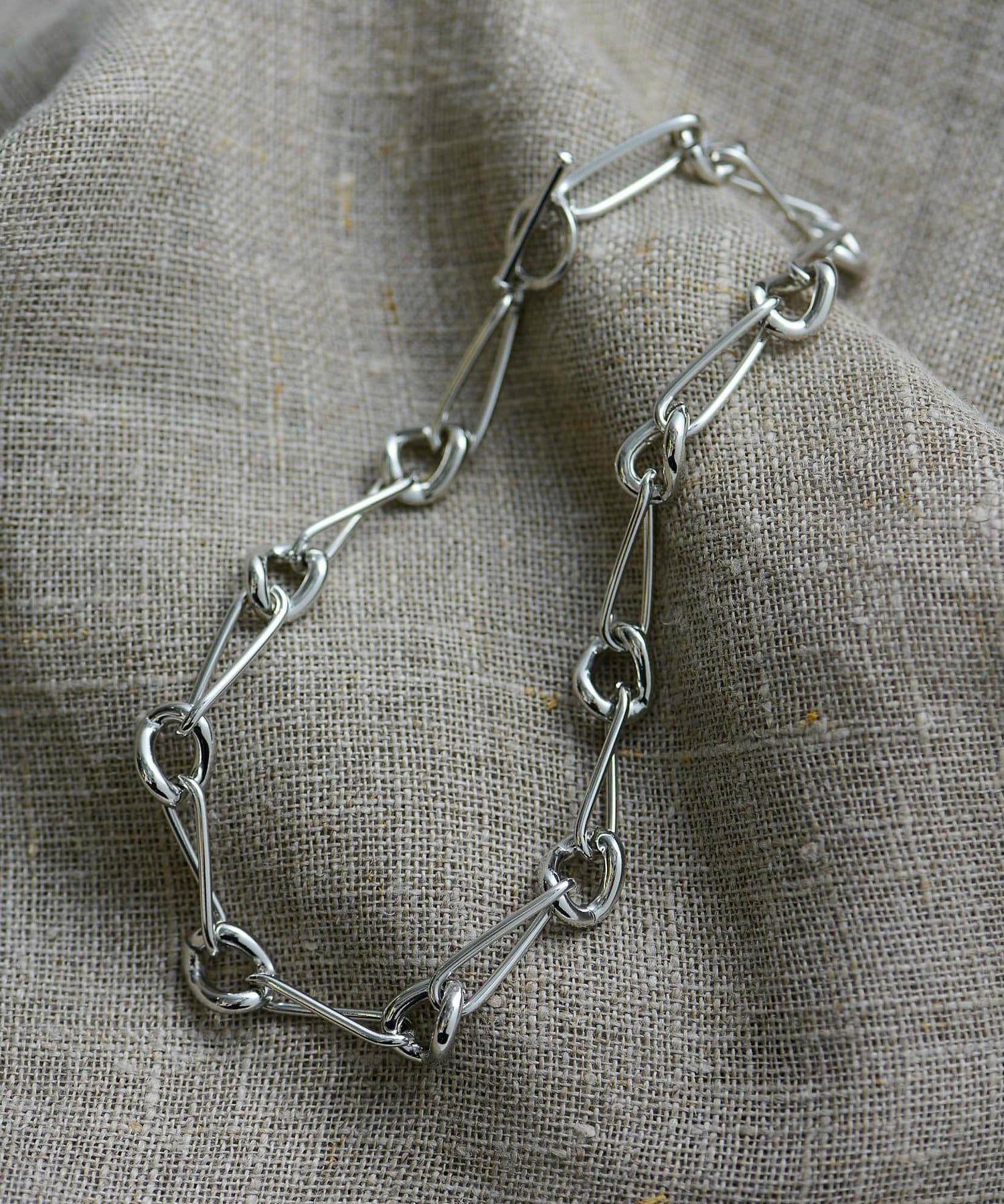■表情の異なる2種類のチェーンを交互に連ねたネックレス。