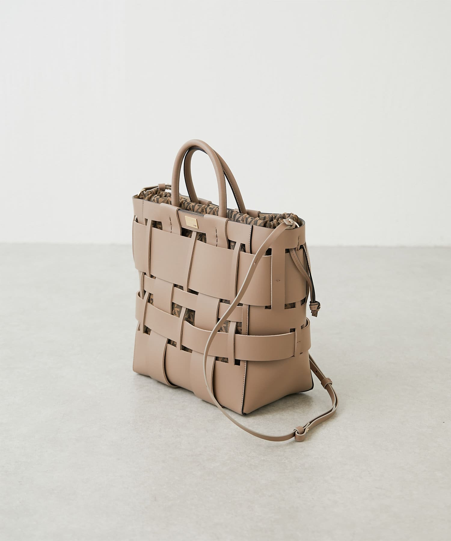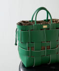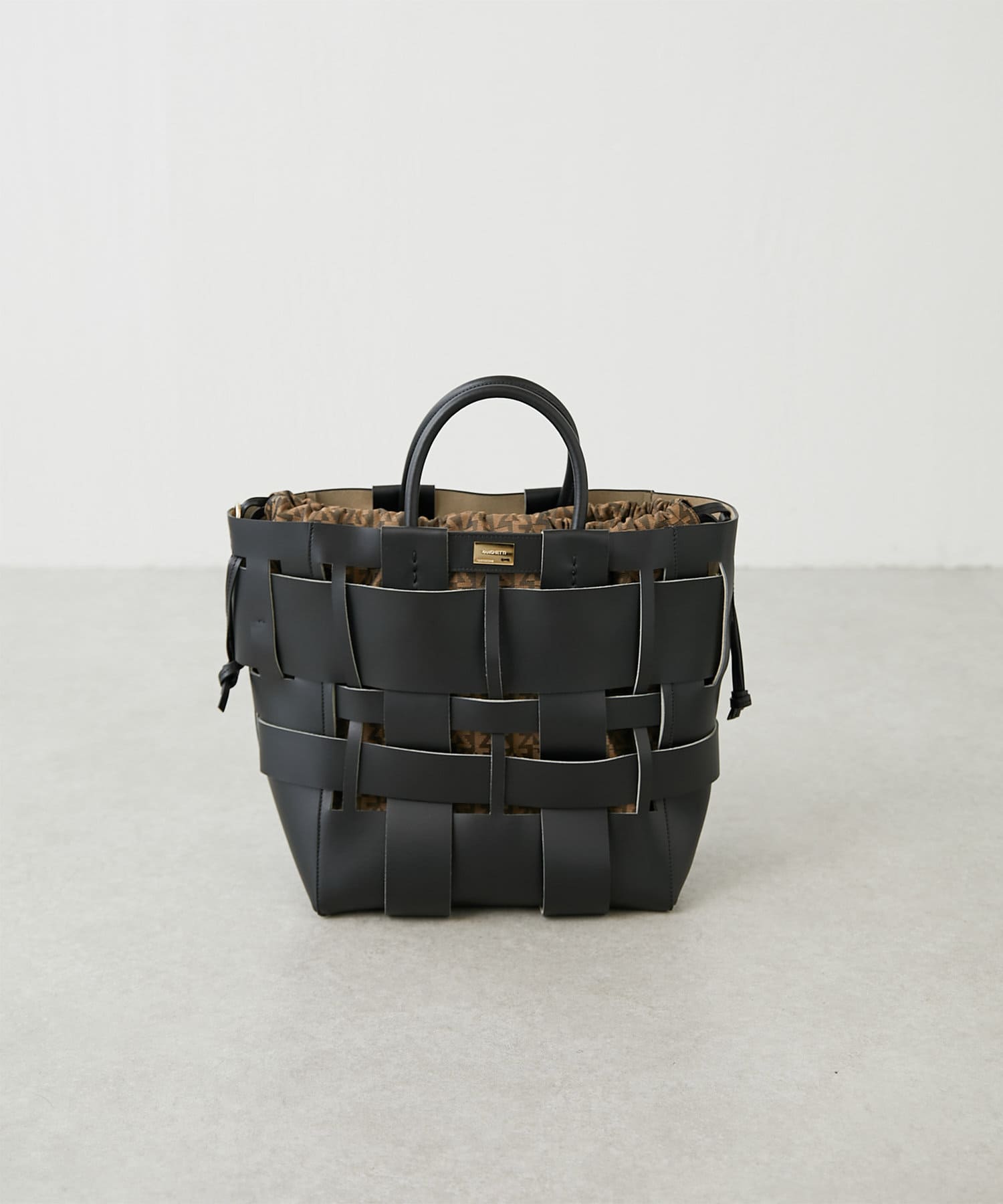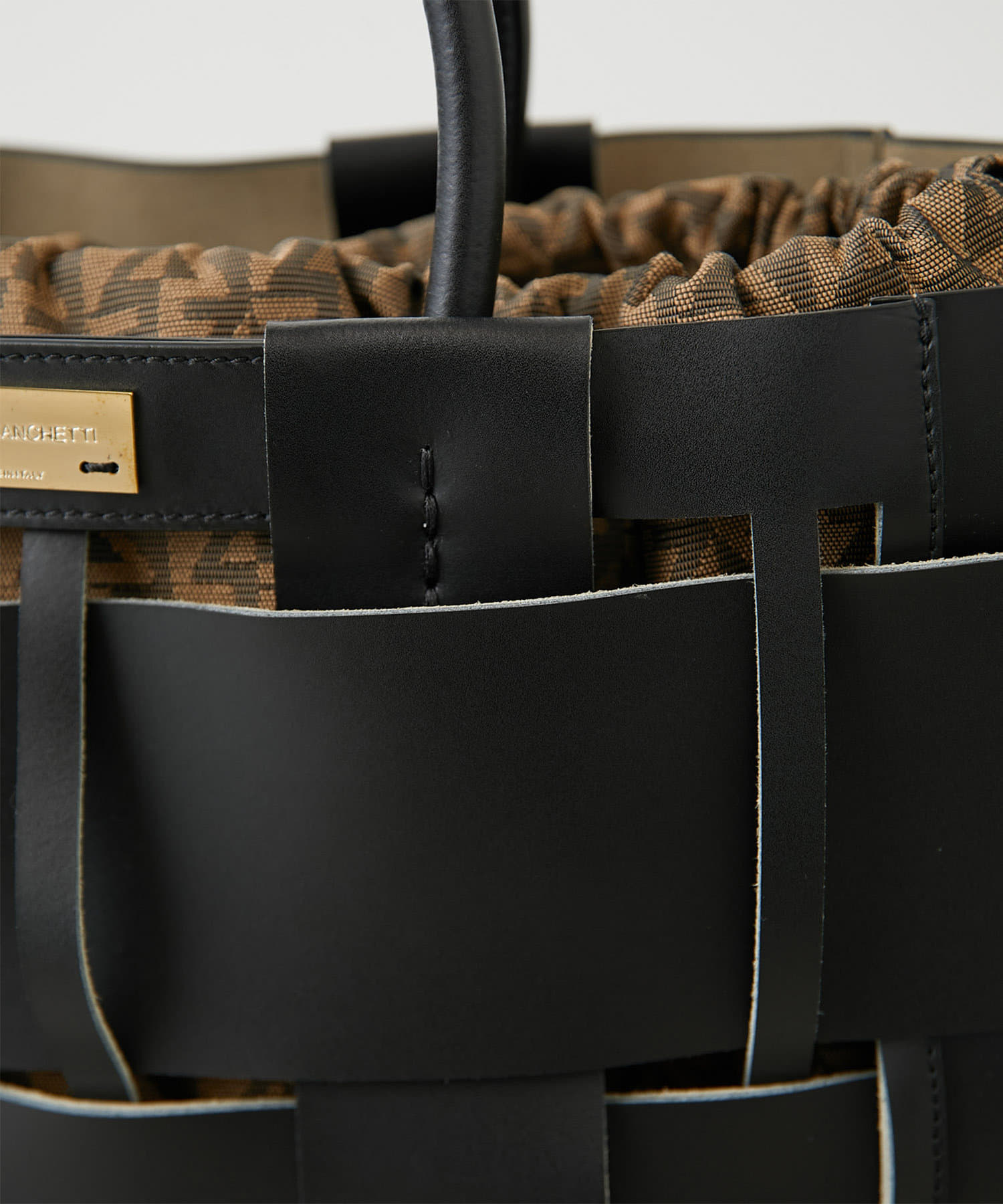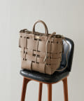 ■太めのカーフレザーを手作業で編み上げ、大胆なメッシュを描いたトートバッグ。