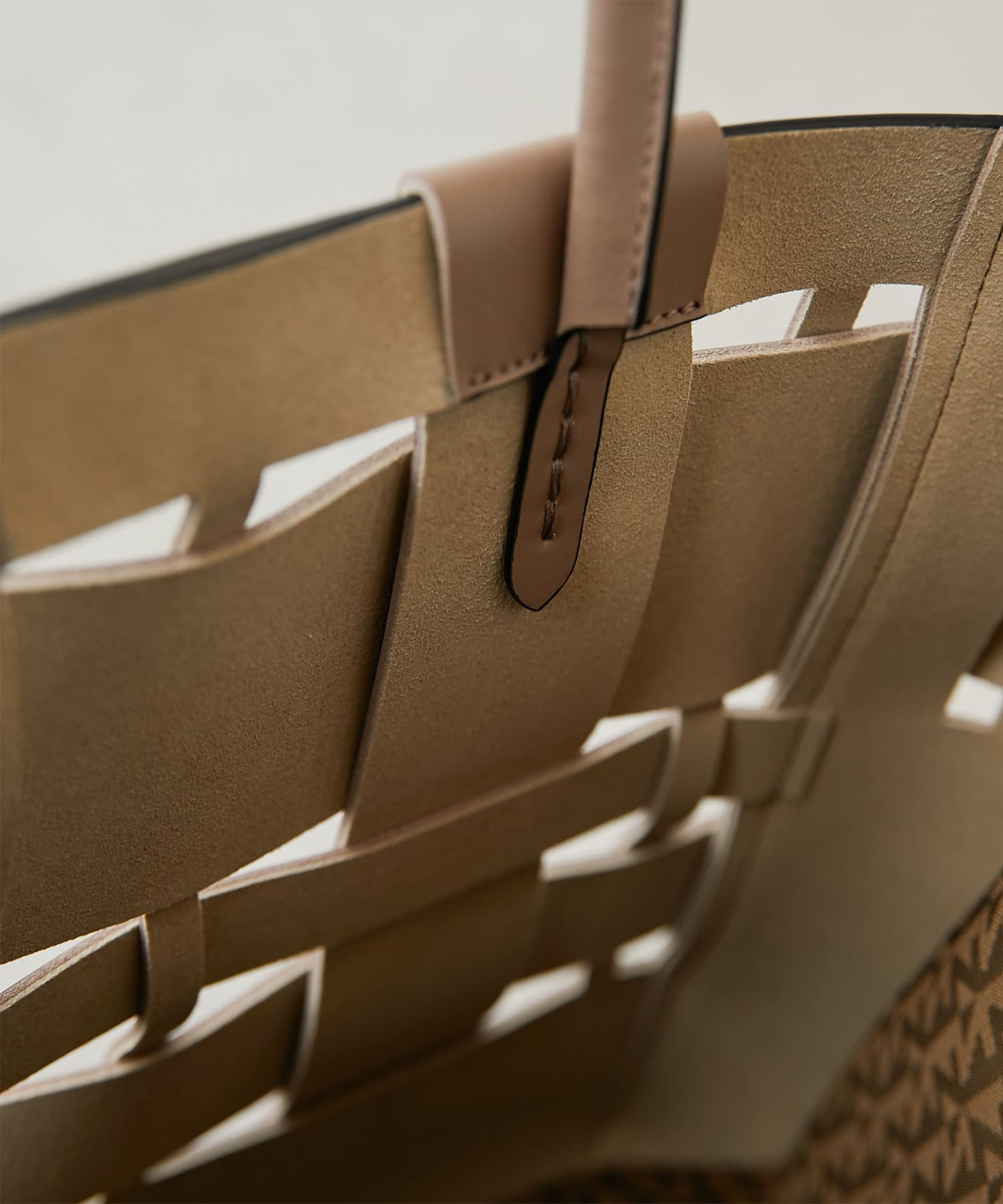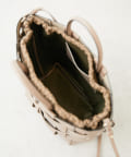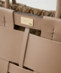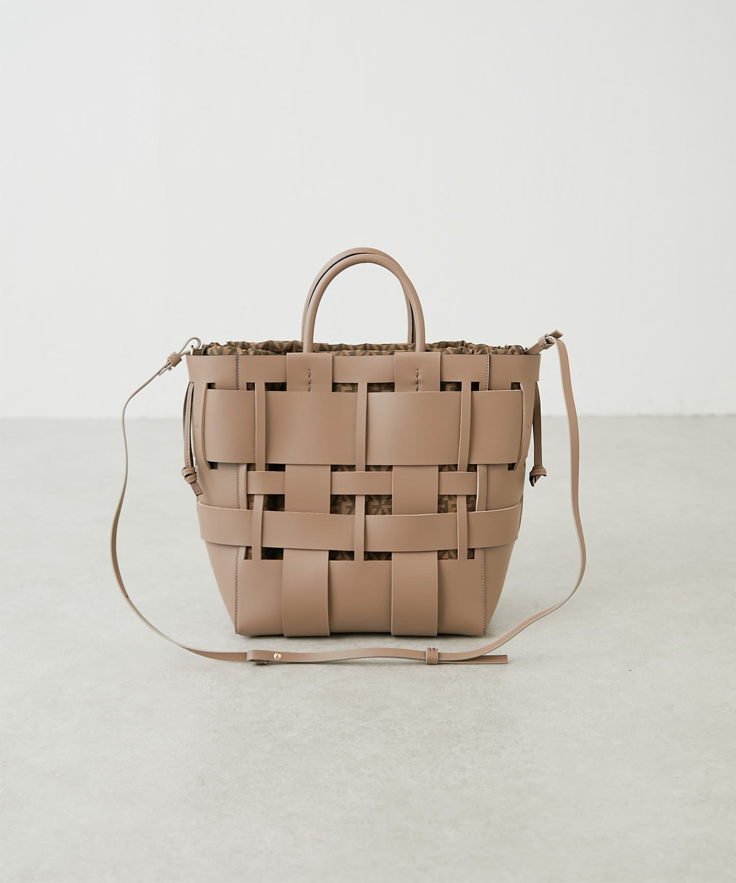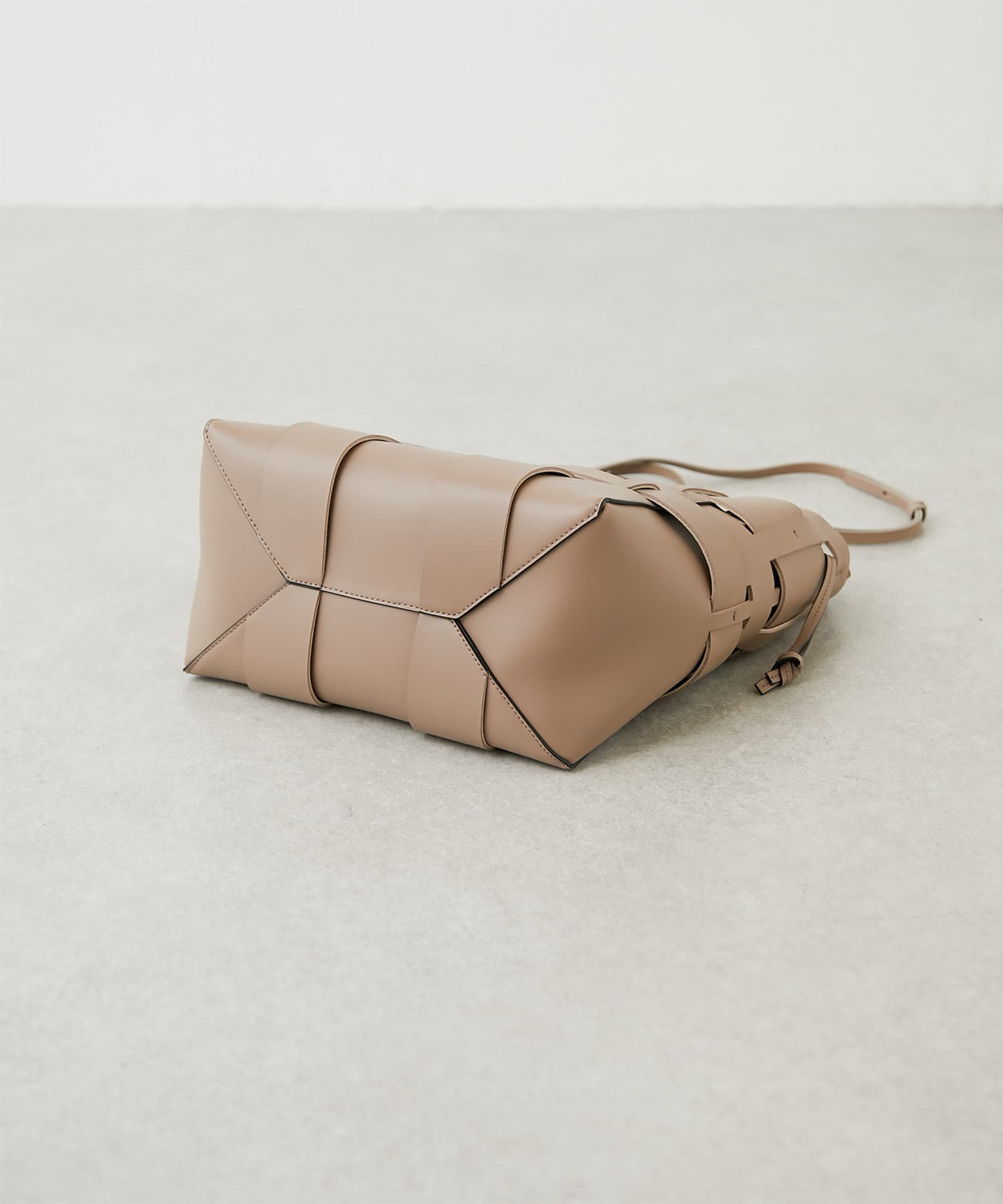 ■太めのカーフレザーを手作業で編み上げ、大胆なメッシュを描いたトートバッグ。