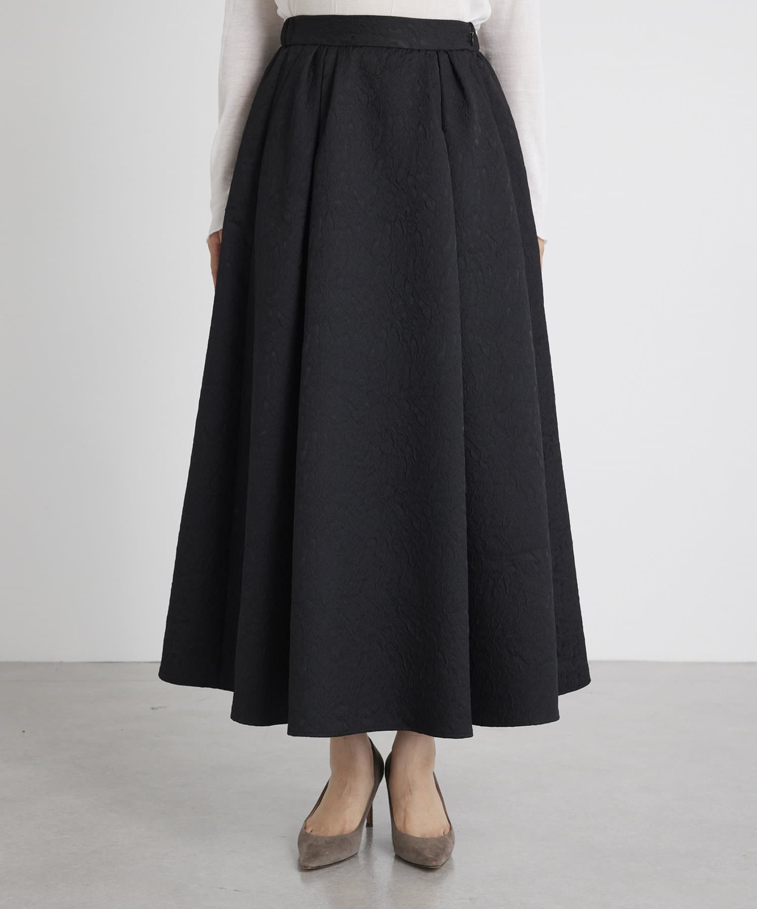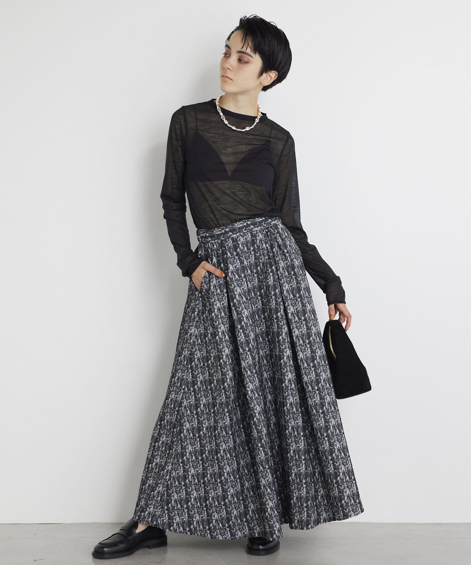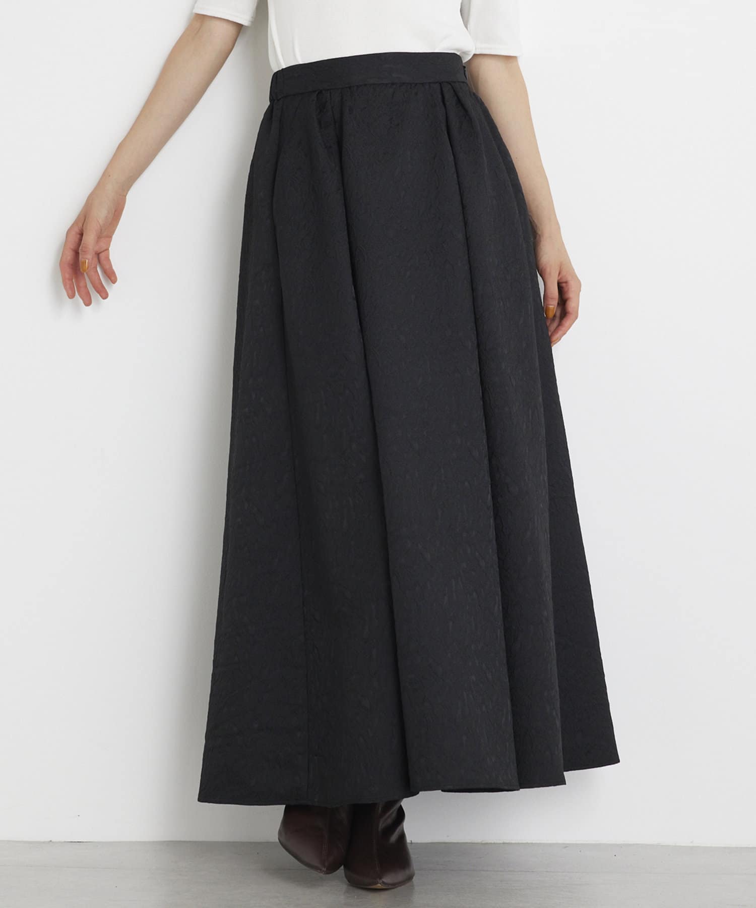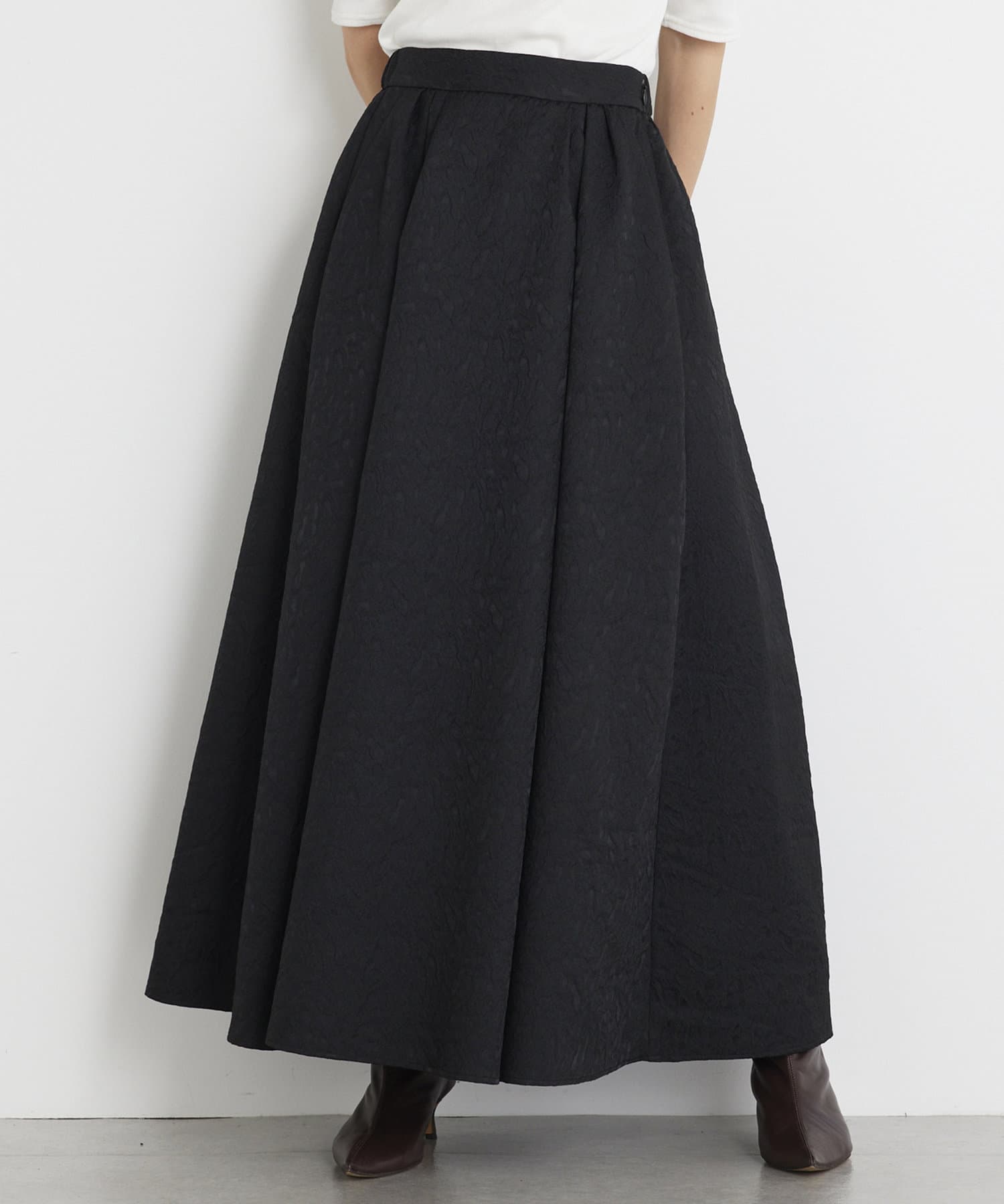 ハリを楽しむ上品なロングスカート。ジャガード生地が差をつけます。タックが入ることにより、より美しいシルエットに。一枚で着映えるスカートだと思います。シューズはフラットからロングブーツまで楽しめますよ。季節を問わず投入できます!