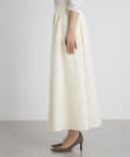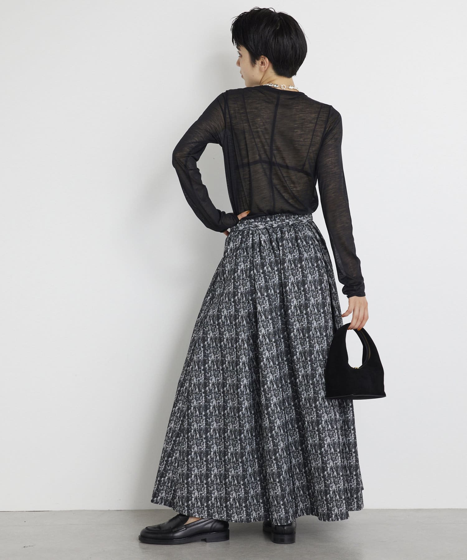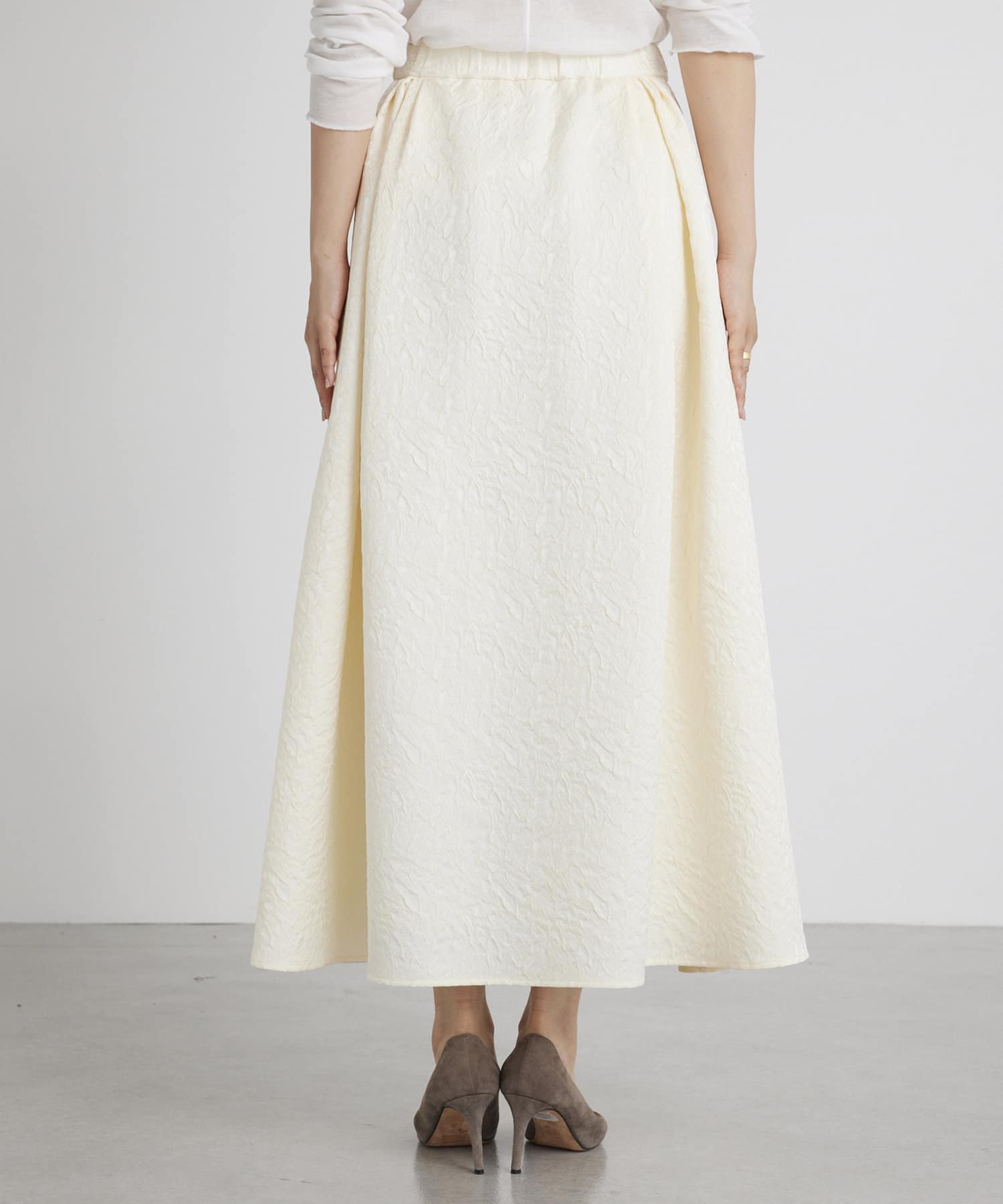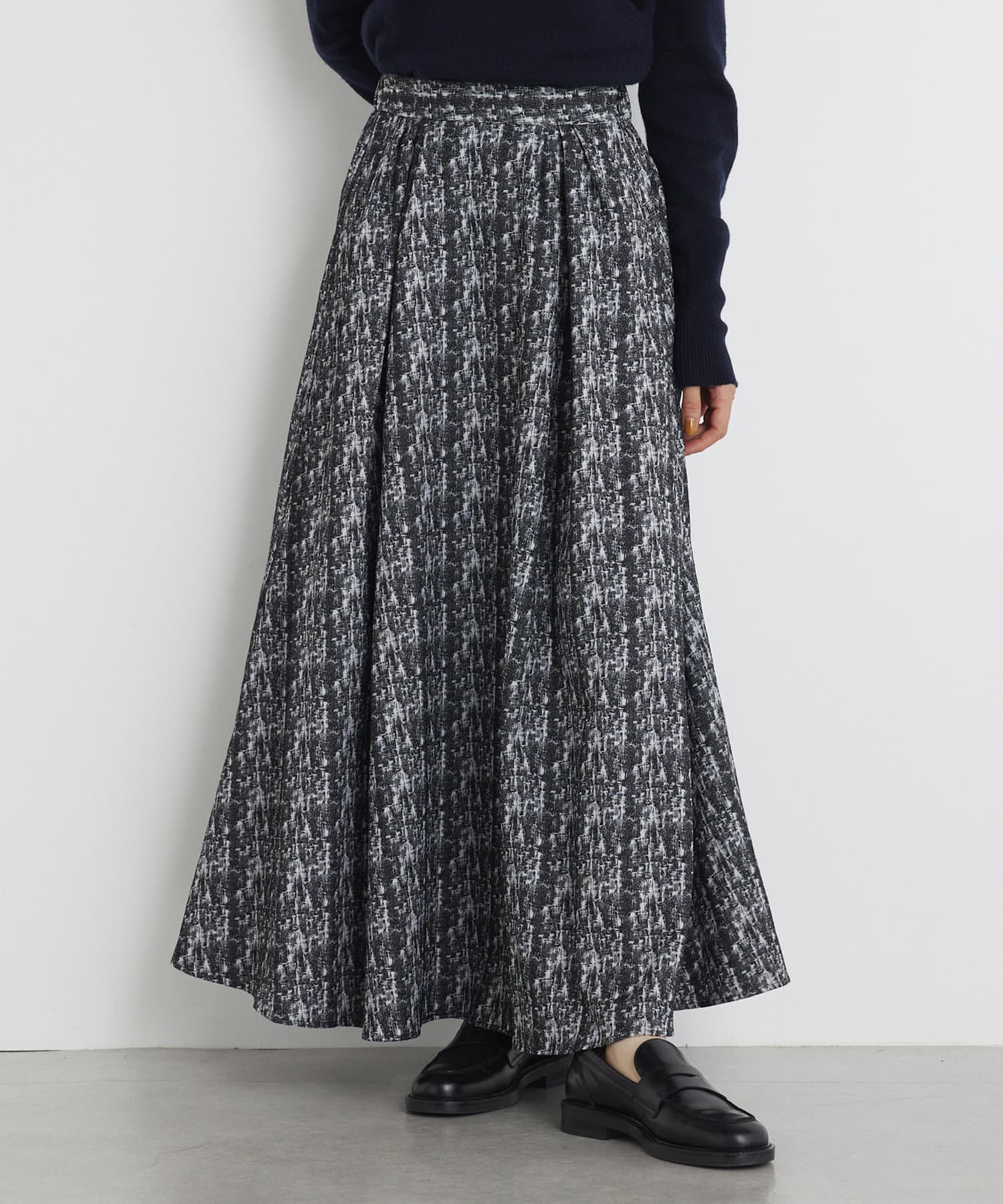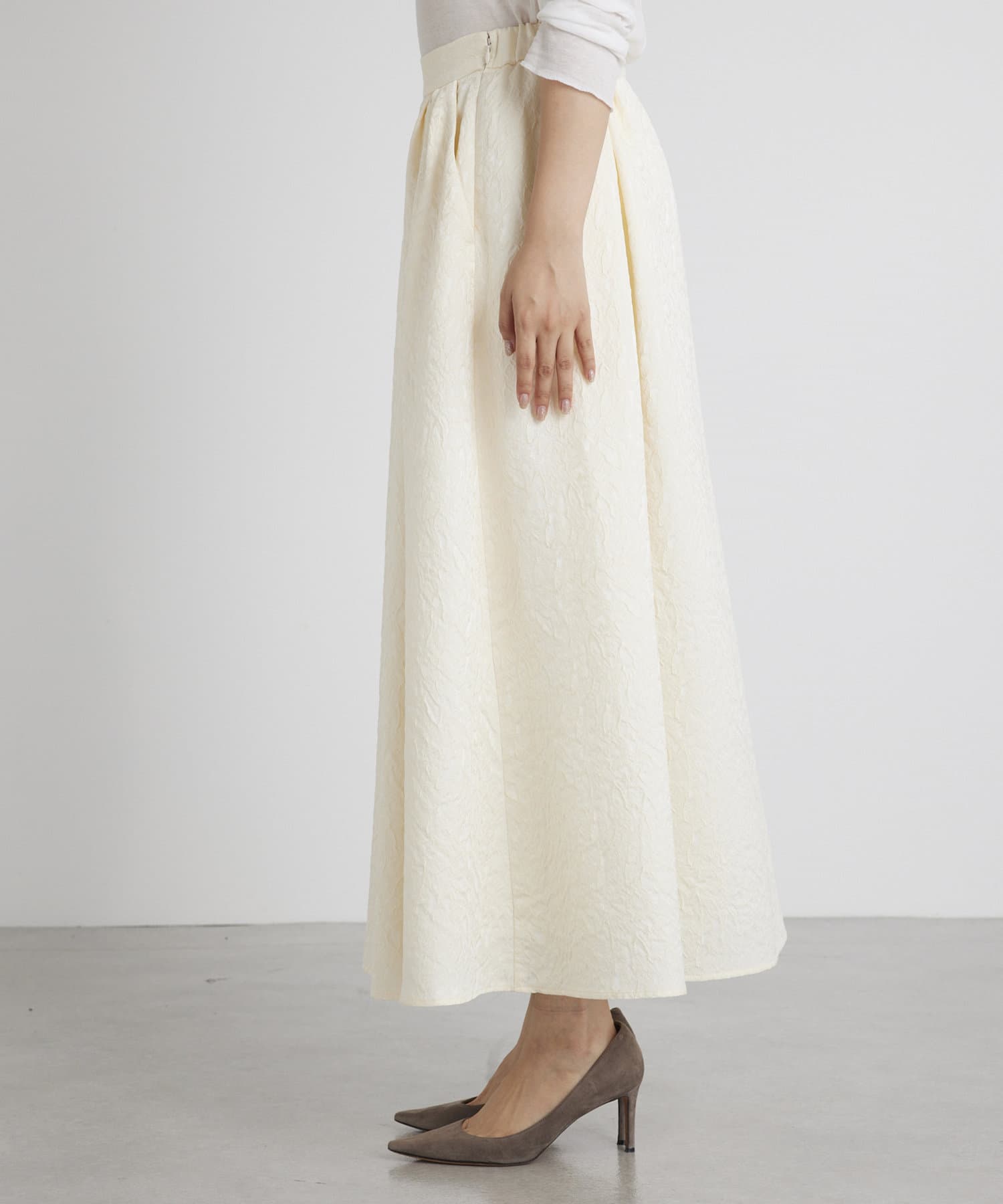 ハリを楽しむ上品なロングスカート。ジャガード生地が差をつけます。タックが入ることにより、より美しいシルエットに。一枚で着映えるスカートだと思います。シューズはフラットからロングブーツまで楽しめますよ。季節を問わず投入できます!